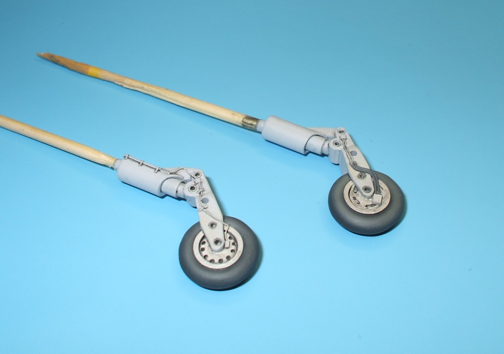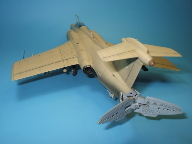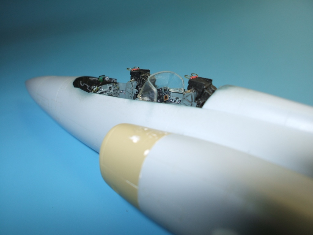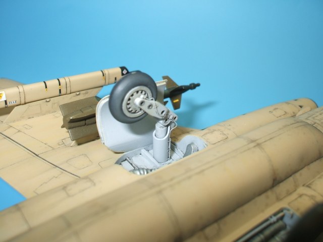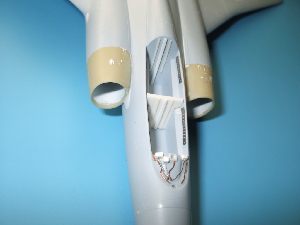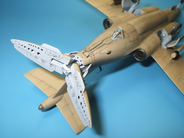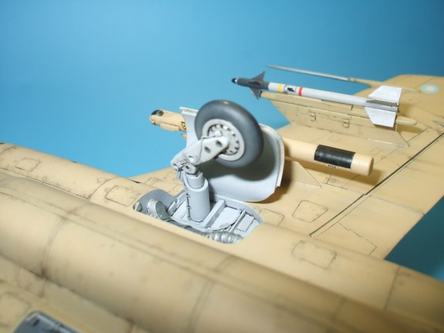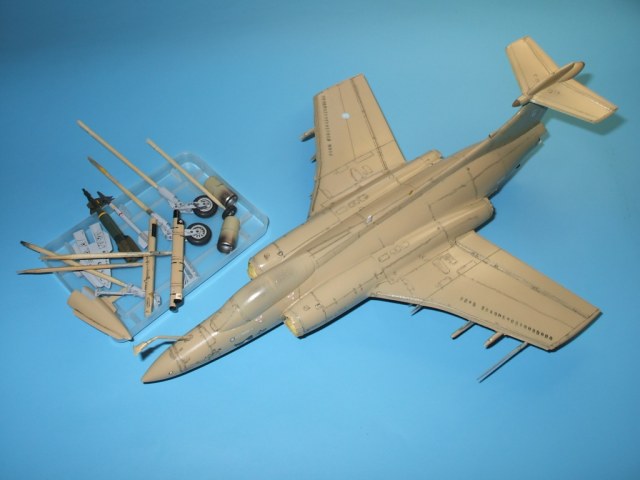 По замыслу заказчика «вгонять» в чертежи модель не планировалось, но уделить внимание некоторым узлам самолета было просто необходимо. Для этого заказчиком был предоставлен кое какой афтемаркет, а именно – смоляные кресла(производитель неизвестен), воздухозаборники двигателей со входными аппаратами и сопла двигателей от НеОмеги, цветная травленка от Eduardдля интерьера кабины и травленка от AirWavesиз которой использовались лишь детали для воздушного тормоза. Очень жаль, что не оказалось в продаже НеОмеговских ниш шасси и кабины, а также колес … Пришлось все эти моменты дорабатывать или изготавливать заново. Заново так же сделан фонарь кабины, за основу взят фонарь от Frog-овской модели так как он намного точнее. Большие доработки коснулись ниш шасси, стоек и колес, передних кромок крыла и воздушного тормоза, ракетно-бомбового вооружения. В принципе, я могу сказать, что на модели нет детали которая не подверглась бы доработке или замене. Писать подробно обо всех проведенных доработках не буду, да наверняка и упущу половину, лучше выложу больше фотографий сделанных в процессе работы и фото готовой модели в разных ракурсах и при разном освещении.