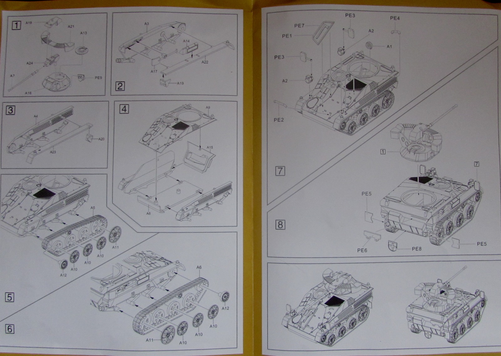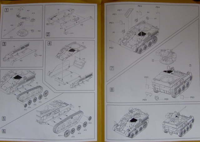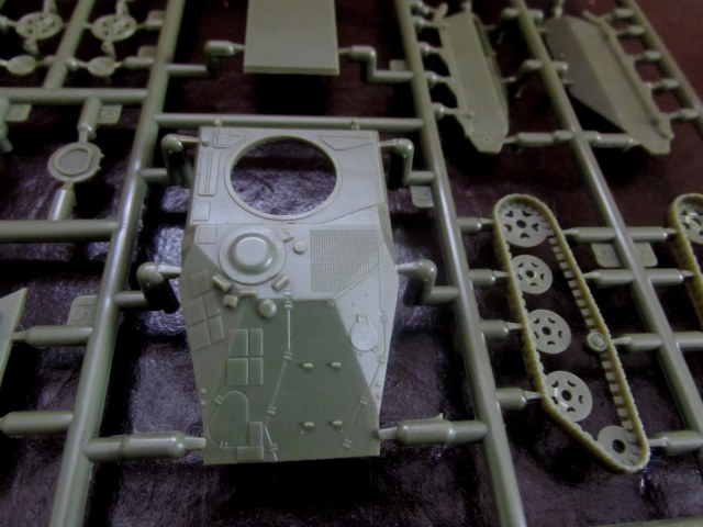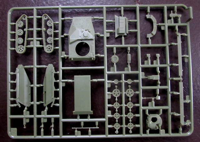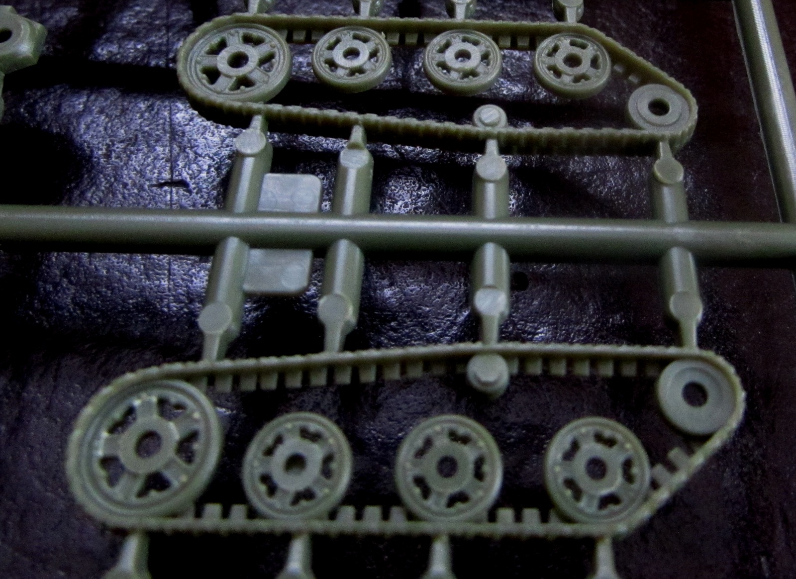 Литье традиционно качественное, местами есть микрооблой, но это не критично. Гусеницы также традиционно даны одной деталью, с микрооблоем по периметру - но есть и новое в членении и порядке склейки. Гусеничный моноблок сначала крепится на балансиры, и только потом фиксируется половинками катков и ленивцев.