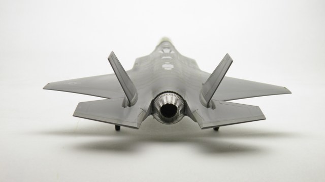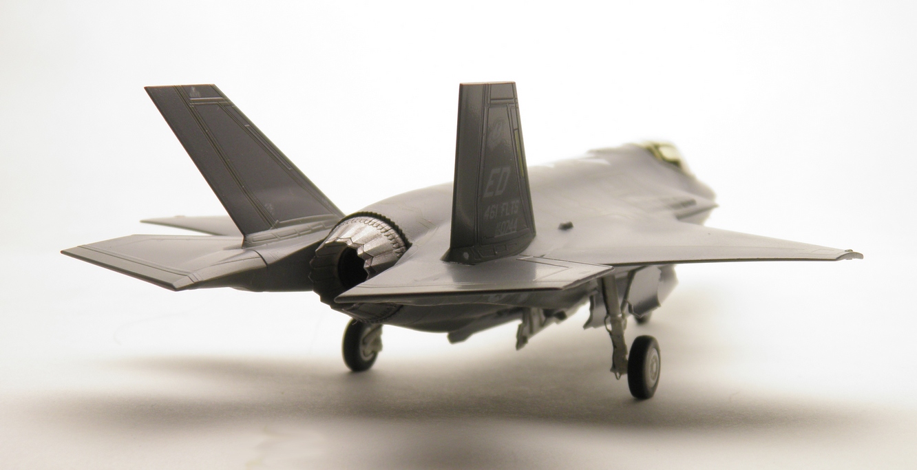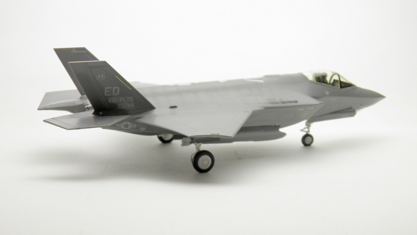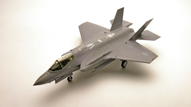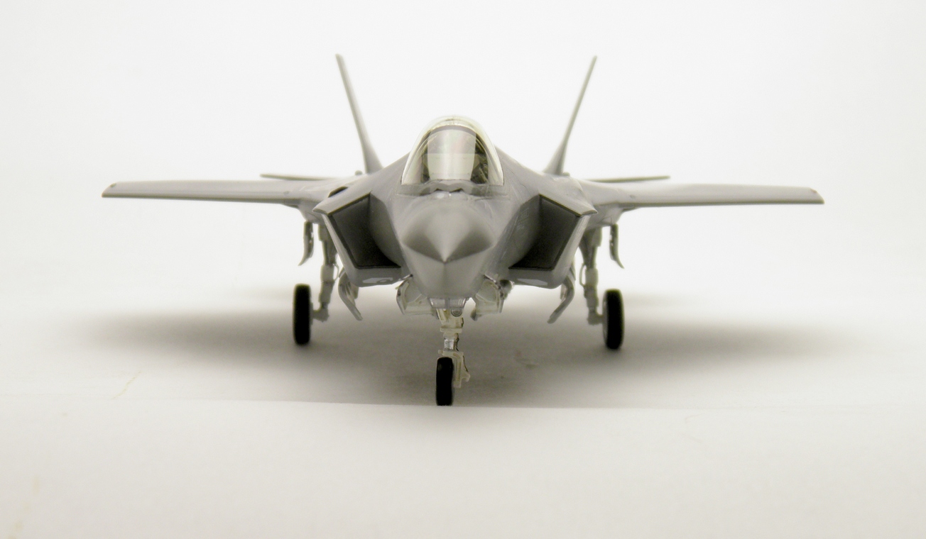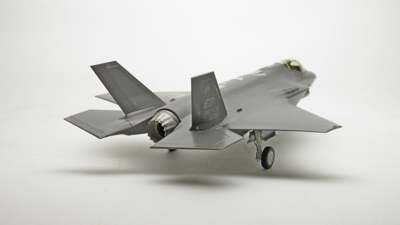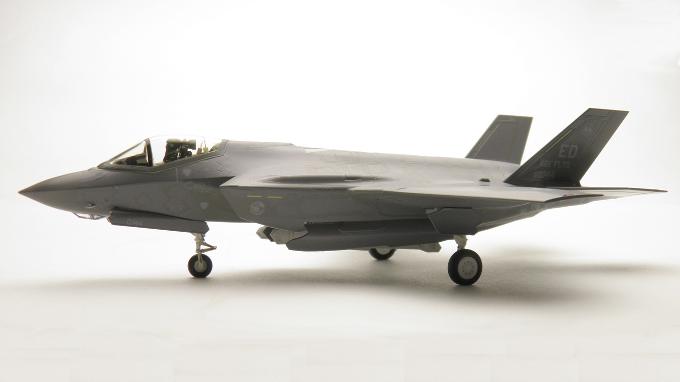 Приветствую уважаемое сообщество! Представляю на ваш суд свою крайнюю работу F-35A Lightning II от Academy. Самолет скандальный, безумно дорогой и, что-то мне подсказывает,что сильно много их в серии не будет. Поэтому интерес к данному аппарату у меня был. Набор был приобретен спонтанно (понравился арт на коробке) во время визита в магазин за красками. Почему-то сразу был поставлен первым в очередь и началось! Про сам кит есть подробная статья на скале, поэтому останавливаться на нем не буду. Что можно сказать? Пластик хороший, детализация вполне подробная для этого масштаба и декаль очень достойная. Читается техничка под лупой, что, наверное, говорит о ее высоком качестве. Я выбрал вариант борт 0744 тестовой эскадрильи авиабазы Эдвардс. Фоток этого борта в сети достаточно. Минусов кит почти не имеет. Стыкуемость на пятерочку. Единственно, что хотелось бы пожелать, наверное надо, чтобы кто-то очень добрый и хороший выпустил в качестве дополнения маски на этот кит, потому что красить все эти зигзаги то еще испытание! Была мысль сделать декаль, но решил красить, чтобы не утолщать все эти выпуклости, поскольку академовцы изловчились угадать с толщиной зигзагов. Маски делал так: фрагментарно закреплял на поверхности пищевую фольгу, прокатывал рельеф ватной палочкой, тащил на сканер. То, что получилось рисовал в редакторе, печатал на бумагу, вырезал ножом, сверху лепил прозрачный скотч, переносил на тамиевский скотч, еще раз вырезал и уже это была маска! Красил ганзой по инструкции, используя палитру Federal Standart (36231, 36118, 36375 + алюминий), так что за цветами - к производителю, ибо ориентироваться на фотки в сети не стоит, краска с добавлением серебра и под разными углами дает совершенно разные оттенки. Глядя на это видео http://www.youtube.com/watch?v=Kshe7-BYfWc я склонен считать, что скорее попал с цветом, чем не попал. Зигзаги на прототипах реально не такие пестрые, как иногда их рисуют. Фотки в редакторе, возможно, пересветлил, но это, чтобы лучше видно было. Реально модель темнее. Доработок немного: БАНО, ниши, стойки. Тонировка фонаря - футура с йодом. Больше там нечего дорабатывать, ИМХО. Лак глянцевый ганза, матовый тамия. Пробовал смывку, не понравилось - убрал, потому что сильно "ушатывает" новенький самолет. Оставил только чуть-чуть в нишах. К приему табуреток готов!