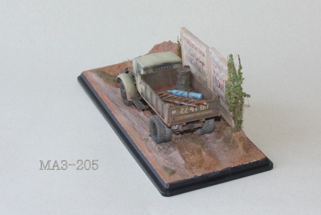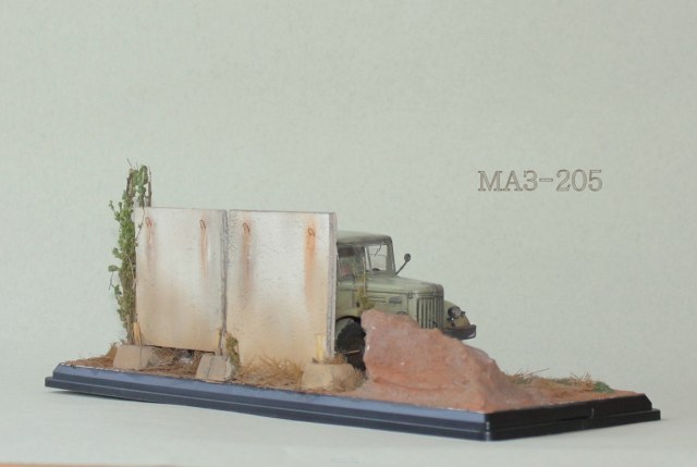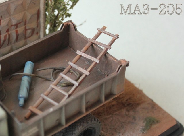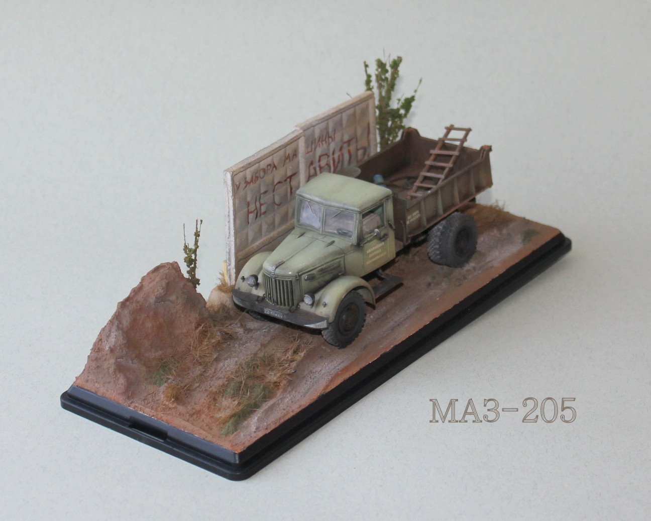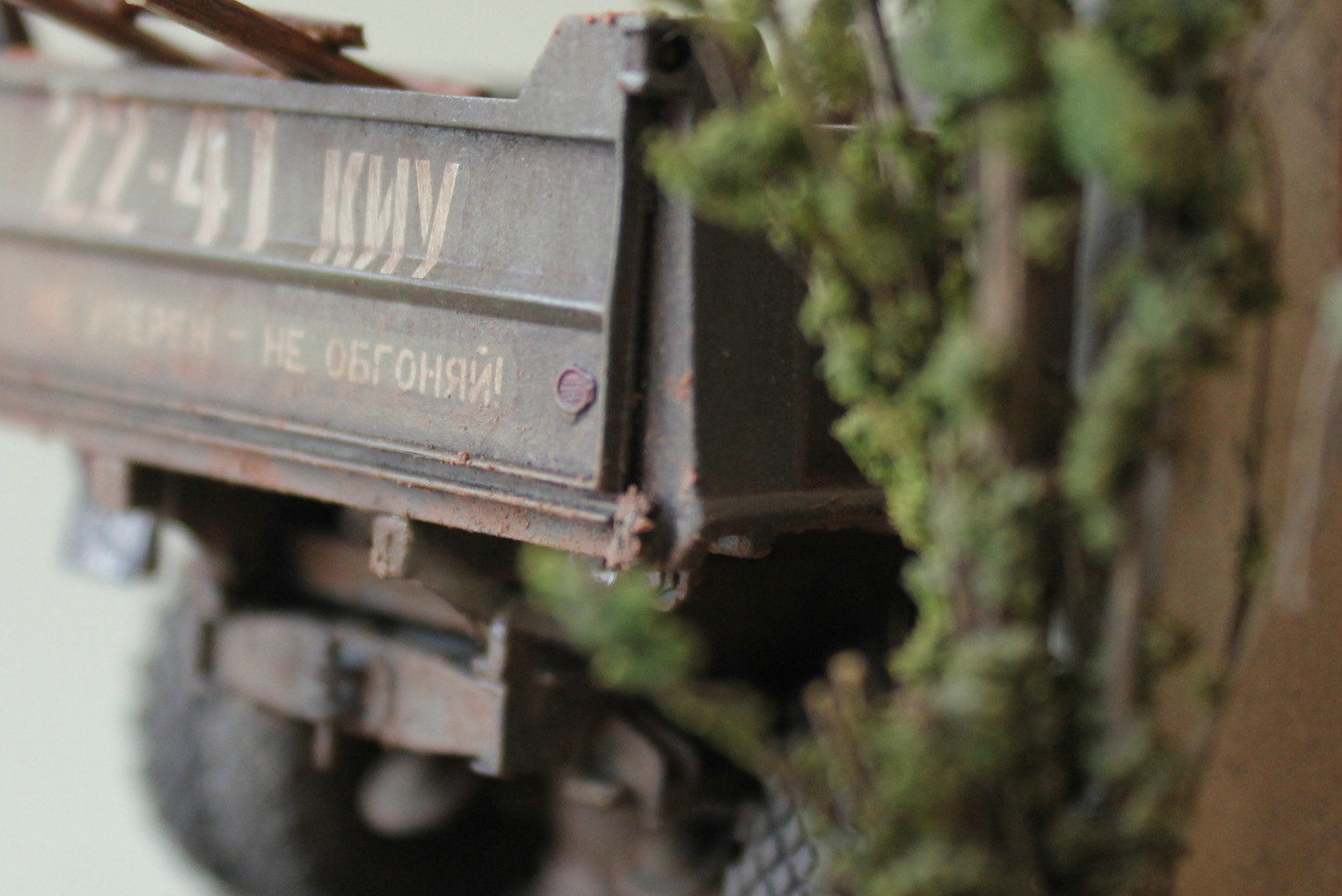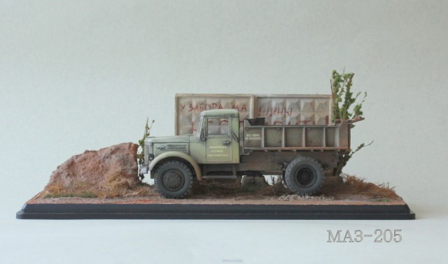 Сделать просто самосвал,было скучно (не люблю чистые модели в коллекции).Так и просилась какая-нибудь виньетка.Цвет кабины выбирал на глаз, методом выделения зелёного среди зелёных (что бы не сливались все в одно пятно на полке).Работа делалась под настроение,за несколько вечеров.Виньетку выполнил в боксе ССМ.