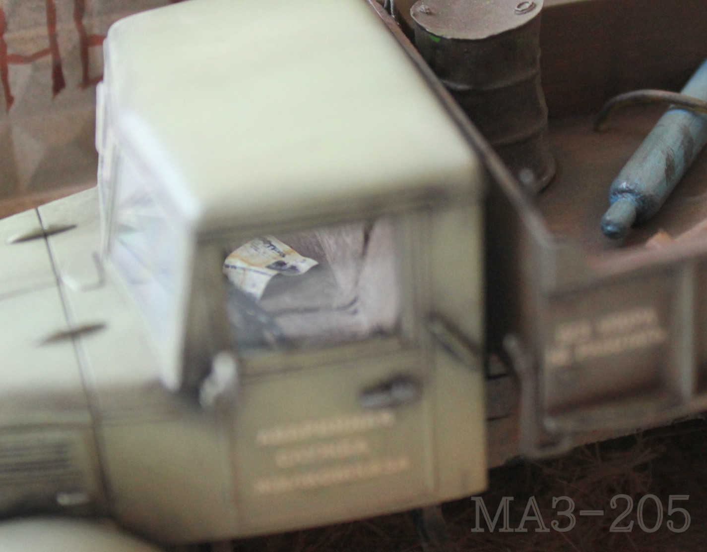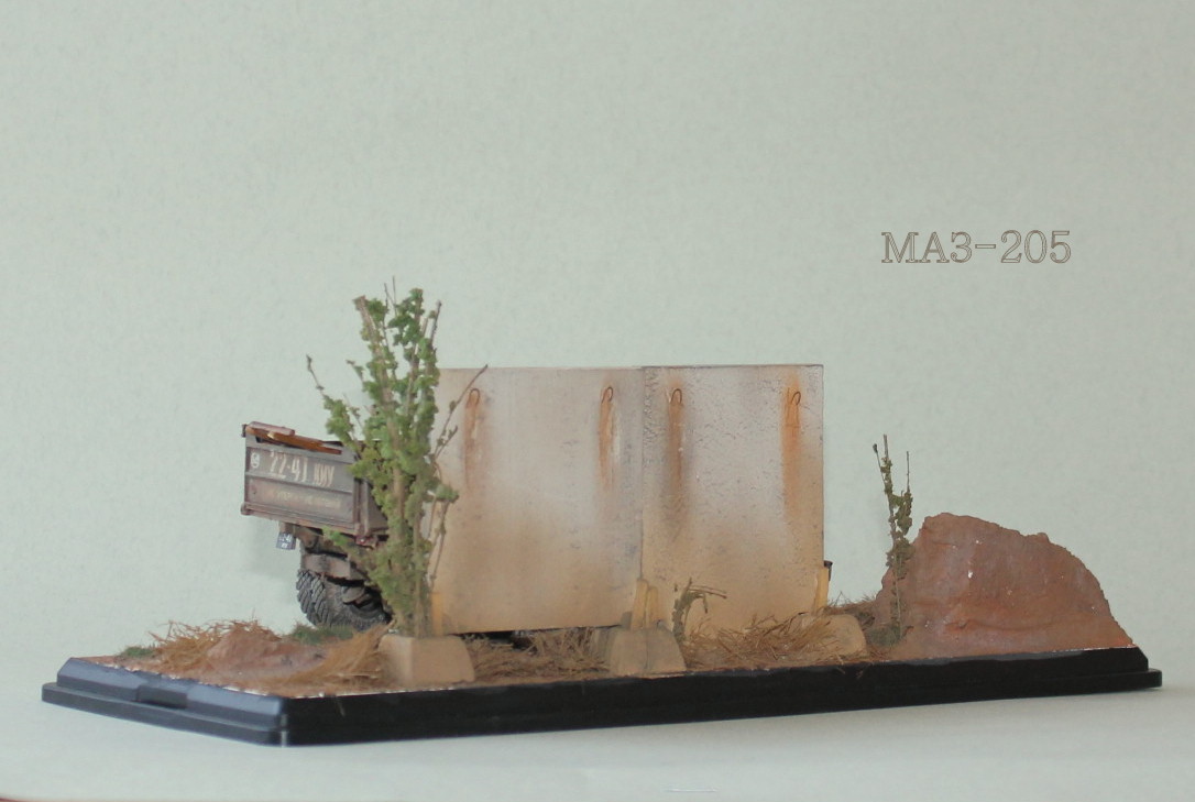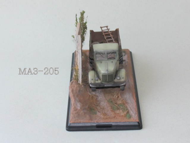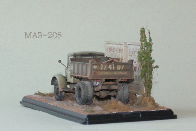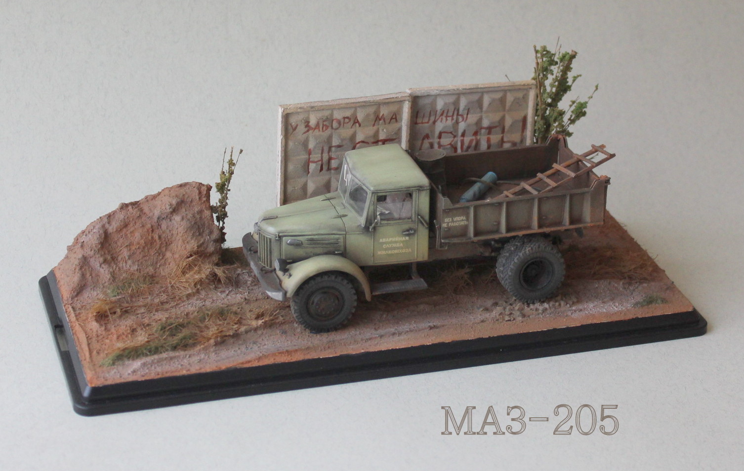 Сделать просто самосвал,было скучно (не люблю чистые модели в коллекции).Так и просилась какая-нибудь виньетка.Цвет кабины выбирал на глаз, методом выделения зелёного среди зелёных (что бы не сливались все в одно пятно на полке).Работа делалась под настроение,за несколько вечеров.Виньетку выполнил в боксе ССМ.