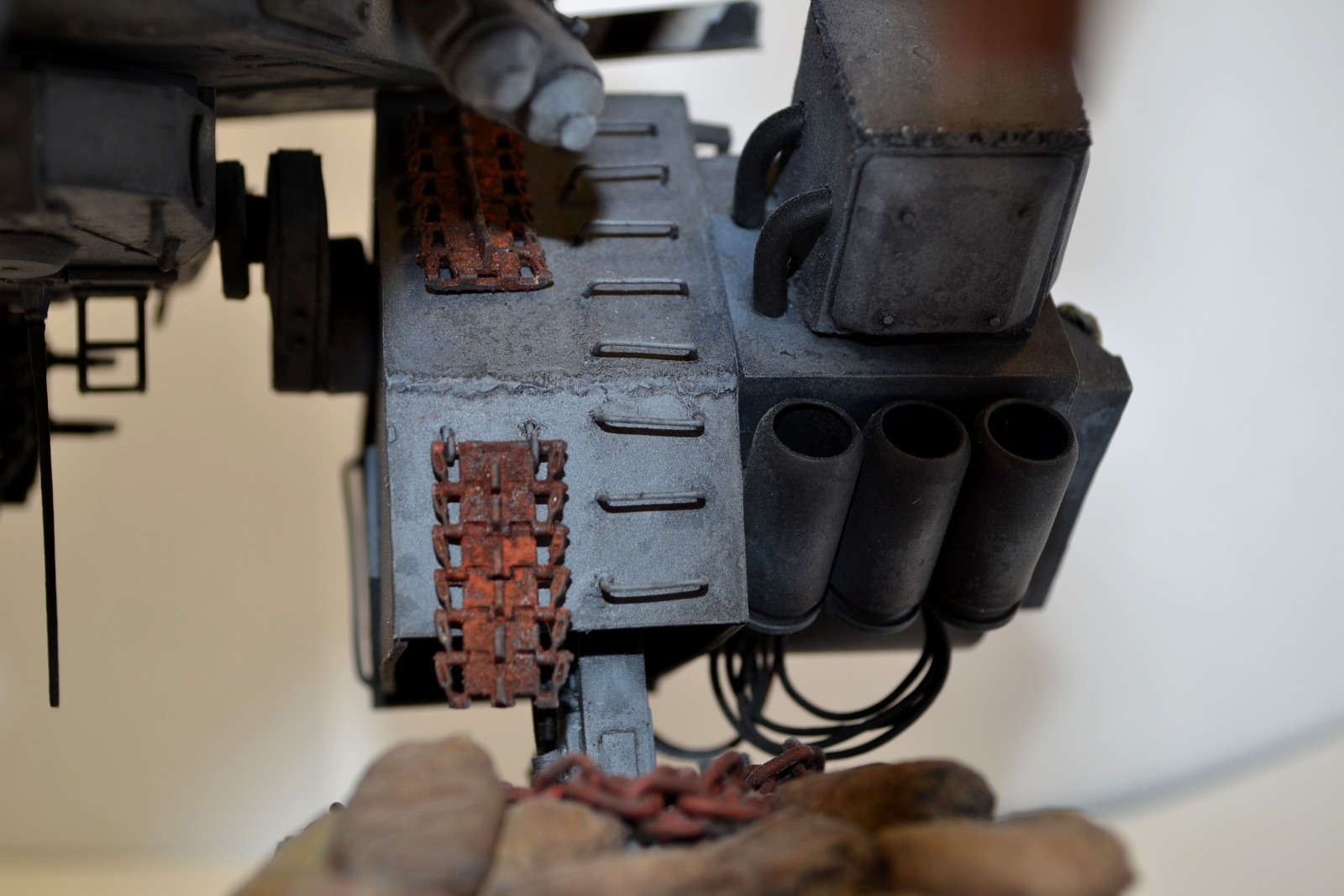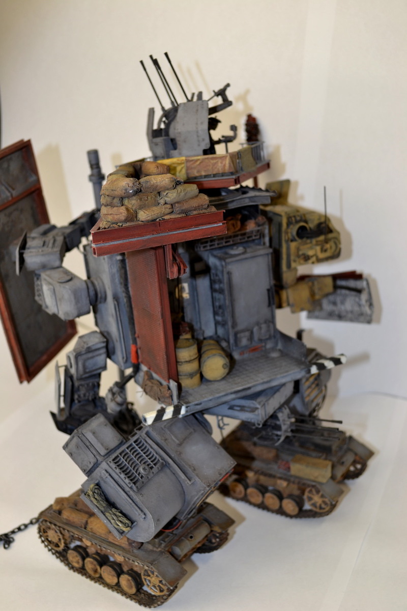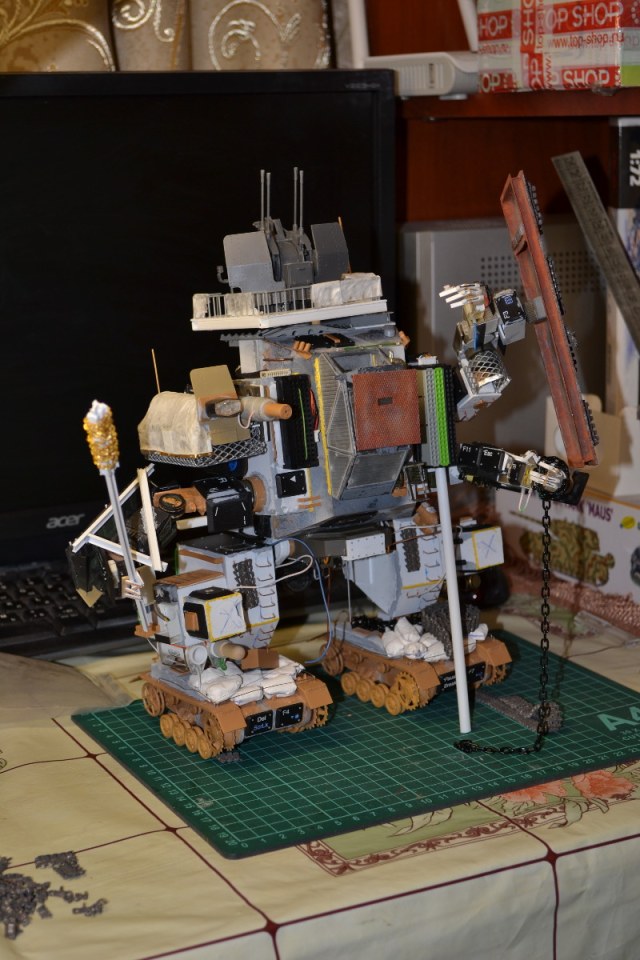Данная модель собиралась очень долго, несколько раз была переделана. Первоначально планировалась множественная электрификация подвижных узлов и агрегатов. В процессе сборки очень намудрил с центром тяжести и суставными частями. В результате большую часть (особенно нижних) конечностей пришлось склеить намертво. Из «электрических фишек» остался только действующий фонарь на правой верхней конечности робота.