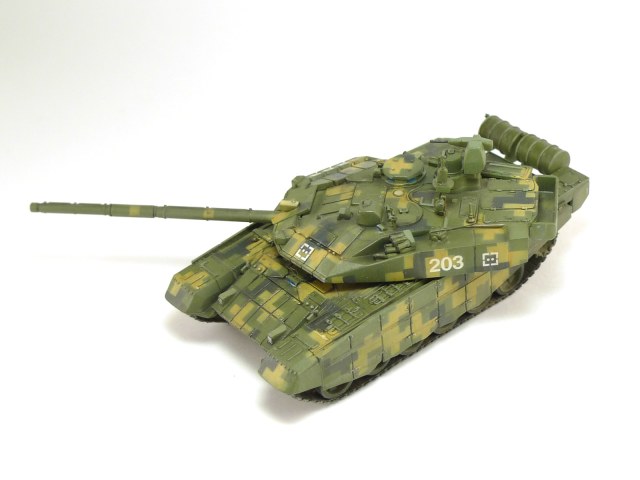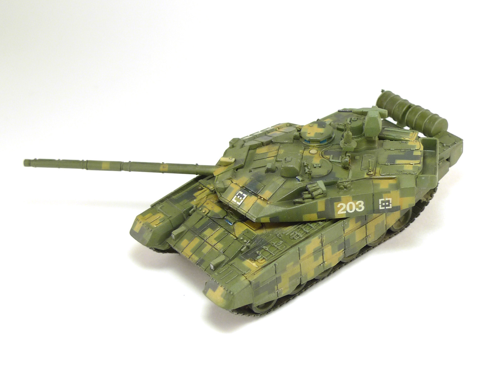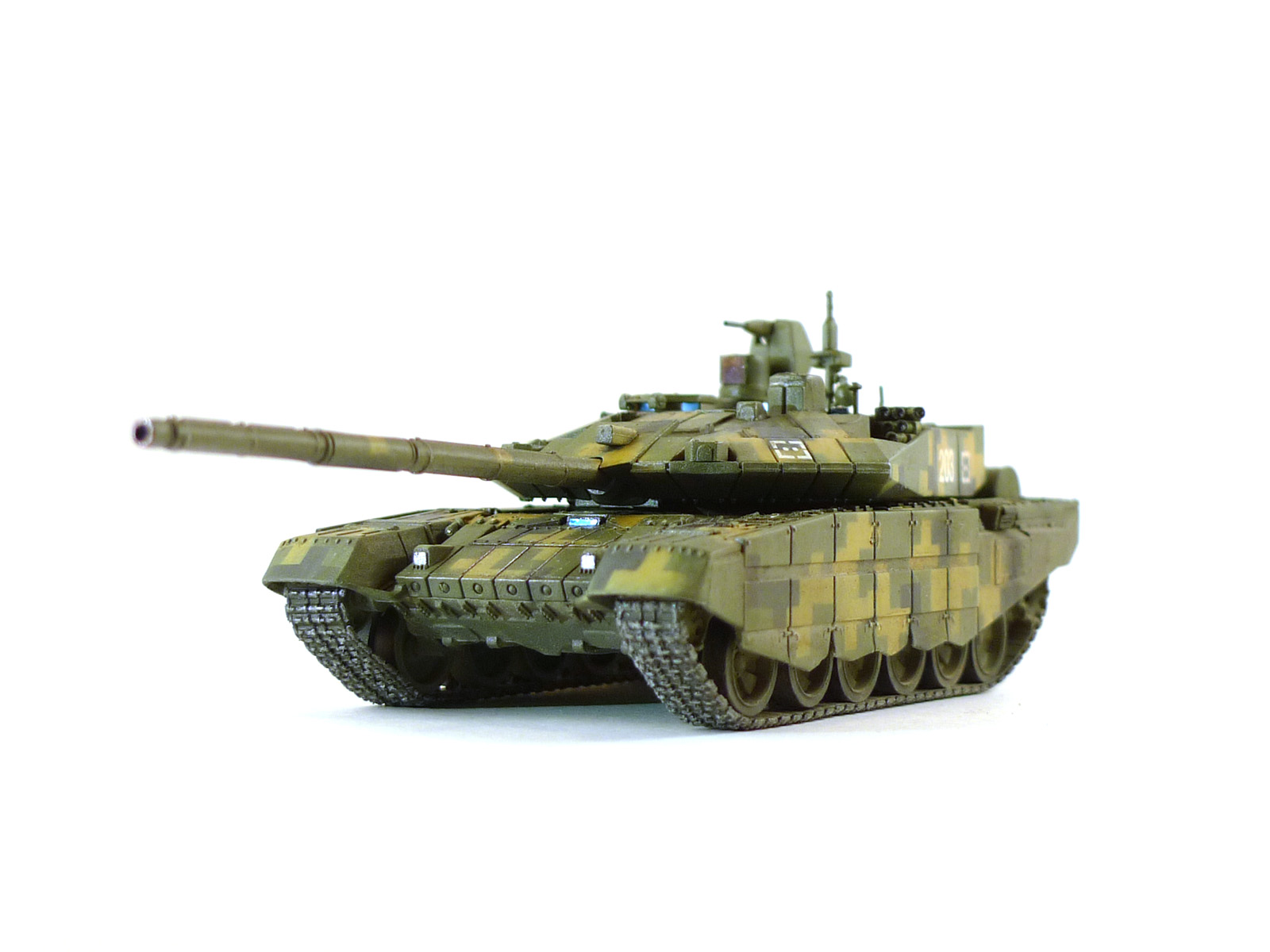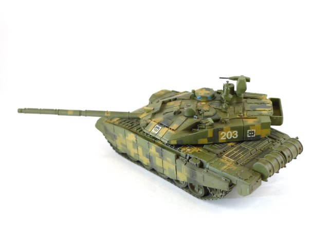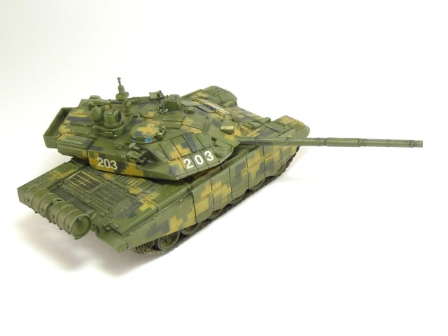 Изкоробка, даже недокоробка. Набор особым качеством не блещет, в частности башня (есть утяжины, да и детализация несколько замылена), резиновые гусеничные ленты деформированы. Кумулятивные экраны из набора похожи на что угодно, только не на себя, поэтому решил их не ставить совсем. Опитика - елочная мишура, камуфляж делал с помощью трафарета.