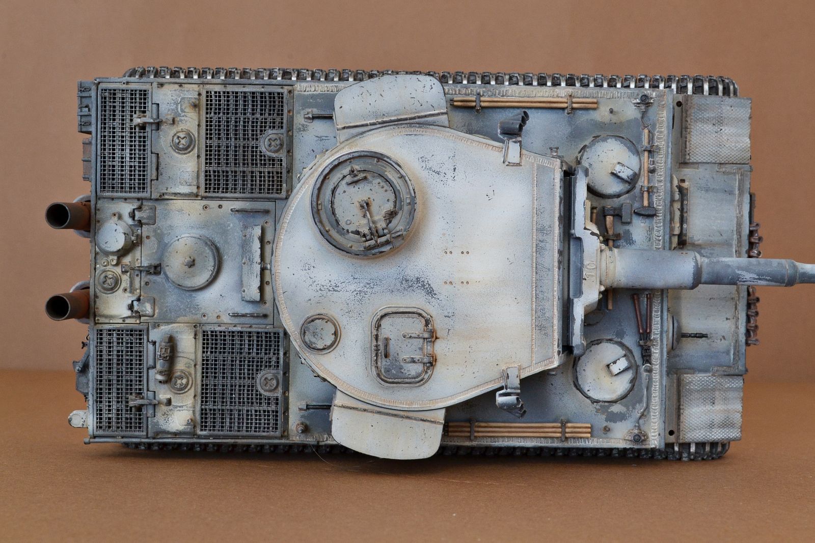 красивая сотка, видно, что изучали прототип, но грязь как-то странно лежит, на бортах ровная полосочка, а катки чистые совсем, в общем подтонировать нужно, чтоб не было такого резкого перехода грязи к чистому корпусу, катафот больше на ржавчину похож, и ещё, направляющие рымов бронировок глушителей следовало зашпаклевать, ствол стоит чуть вниз и вправо, видно по неравномерной щели между кожухом и стволом