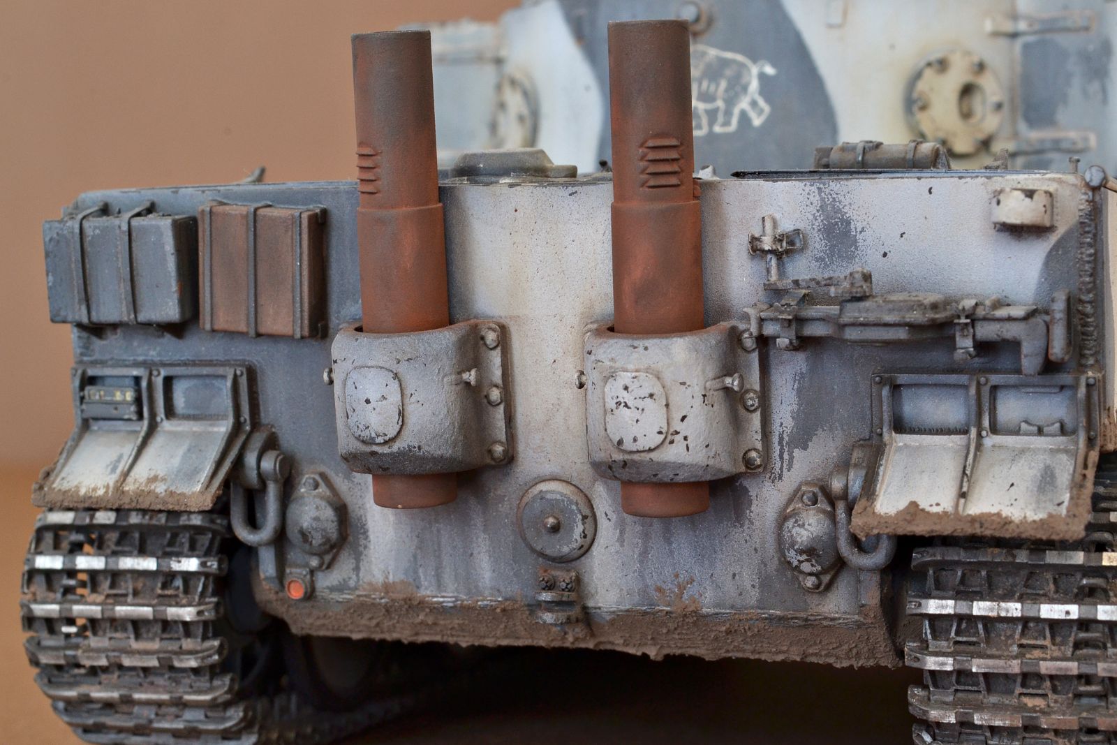 Камуфляж прям по фото делал, такой он и был, а траки, самому странно, одевал внатяг, а потом они как будто ослабли. Первый опыт с металлтраками, может и комом.