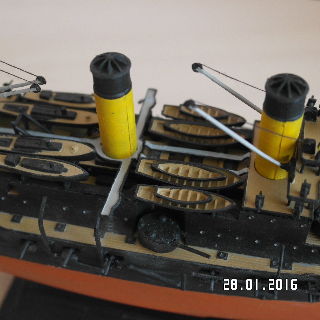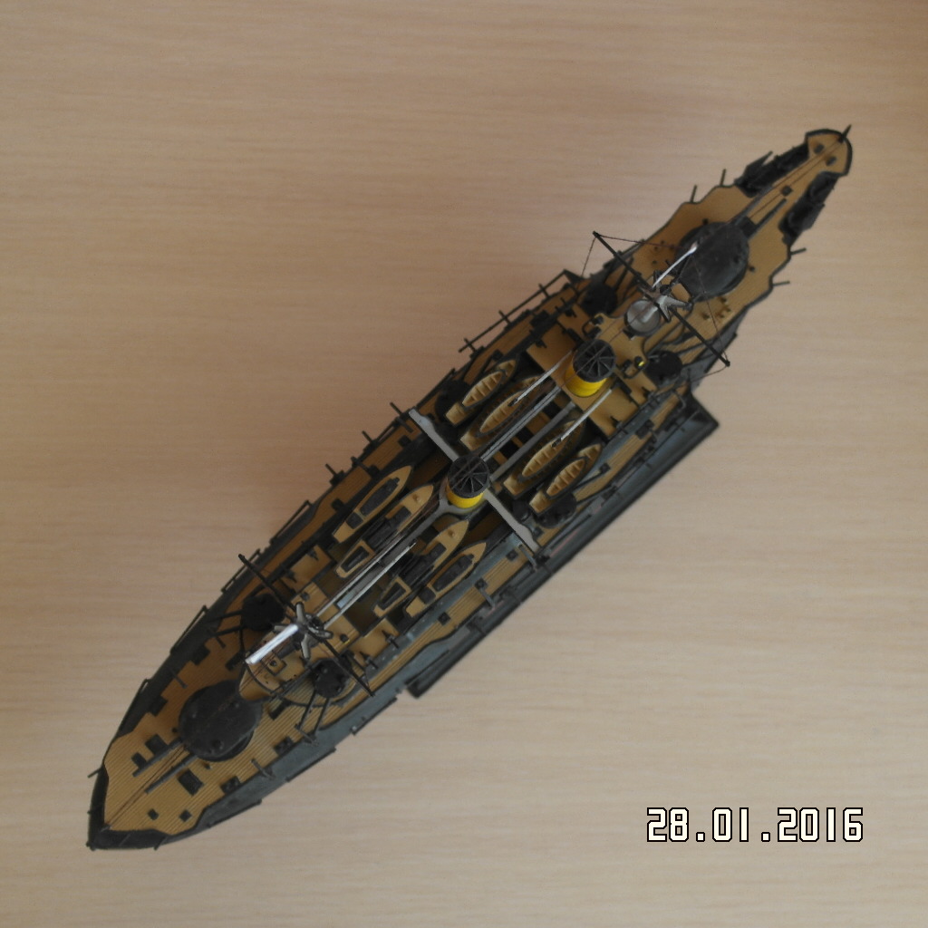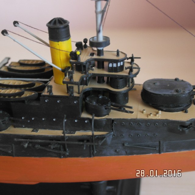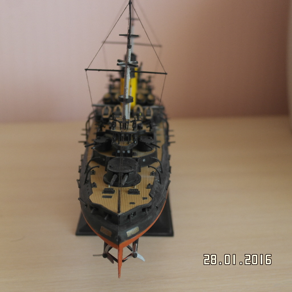 К перечисленным выше замечаниям прибавлю и своих немного. Стволы орудий главного калибра можно высверлить. Если получится, то и стволы среднего калибра тоже. После по срезу ствола пройтись карандашным грифелем для придания металлического блеска. Кнехты покрасить в черный цвет. При вырезании флагов черный контур надо срезать. Иллюминаторы докрасить, раз уж вы решили их выделить. Стекло прожекторов я бы покрасил в серебро (в желтый цвет как-то не очень смотрится). Ну и щели, как уже сказали, надо шпатлевать. Ну это уже на следующих моделях.