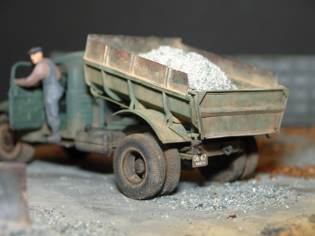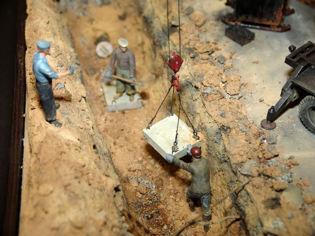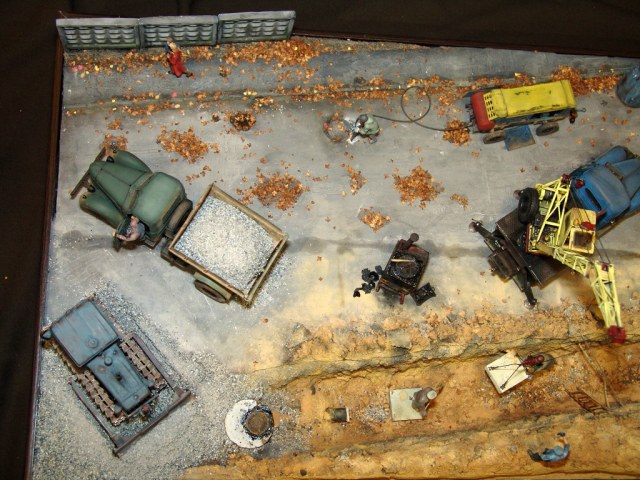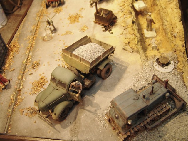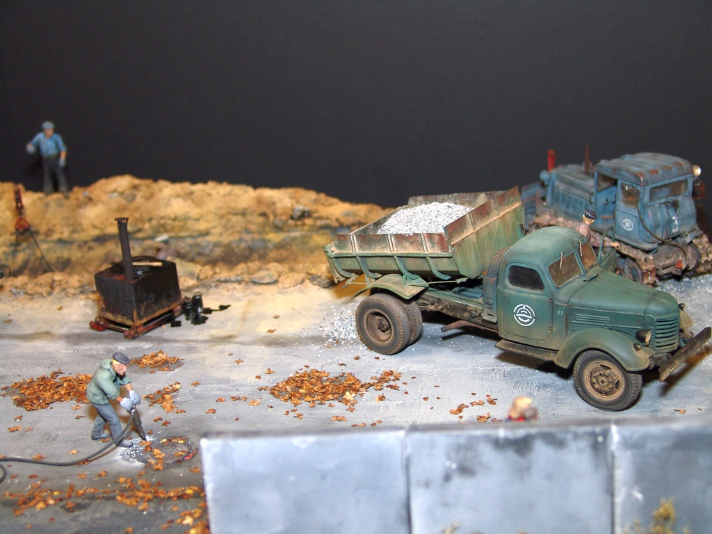 Идея диорамы созрела давно, однако некоторые технические моменты постройки были непонятны и диорама все время откладывалась. Со временем опробовав несколько новых технологий, решил все таки начать постройку, тем более техника была сделана уже давно. Все модели на диораме самодельные, фигурки тоже переделки различных наборов, одна фигурка от Сталинграда, крышки люков от Red Iron, краски Тамия, масло, темпера, пигменты художественные, МИГ, пастель сухая и т.д.