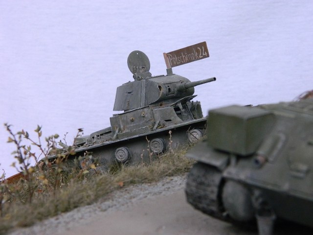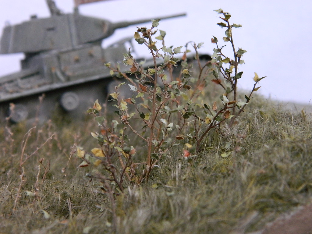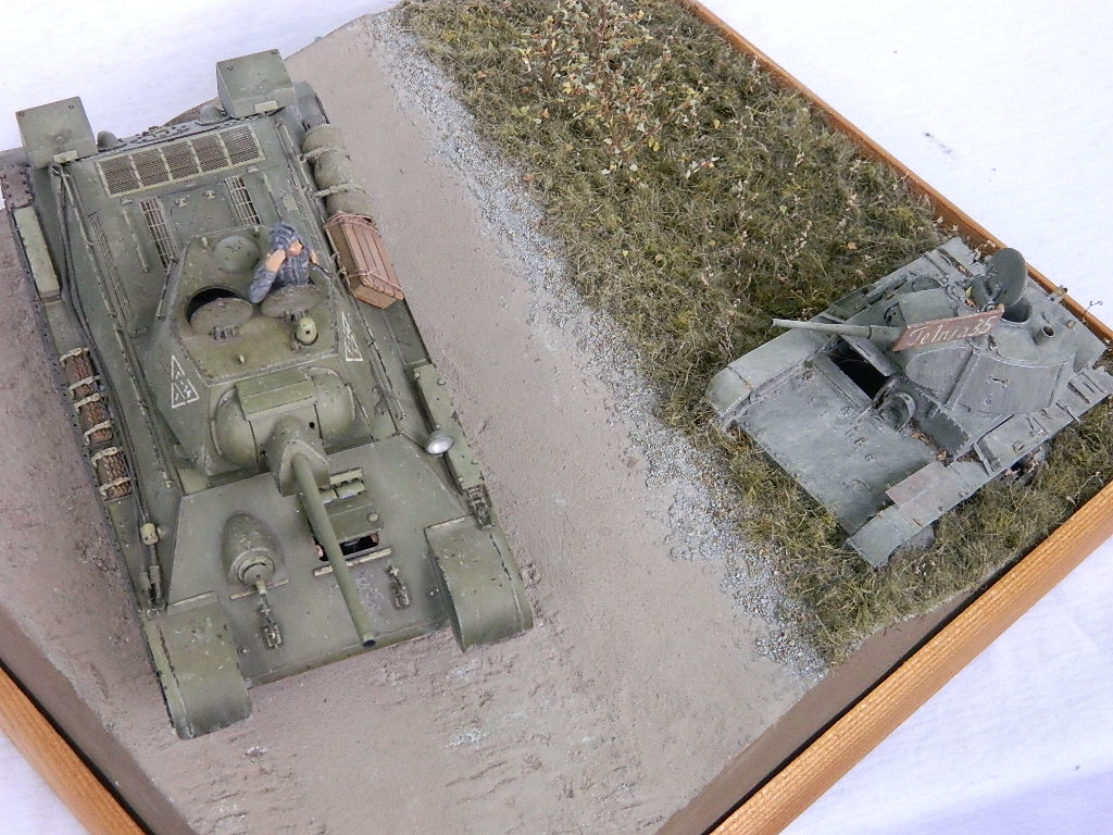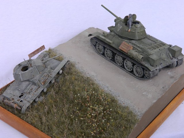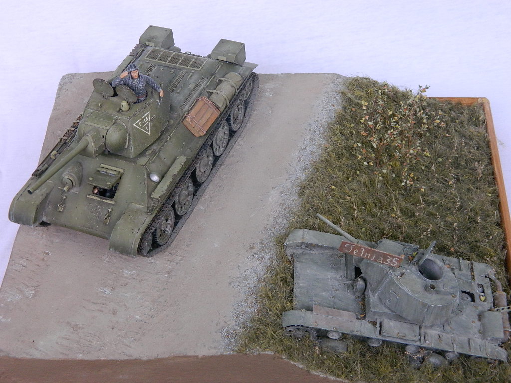 Основание гипс и плиточный клей,трава сантехлён,кусты из веточек,листья из обёрточной бумаги.Т 34 от AFV с интерьером выставлялся мной отдельно;Т-26 от Звезды,башня смола.Окраска Тамия,пигменты Уайлдер.