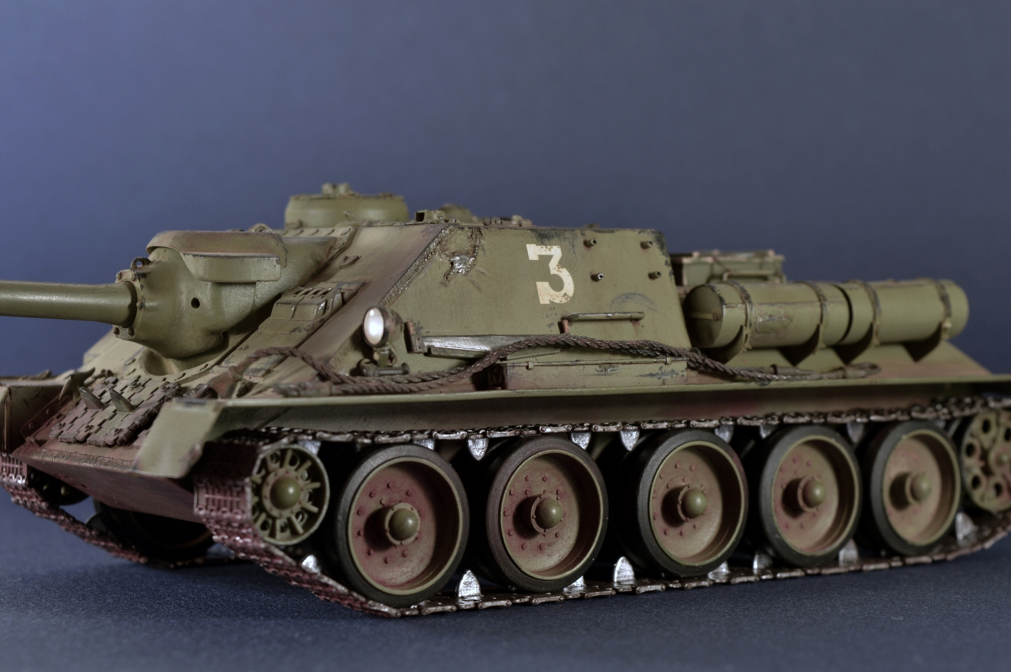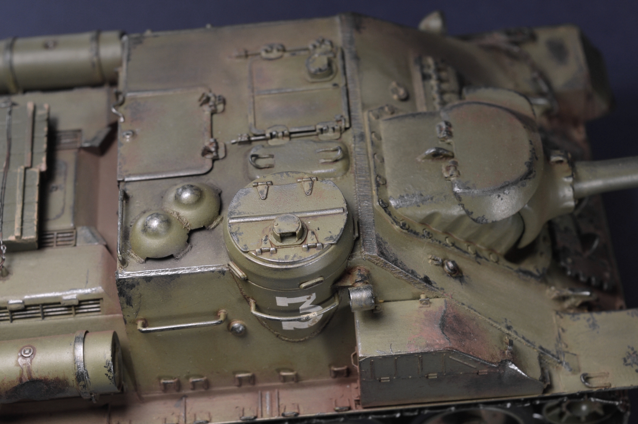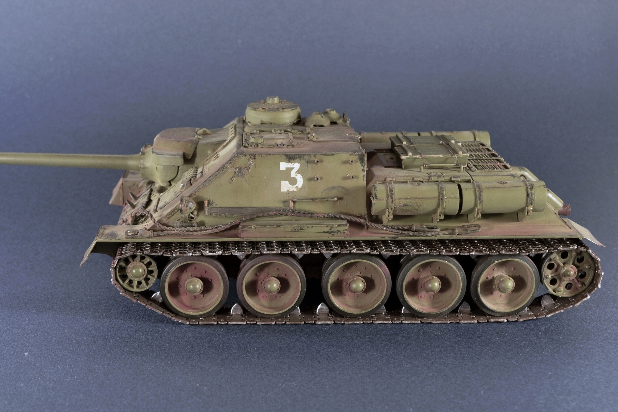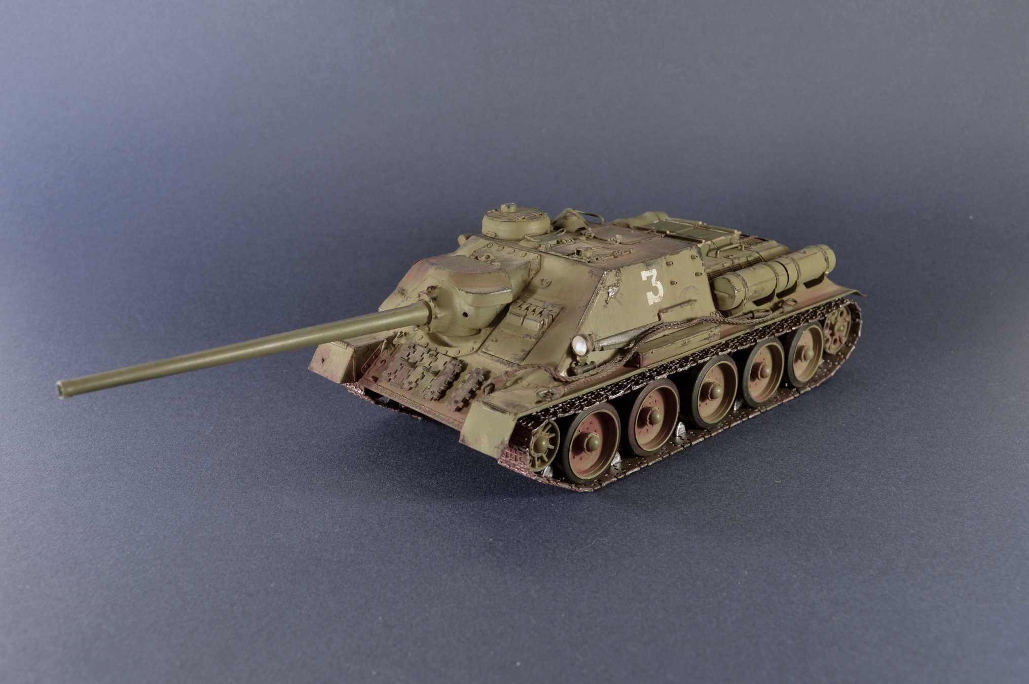 Но косяк в том, что - "Реальная машина, возможно, поучаствовала в штурмах пригородов Берлина в апреле-мае 1945г." с данной балкой машина не могла принимать участие в штурме Берлина, бо такая модификация появилась в только в июне 1945 года. Разница в том, что основа первых Соток - Су-85 (Т-34/76), а с июня 45-го их начали делать на базе Т-34/85, а там другая балка, и как следствие - нивилирована ступень между верхним бронелистом и балкой. Собсно фото машины первых выпусков - прилагаю, стоит в нашем музее.