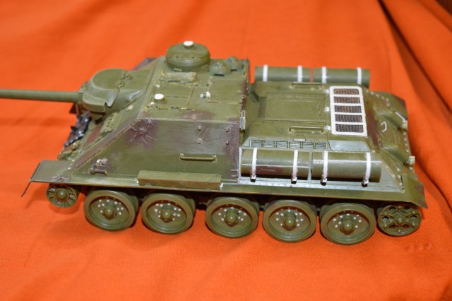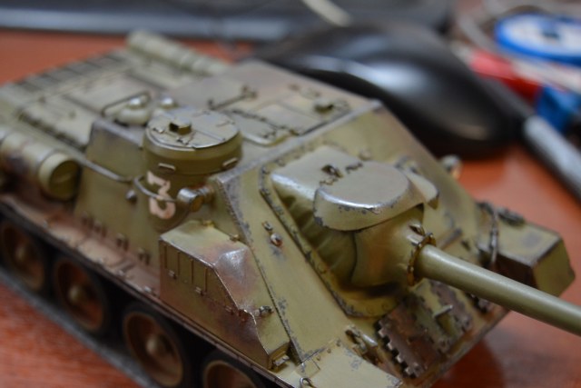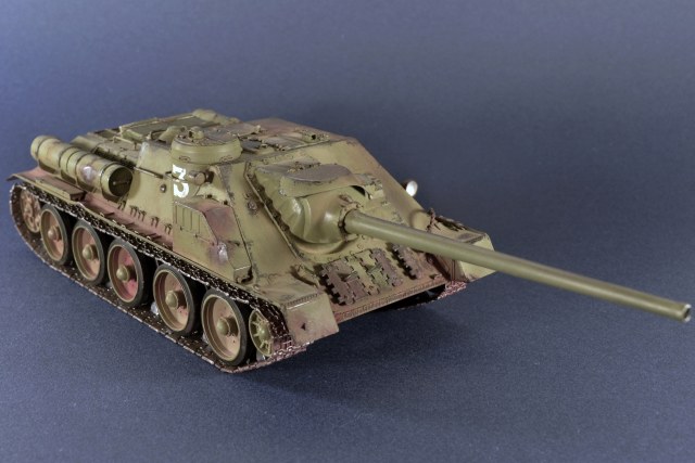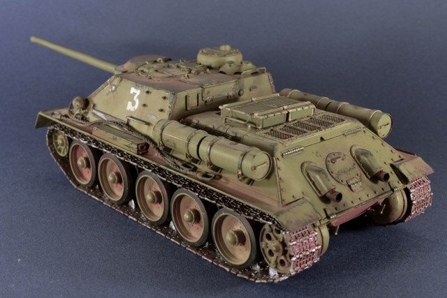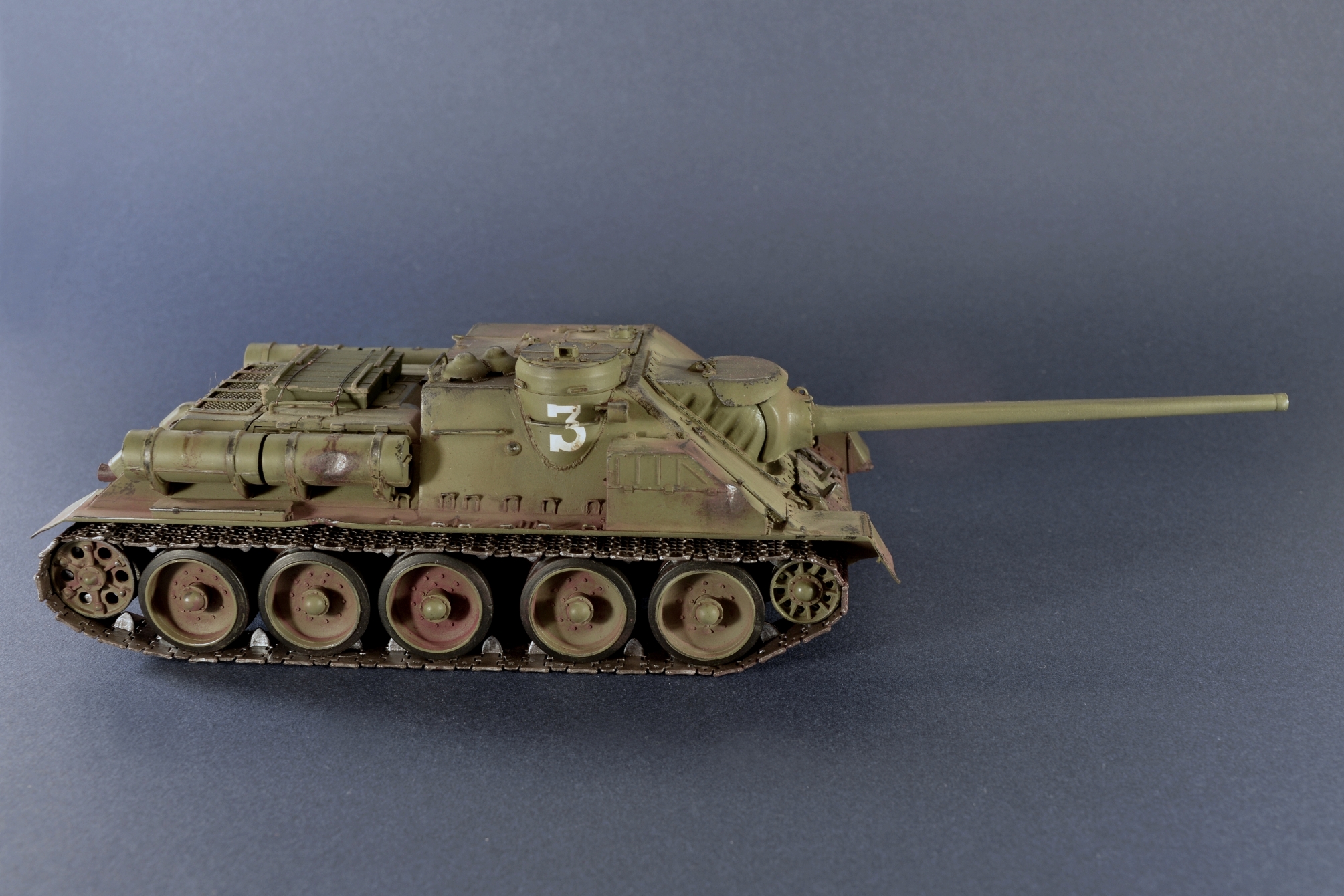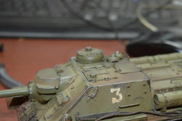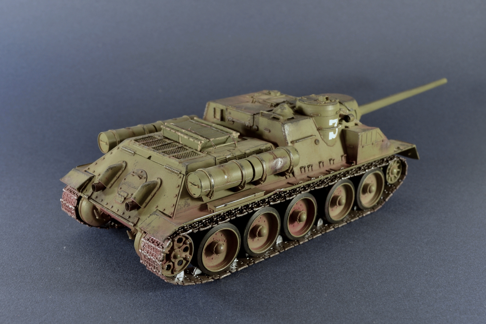 Но косяк в том, что - "Реальная машина, возможно, поучаствовала в штурмах пригородов Берлина в апреле-мае 1945г." с данной балкой машина не могла принимать участие в штурме Берлина, бо такая модификация появилась в только в июне 1945 года. Разница в том, что основа первых Соток - Су-85 (Т-34/76), а с июня 45-го их начали делать на базе Т-34/85, а там другая балка, и как следствие - нивилирована ступень между верхним бронелистом и балкой. Собсно фото машины первых выпусков - прилагаю, стоит в нашем музее.