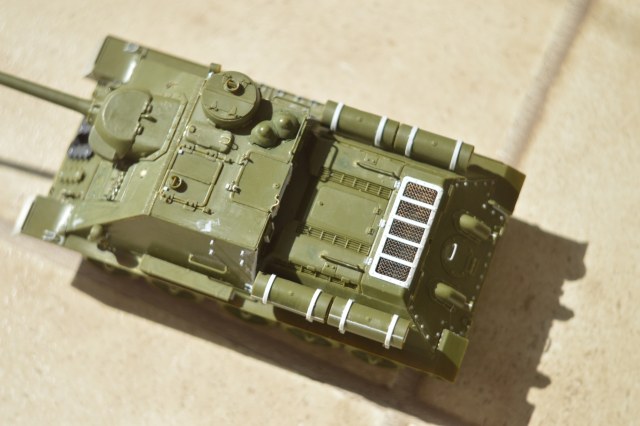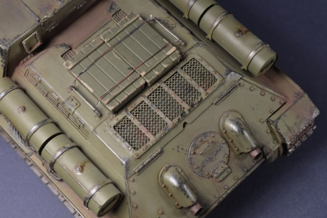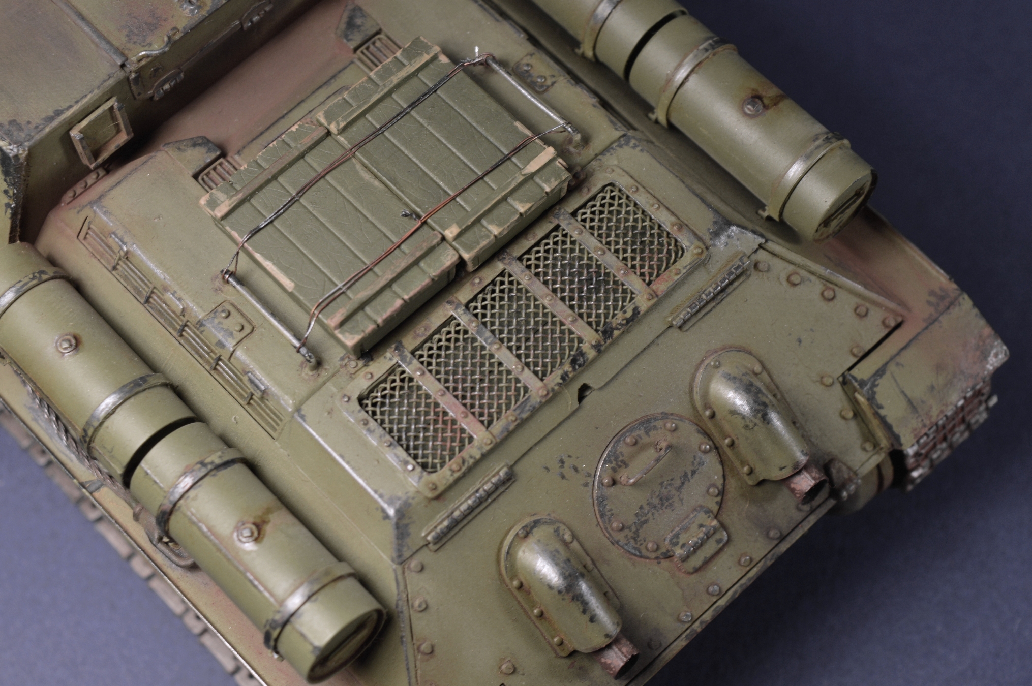 Ещё огорчило невнимание к маске пушки - между болтами вырезки гораздо глубже. Сетка над ТО очень крупная. Бронировки выпускных труб слишком длинные. Запасные траки крепились на ВЛД не гайками на шпильках, а болтами в бонки. Обидно: чуток внимания - и была бы машина выставочного уровня!