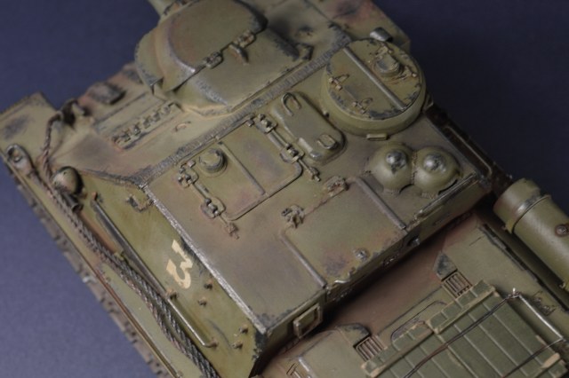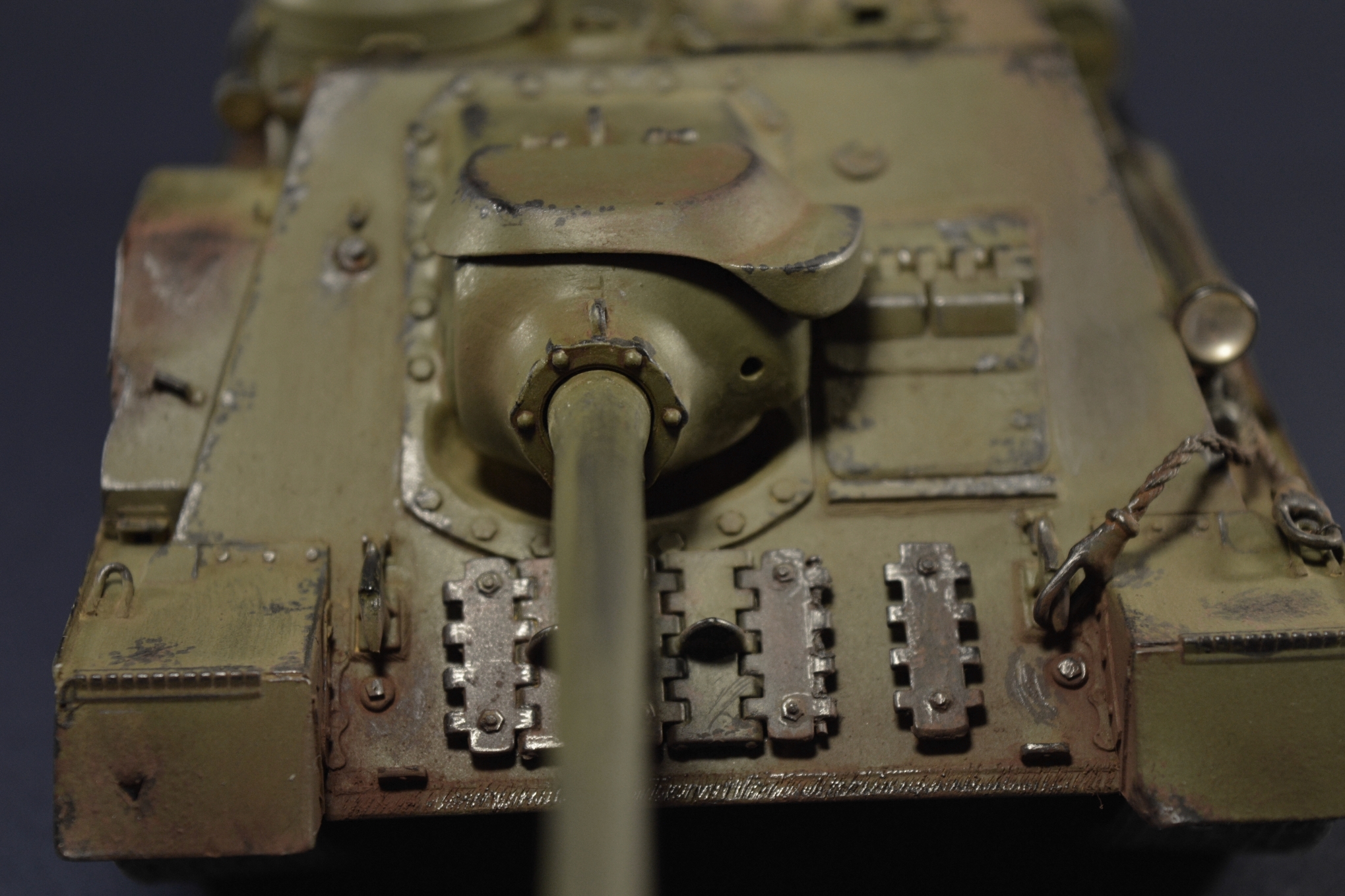 Перебор с протертостями до металла, плюс, почему он такой яркий и блестящий? Танк из алюминия? Эффект красивый, но неуместный.