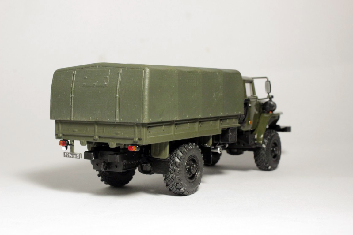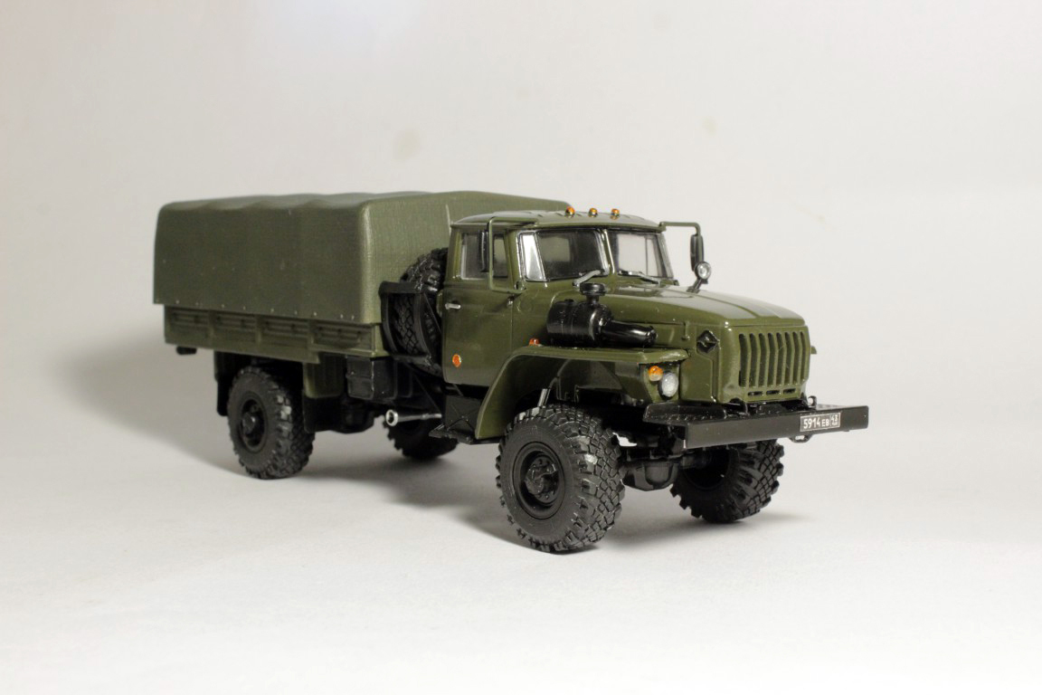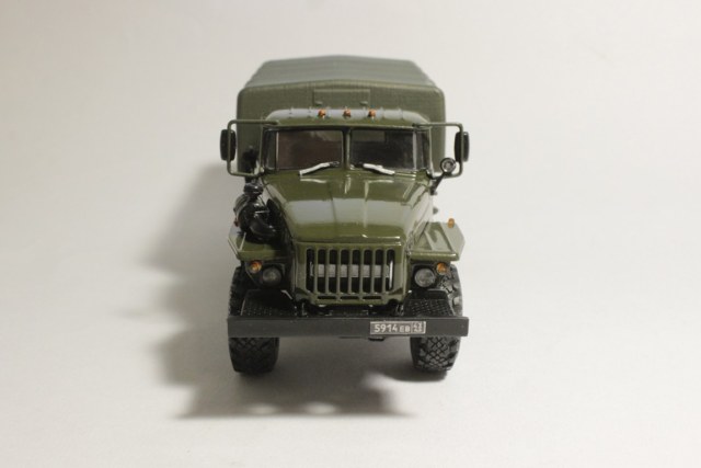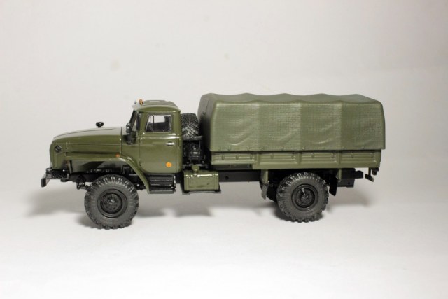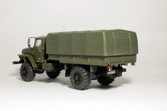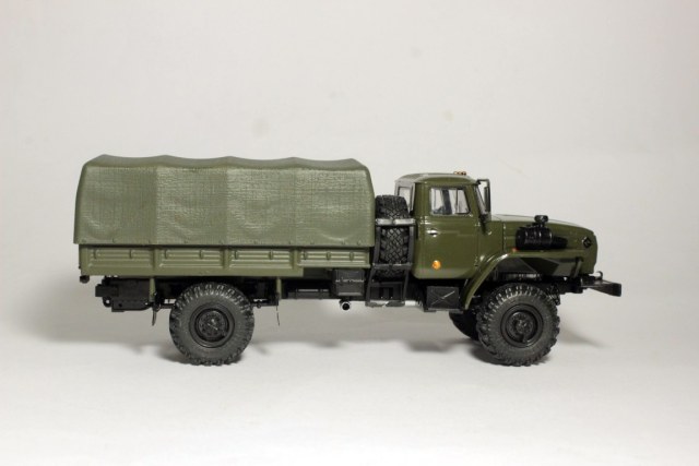 Кабина взята с синего 4320-0911 и перекрашена военным цветом, бампер взят с 4320-31. Труба фильтра перенесена вперед и в боковину капота; сделан черный логотип автомобиля на его нос, его черным цветом; заделано отверстие от предыдущего входа фильтра, но намек оставлен, как на настоящих; подножка под бампером в положении "задвинуто"; номер реальной машины со старым типом тента; выемки над задними колесами в борту кузова заделаны; кузов перекрашен, тент тоже по прототипу; добавил брызговики как с фотографии.
