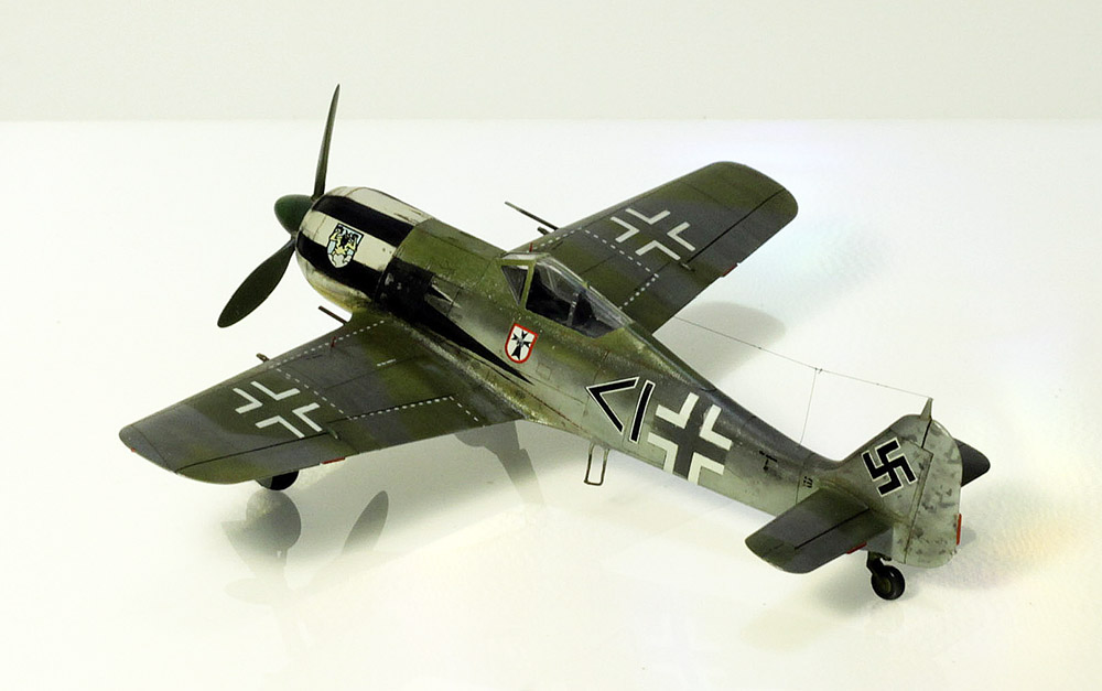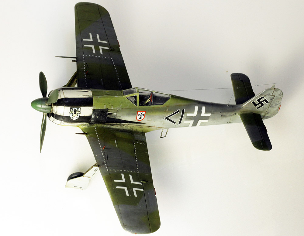 Это пример, что все может быть испорчено даже на самой финальной, маленькой стадии постройки модели. Докрашивая переплет фонаря, я сделал небольшой косячок. Исправляя его, я сделал еще больший косяк (отодрал маской декали), хотел декали натрафаретить и дорисовать, сделал еще хуже, в общем, как снежный ком, моя модель обрастала косяками и летела в штопоре. Под конец, одну стойку шасси оторвала жена, вторую оторвал потом я (упал). Вобщем, исправлял, как мог, декали я в итоге взял от другой такой же модели, пришлось купить еще один самолет. Кстати, новые декали были приварены 646 растворителем. А я все думал, как же мне их приварить, а приварка у меня всегда стояла в бутылке, я ведь 646м краски бодяжу. Подсказал мне этот способ Александр Христенко, только привариваю я аэрографом, а не кистью. Еще пришлось заливать черным фильтром, чтоб срам всякий подретушировать. И, да, белый уголок на свастике изначально отсутствовал, я его когда переделывал, случайно дорисовал. Будем считать, что г-на фашиста Эберхарда наругали, что у него нету белого уголка на свастике, и он побежал дорисовывать.