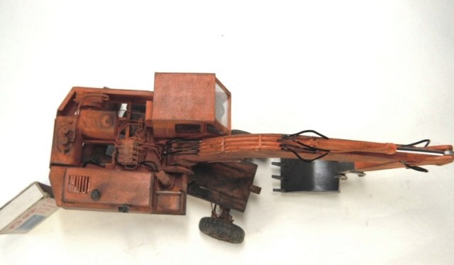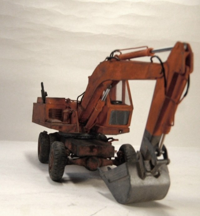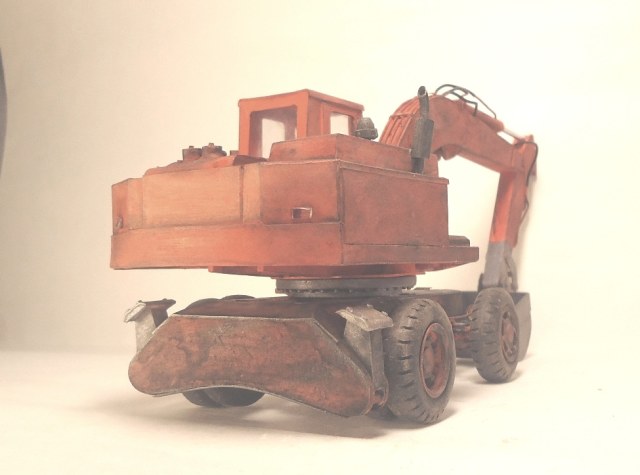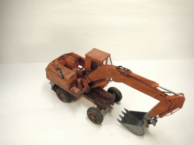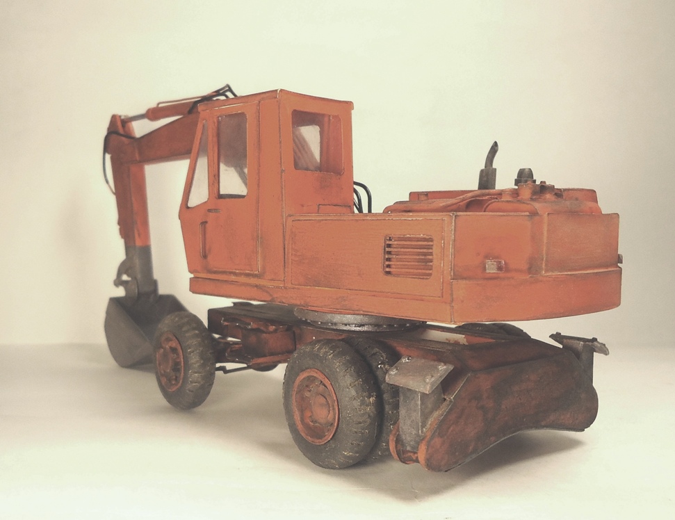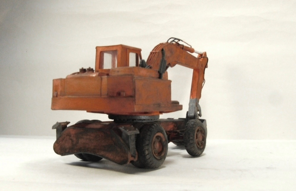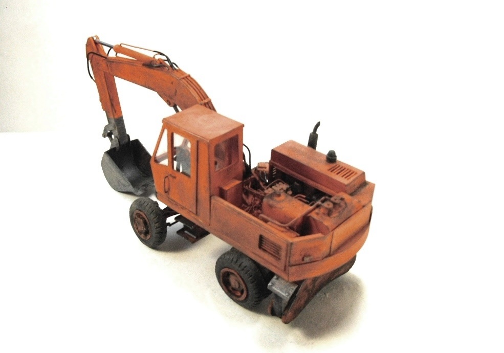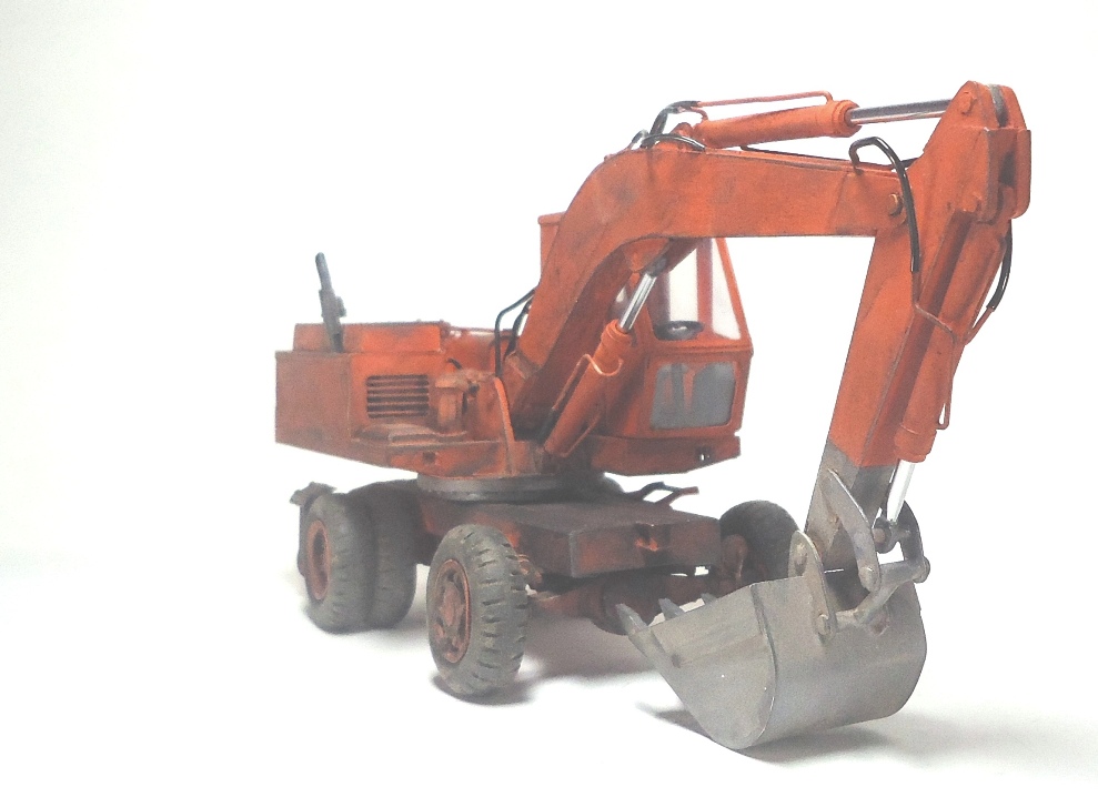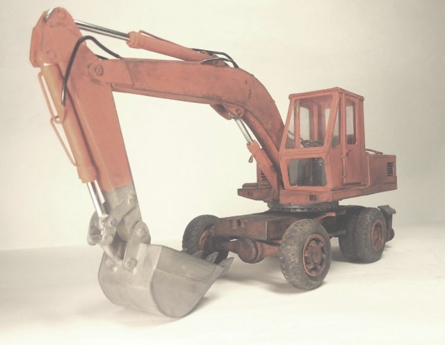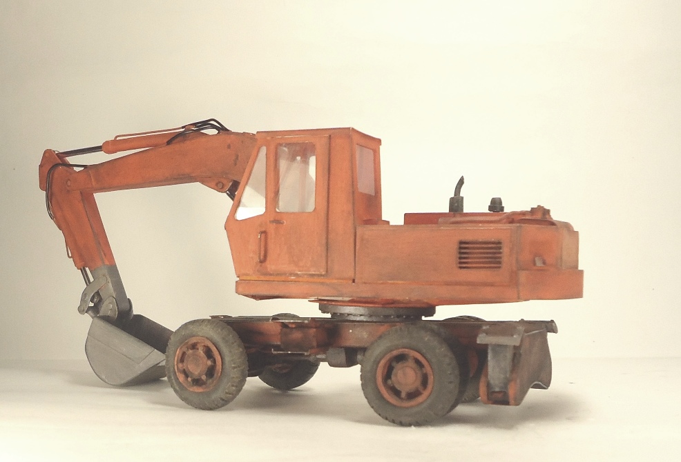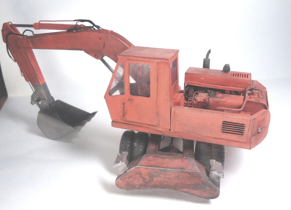 Модель вызывает смешанные чувства, с одной стороны радует появление еще одной гражданской машины, с другой, качество исполнения очень расстраивает. Скажу сразу, я не являюсь сторонником теории, что самодел имеет какие либо преимущества перед покупной моделью, модель есть модель, она либо похожа либо нет. По существу скажу так: поворотная часть сделана здорово, единственно почему-то задняя часть шире передней. Стрела явно толще чем надо, а ковш переразмерен и это заметно. Размер аутригеров, вообще без коментов так сказать... Колеса тоже не понравились. Могли-бы у нас закупить, мы кому-то продавали от Э-302Б за 500 рублей вроде... Хотя, вроде, это вообще не родная для него резина. Так же отсутствие отвала расстроило, хоть так и бывает, но на мой взгляд он добавляет к внешнему виду машины. В общем сложилось ощущение, что после запила поворотной части силы кончились. Жаль.