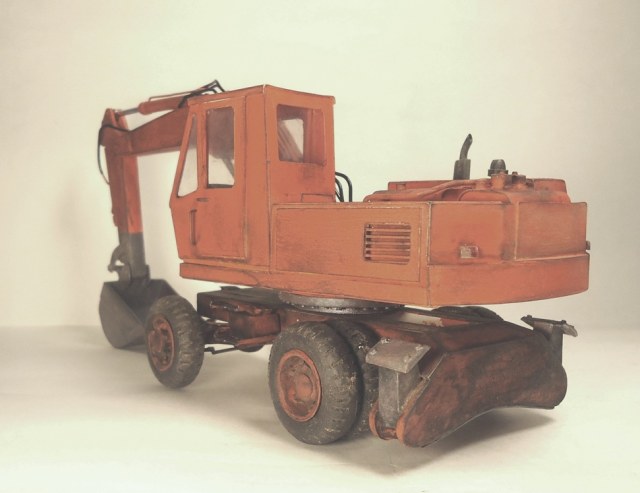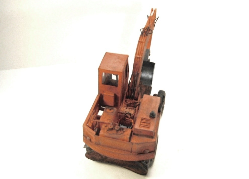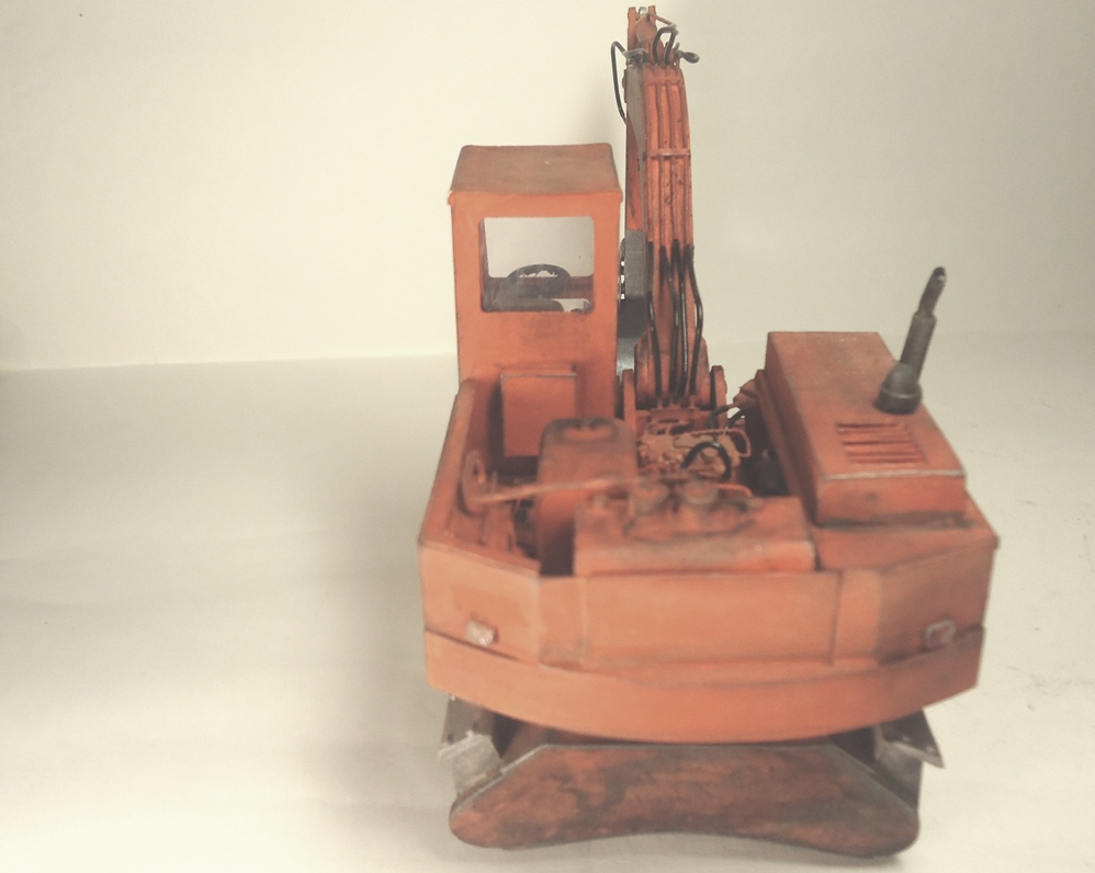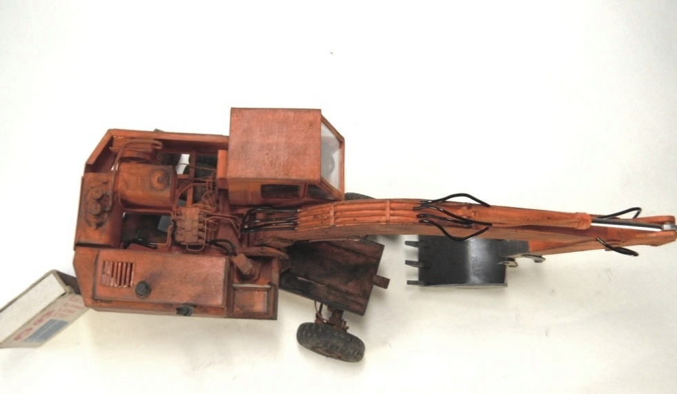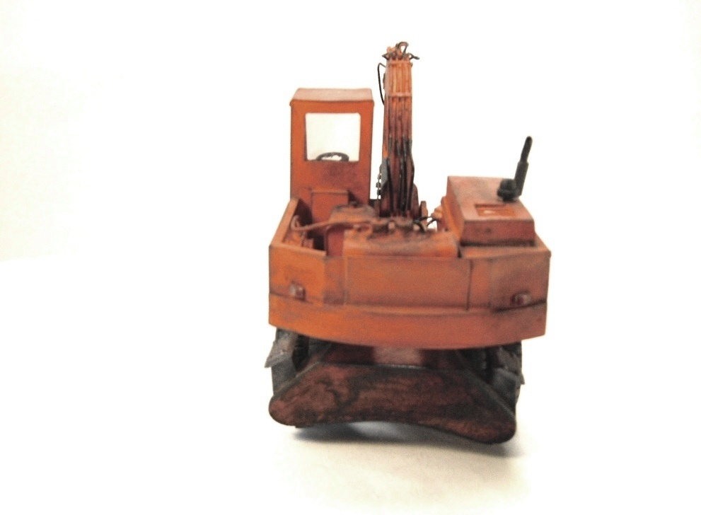 Модель выполнена из пластика различной толщины ( отходы пластиковых панелей , рекламных табличек ) , гидравлика - проволока ,. Модель окрашена и тонирована красками Звезда – кистью. Загадинг–пудра жены и тонер из картриджа . Работа продолжалась 8 месяцев .