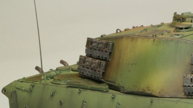 Специально для любителей мат части сообщаю: камуфляж машины вымышленный, и не имеют исторической привязки. Камо рисовался по мотивам известного боковика, на котором изображен танк под командование оберштурмфюрера СС Липперта. Хотя, некоторые коллеги утверждают, что боковик нарисован не верно, т.к. на историческом фото просматривается камуфляж нанесенный на ходовую, я решил, за основу брать именно этот «неправильный» боковик.