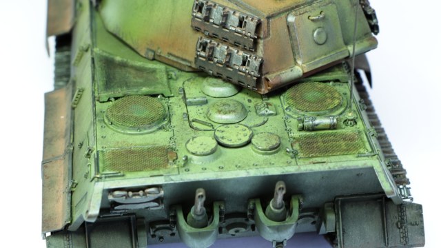 Еще, раз уж Вы ссылаетесь на правильные книги, отмечу, что в них указан порядок навески бортовых экранов: второй экран слева должен быть с накладной полосой. К тому же их можно было немного сточить, а то получились бронеплиты какие-то. Да и вентиляционных трубок должно быть четыре. Помимо того, не очень понятна Ваша логика: Вы цитируете, что с сентября командирский люк крепился на болтах, но тем не менее привариваете его, однако, что касается циммерита, то предпочитаете без него. Почему-то многие, следуя инструкции от Звезды, оставляют люк двигателя не закрытым.