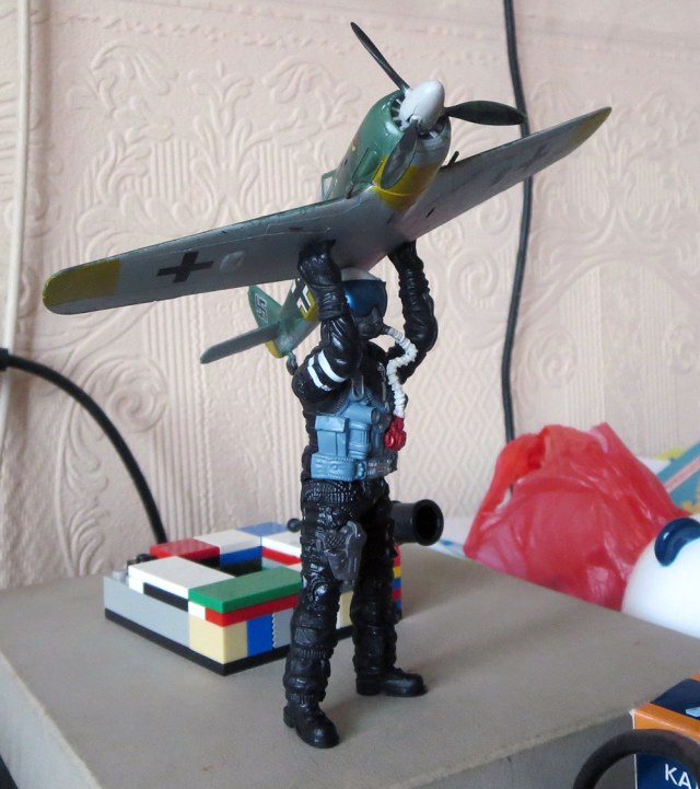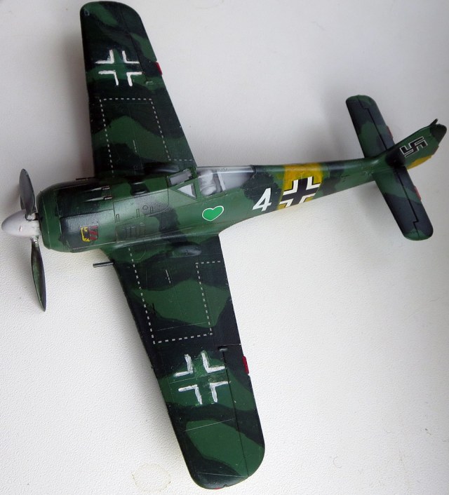 Самолет собран и окрашен за день. Я купил его из-за того, что мне нужны были декали для своего фокке вульфа, а этот я сначала хотел сделать моделью, но передумал и отдал на сборку и окраску сыну. Собирал он его сам, практически без моей помощи. Чем меня удивил, т.к. даже при сборке лего ему нужна компания. Потребовалась помощь только в отделении и креплении мелких деталей кокпита и проклейке некоторых ключевых мест. Далее, я задул его грунтовкой, выбрал ему окраску (он сначала хотел туда звезды прилепить и сделать его советским, я отговорил) и приготовил для сына цвета на палитре, красилось им же водорастворимым художественным акрилом, т.к. для аэрографа он мал, но самое важное - запах растворителя не пошел бы на пользу. В покраске я уже помогал больше, схема камо его. Кабину и немца он не красил, сказал, что можно не красить, ему это не важно. Очень хотел приступить к наклейке декалей поскорей. Помогал пинцетом при наклеивании крупных декалей на фюзеляж. А потом сказал, что достаточно, и так красиво. Я ответил, что будет лучше, если я наклею все остальные сам, если он не хочет. Далее я приварил декали, нанес выхлоп пастелью, покрыл лаком, задул самолет фильтром ржавого цвета и, наконец, полуматовым лаком.