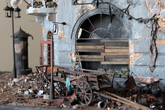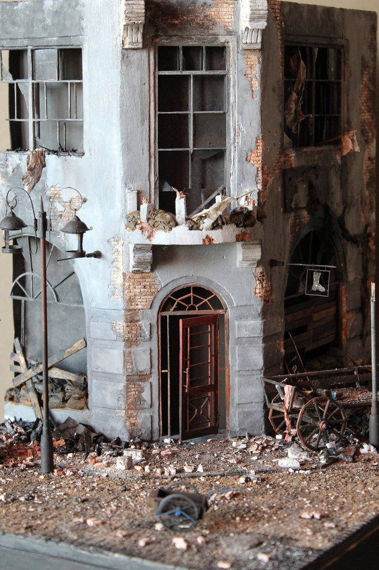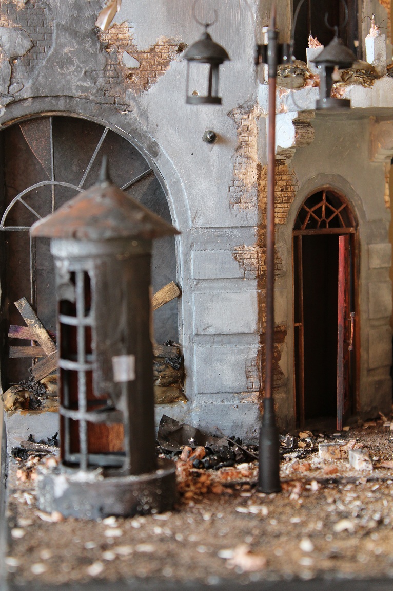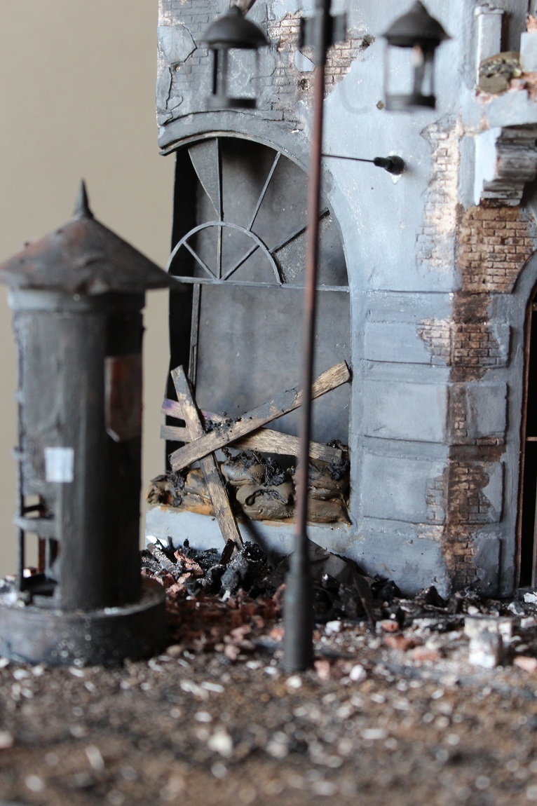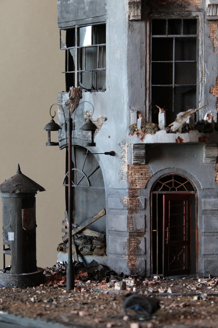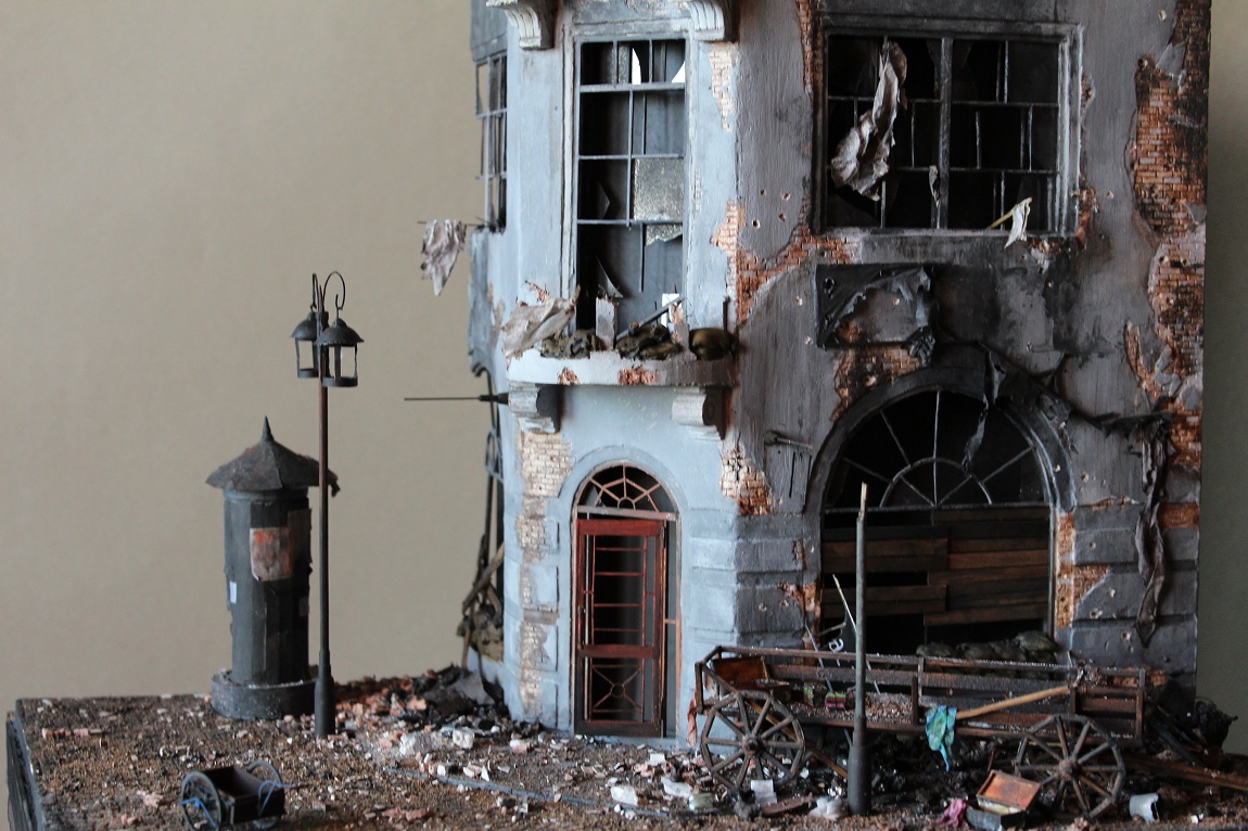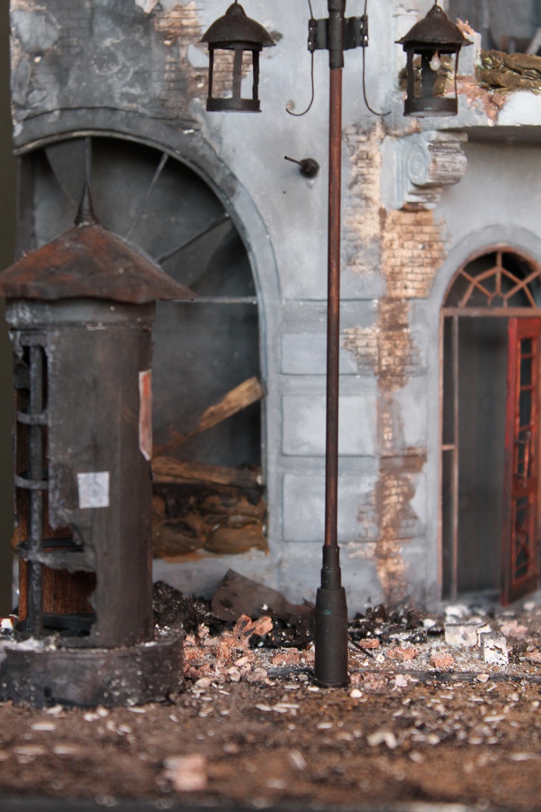 Это вы правы. То, что город был в руинах. Там живого места не было. Но не воспроизводить же груду кирпичей. Это было бы легко и не интересно. А так, появился фонарный столб, который я делал две недели, телегу почти месяц. Двойные рамы, афишная тумба эти предметы имели место в городе и согласен, что в горниле войны это все сгорело. Еще на диораме мог появится ларек "мороженное", но в него мой сына поместил свою машину и он стал невольно гаражом.
