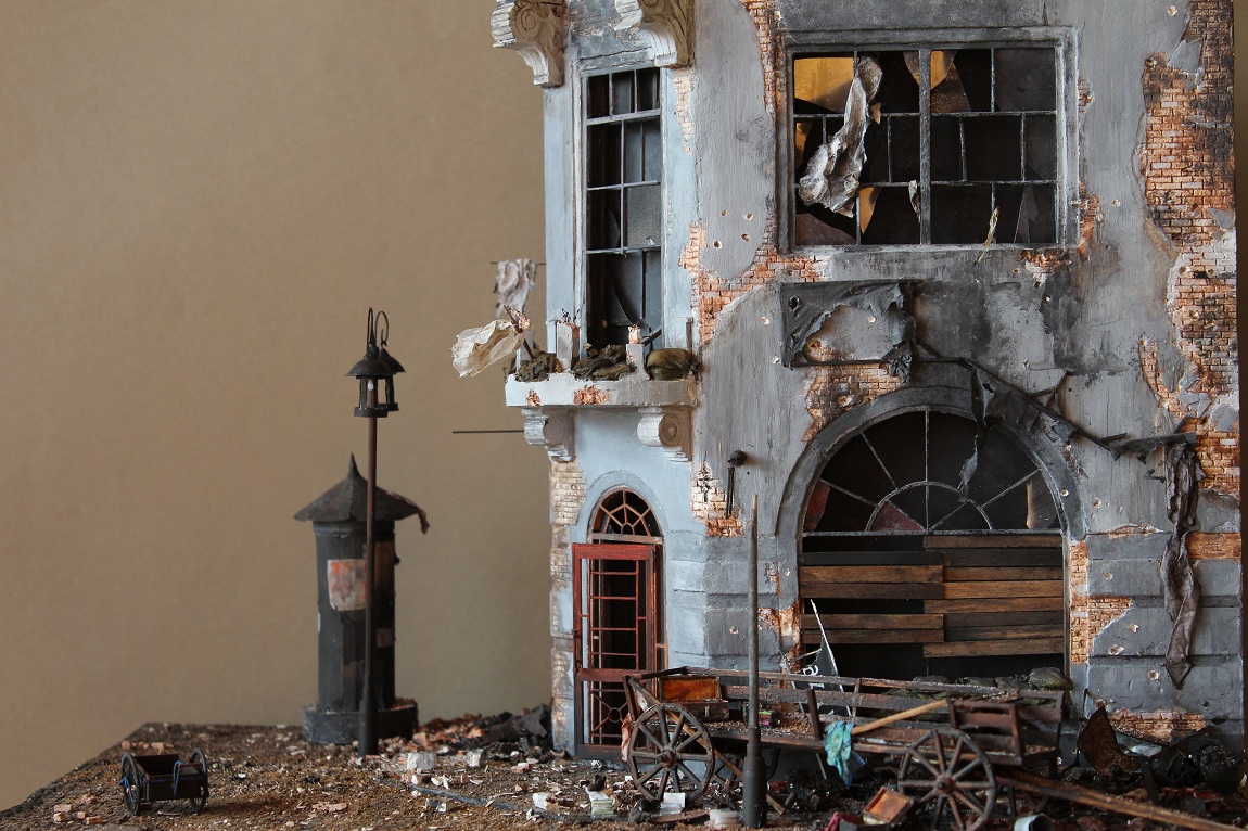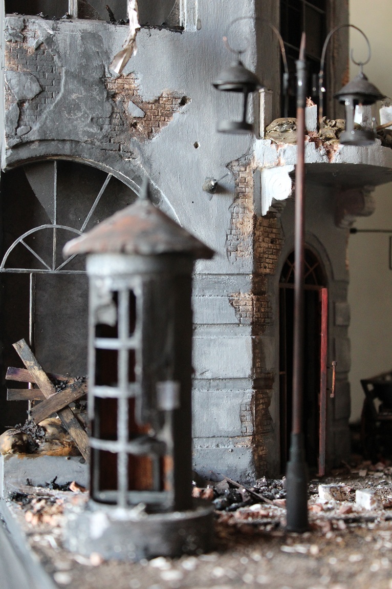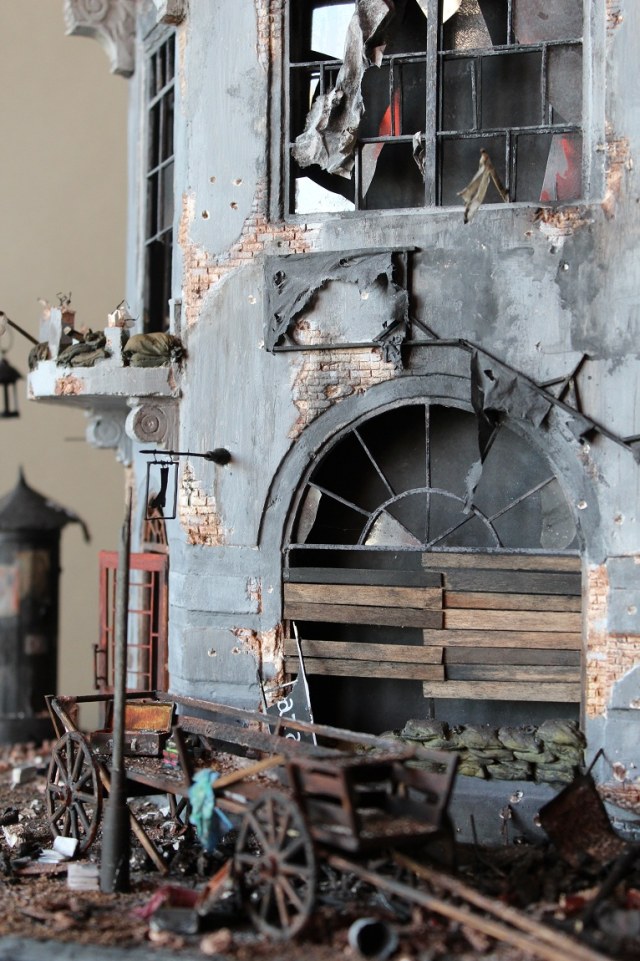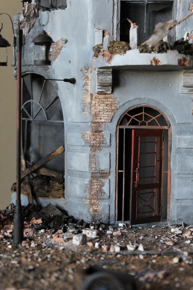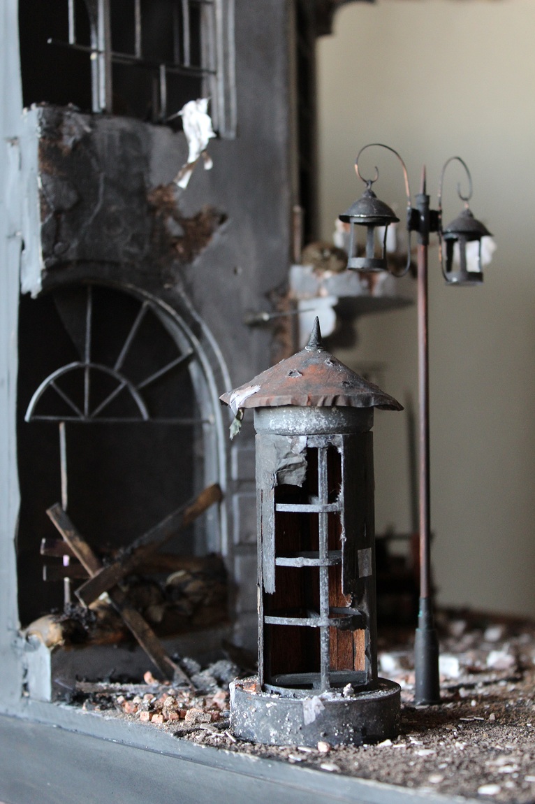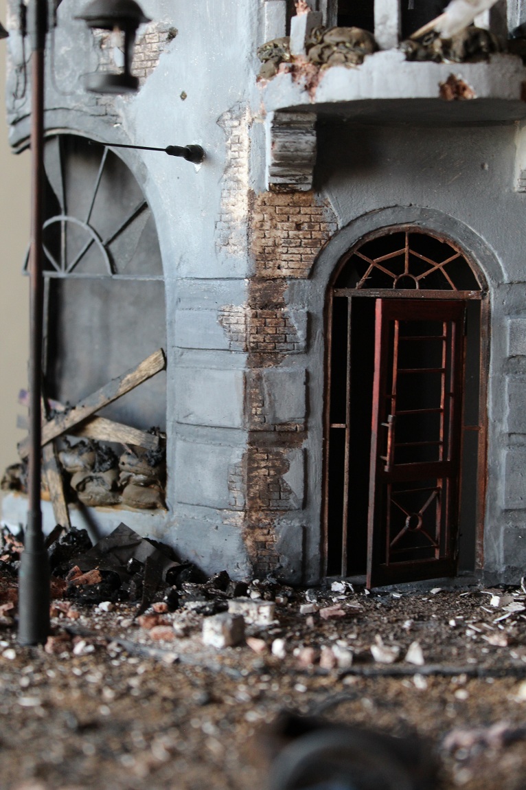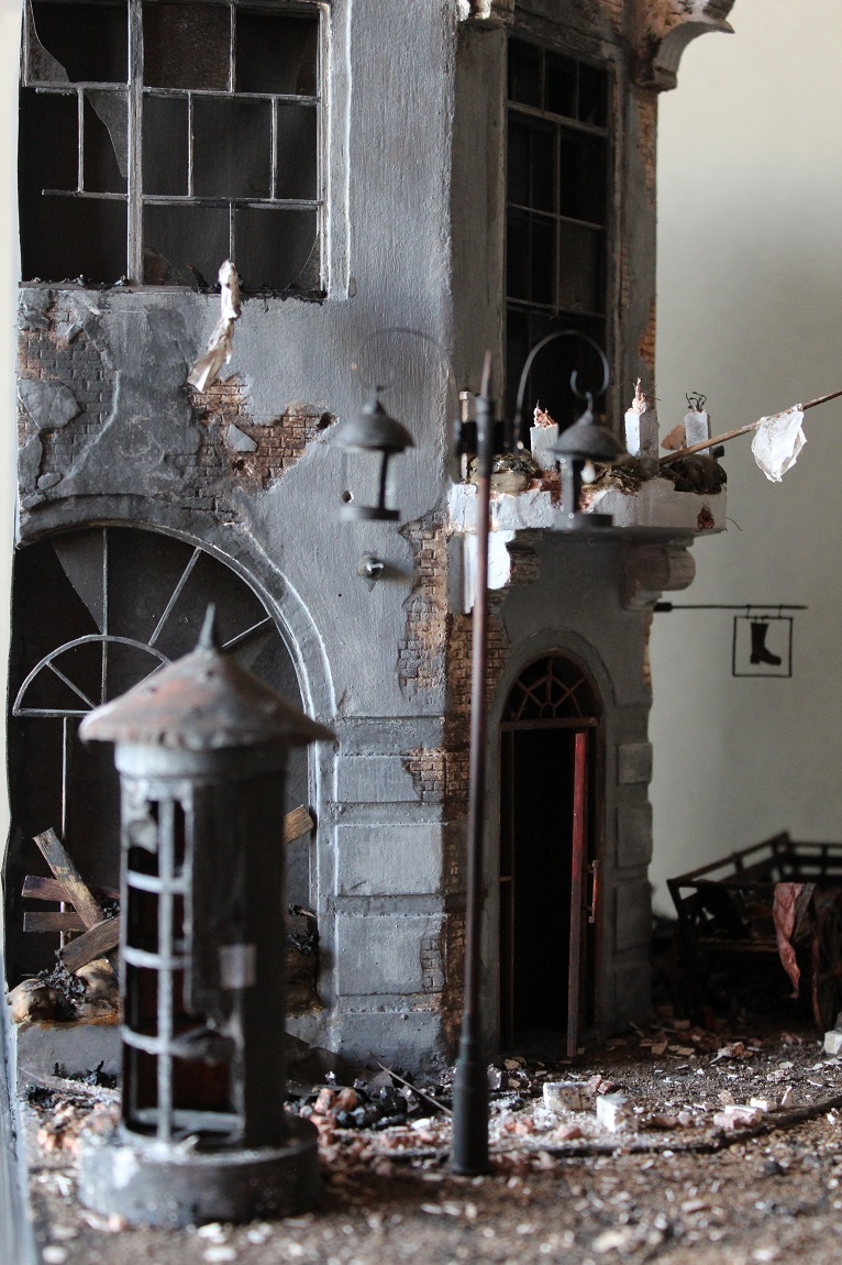 Это вы правы. То, что город был в руинах. Там живого места не было. Но не воспроизводить же груду кирпичей. Это было бы легко и не интересно. А так, появился фонарный столб, который я делал две недели, телегу почти месяц. Двойные рамы, афишная тумба эти предметы имели место в городе и согласен, что в горниле войны это все сгорело. Еще на диораме мог появится ларек "мороженное", но в него мой сына поместил свою машину и он стал невольно гаражом.