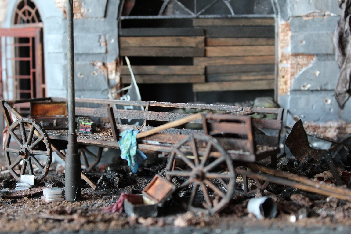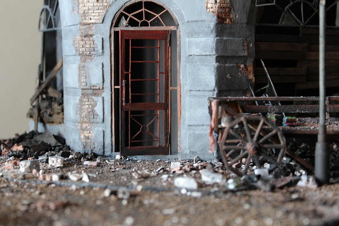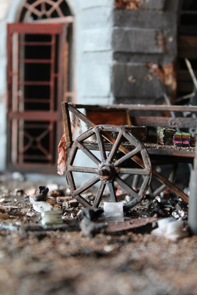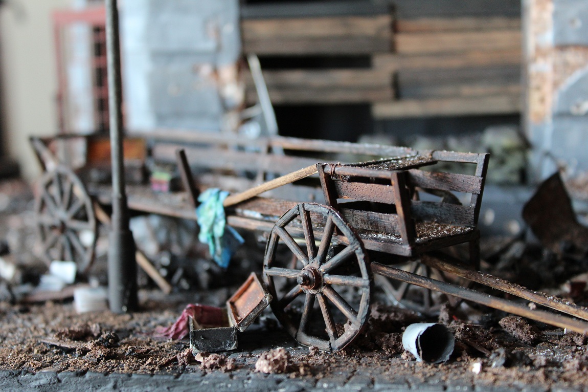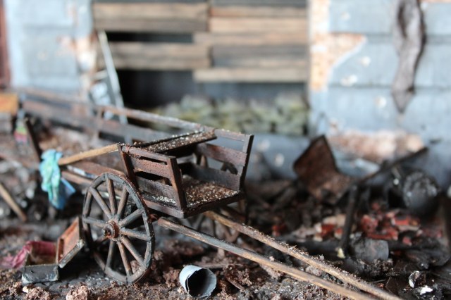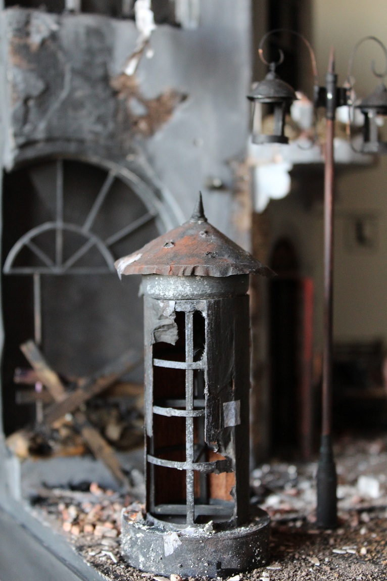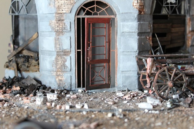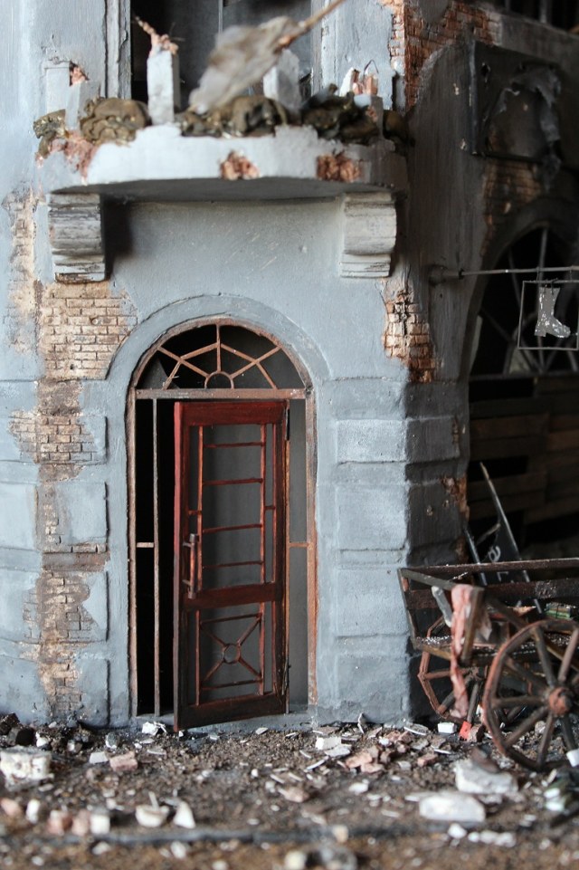 Это вы правы. То, что город был в руинах. Там живого места не было. Но не воспроизводить же груду кирпичей. Это было бы легко и не интересно. А так, появился фонарный столб, который я делал две недели, телегу почти месяц. Двойные рамы, афишная тумба эти предметы имели место в городе и согласен, что в горниле войны это все сгорело. Еще на диораме мог появится ларек "мороженное", но в него мой сына поместил свою машину и он стал невольно гаражом.