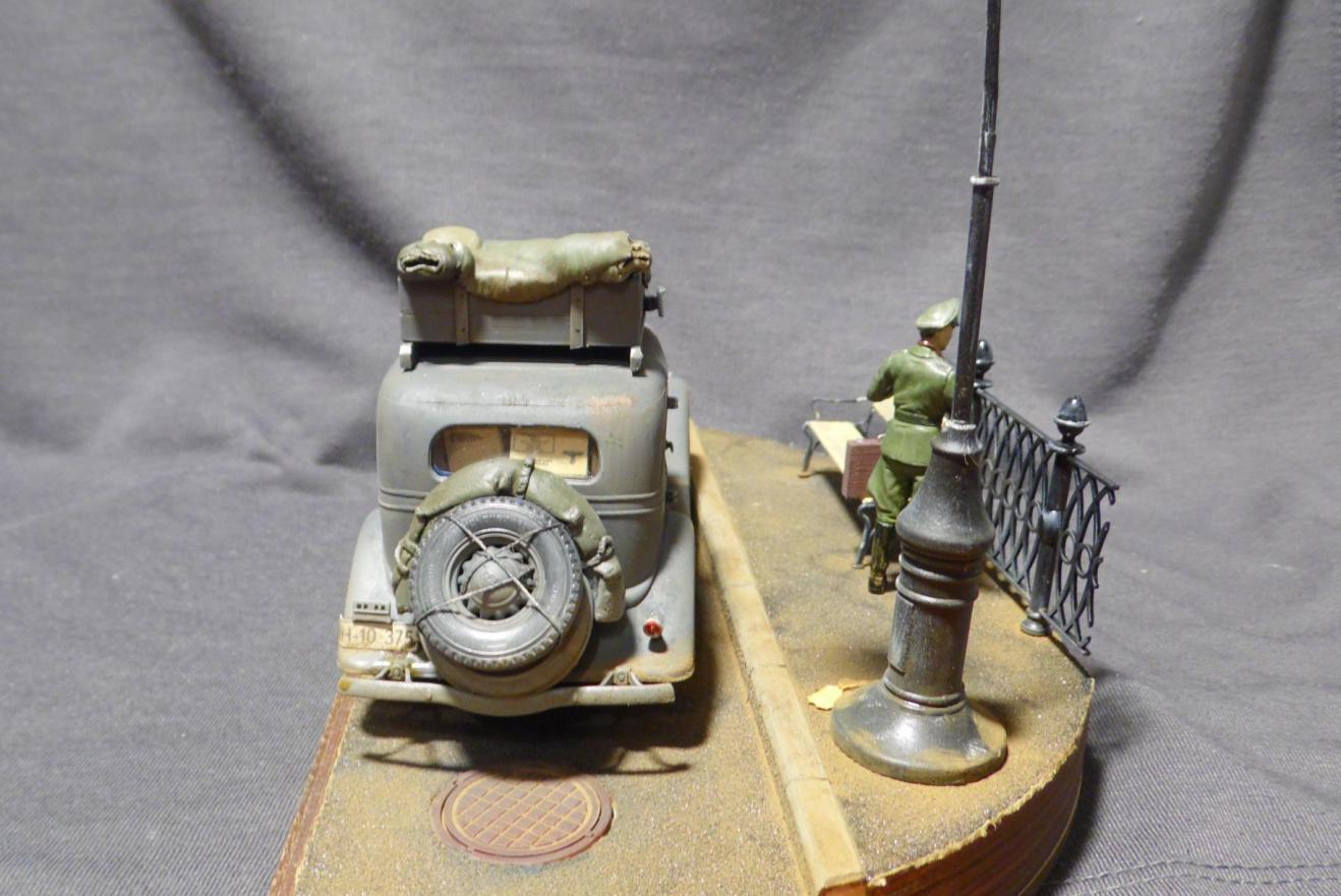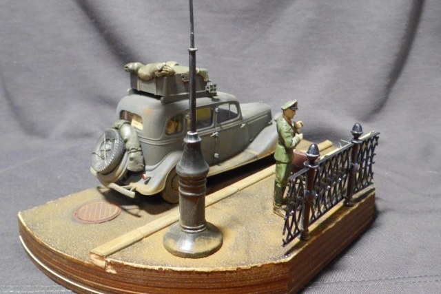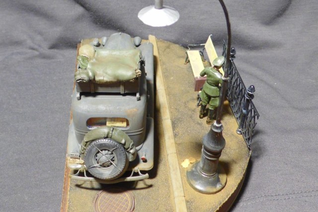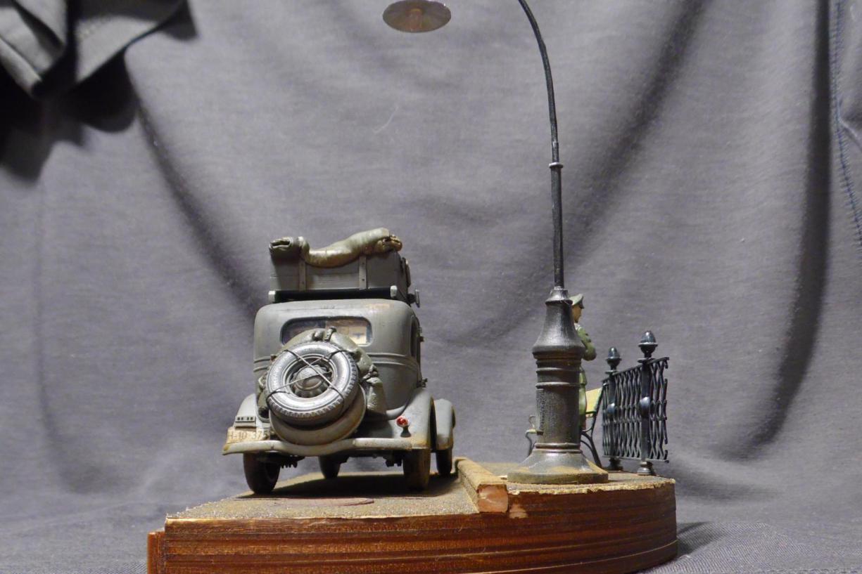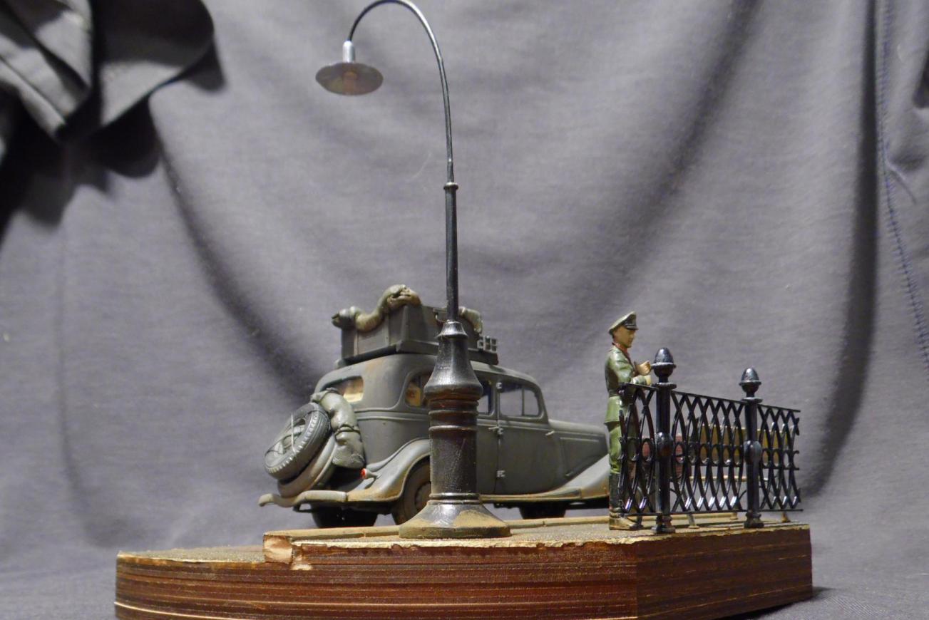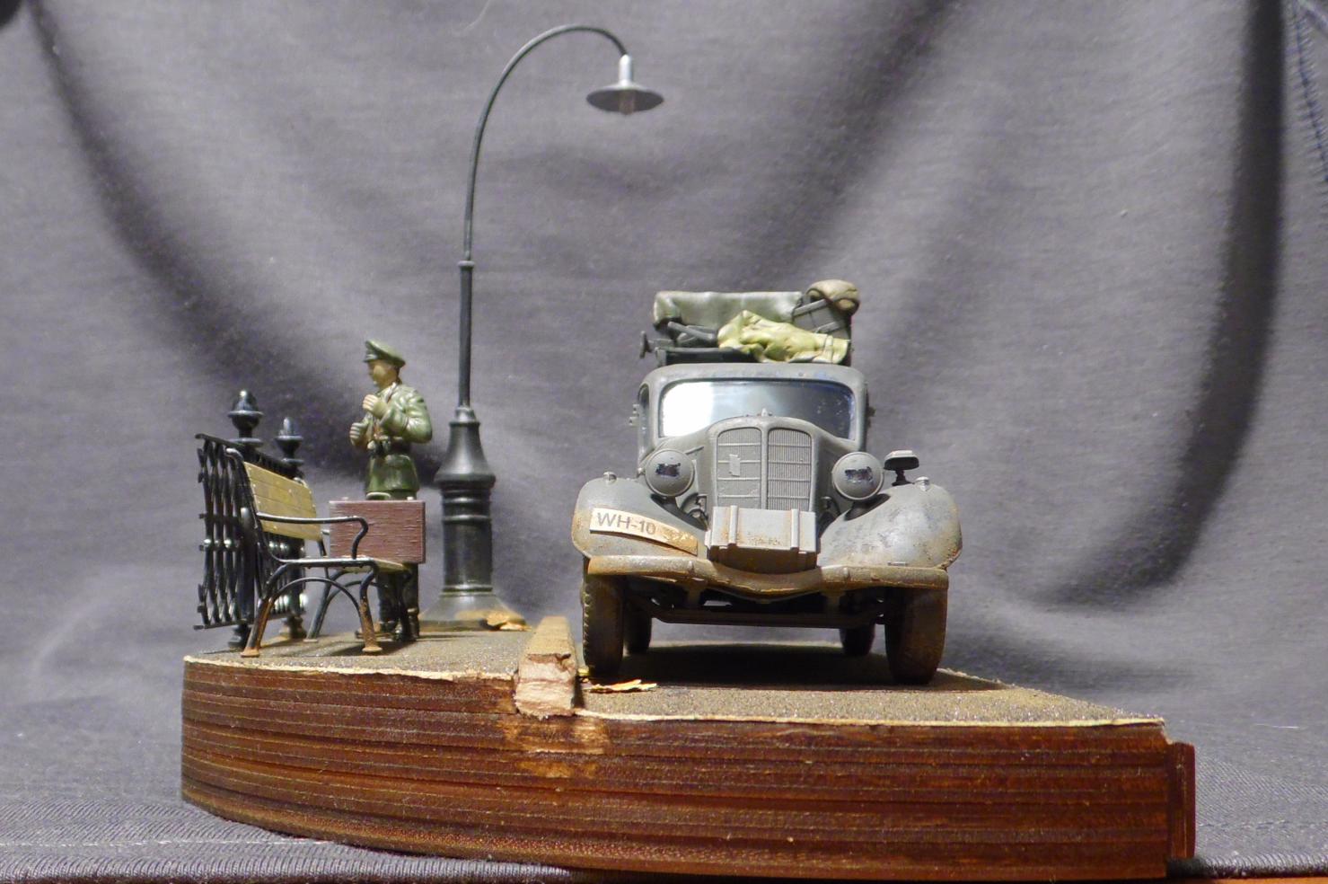 Денис! Отлично по композиции и исполнению, по продуманности и деталировке. Удивило одно: блестит именно то, что блестеть не может... форма на офицере, брезент на крыше и за кабиной авто, запаска. Возможно, что я "косой", если остальные не заметили. Возможно... С уважением