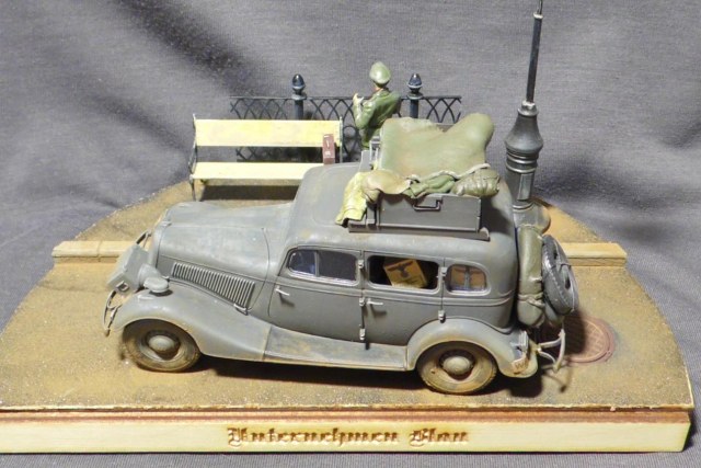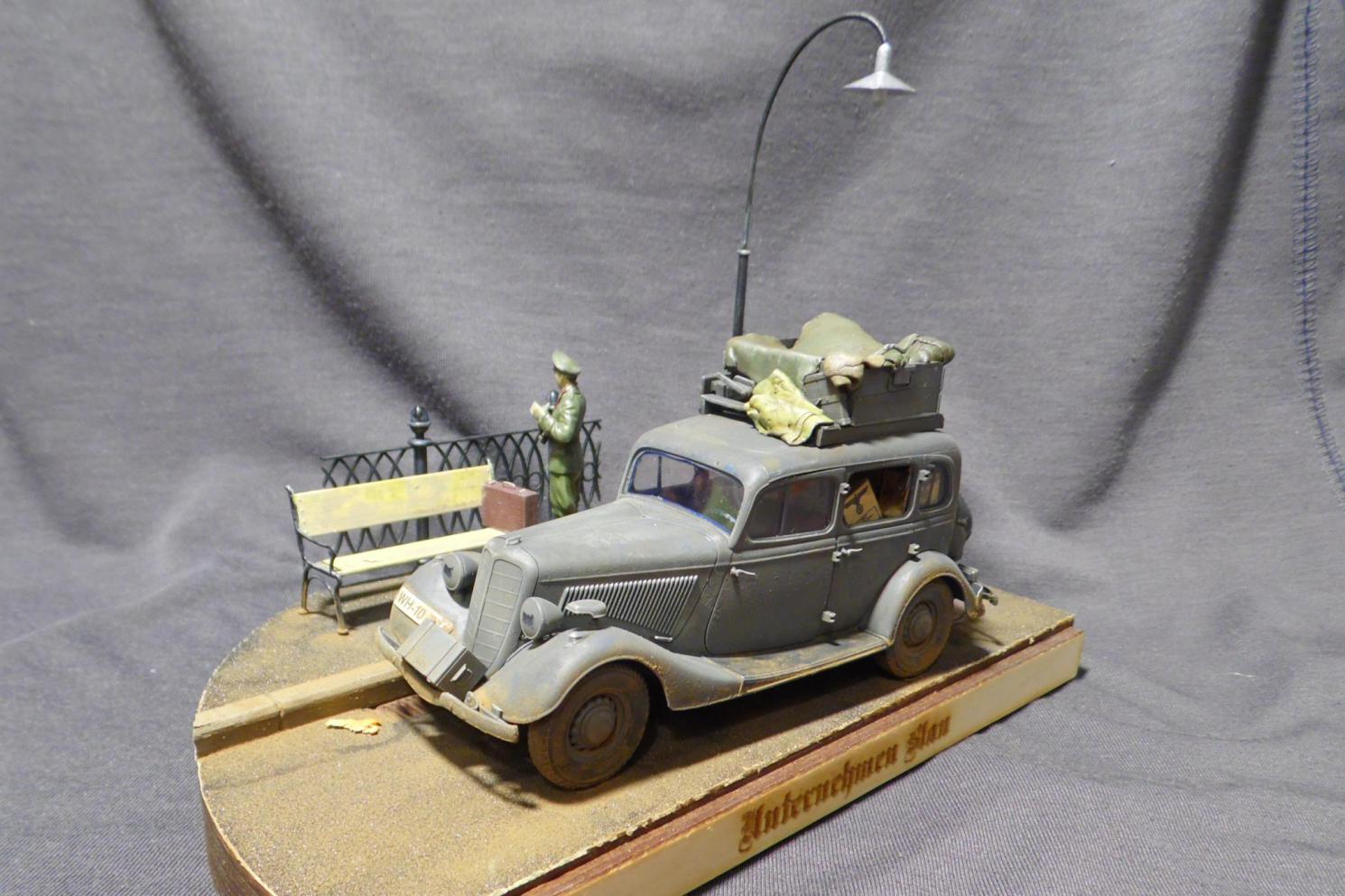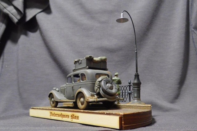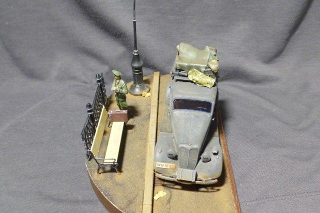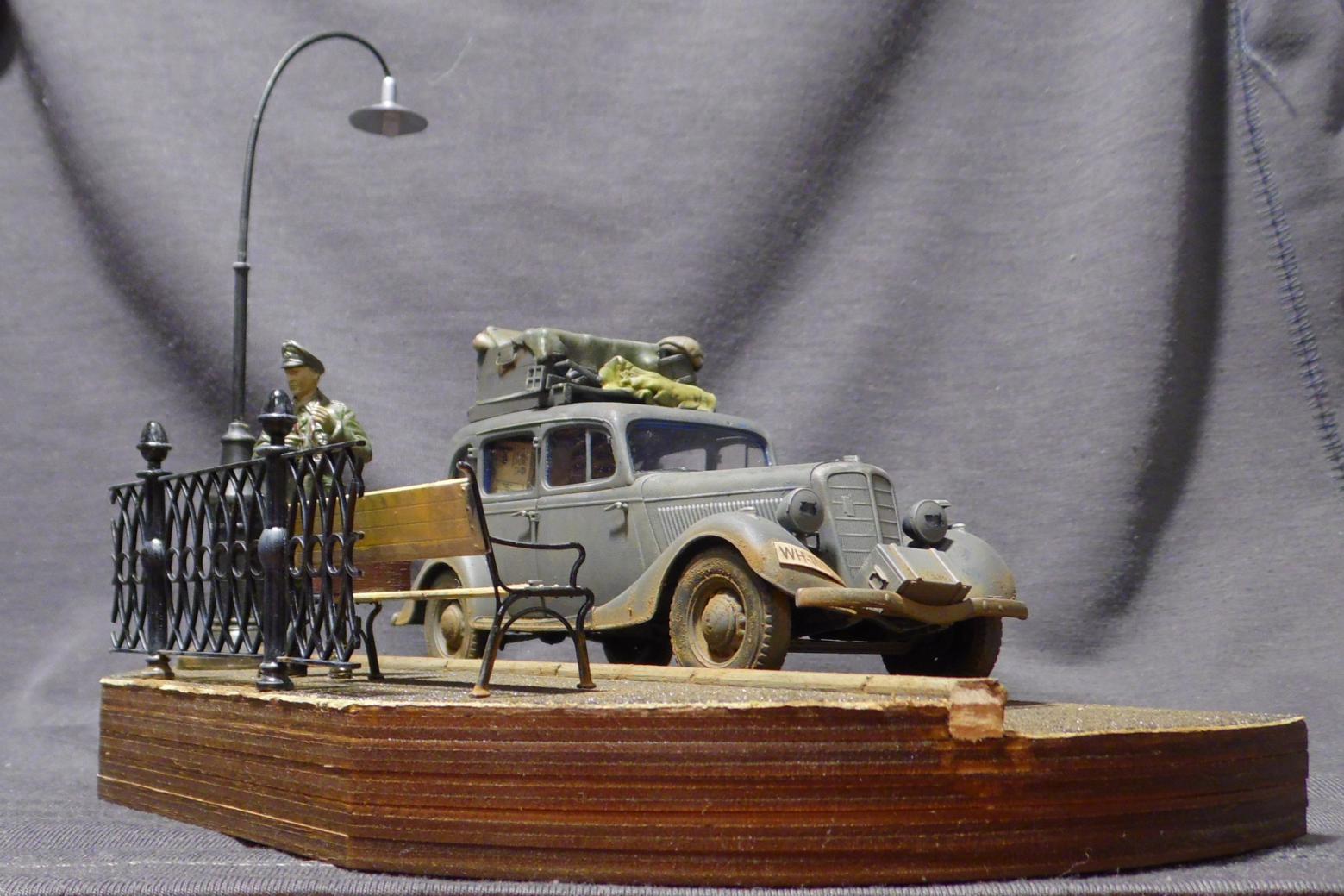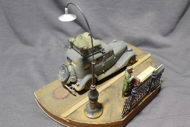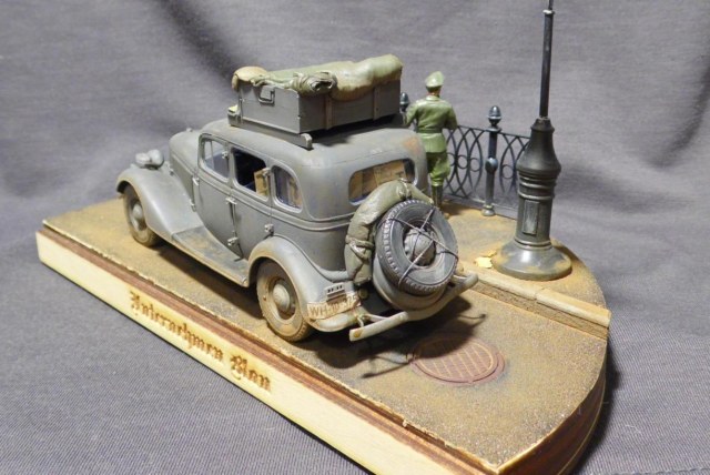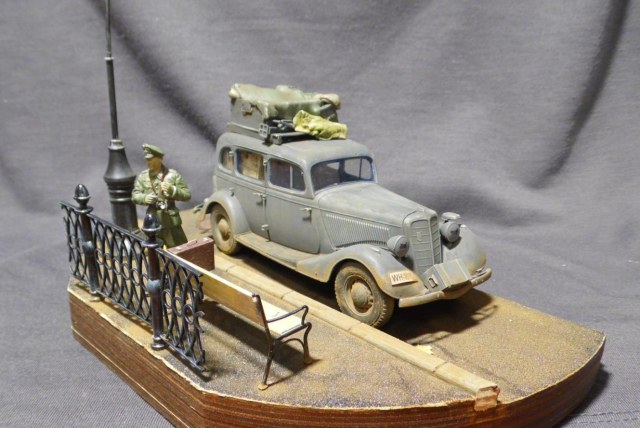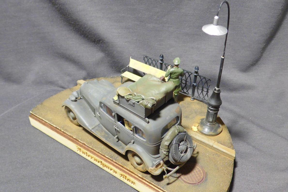 Денис! Отлично по композиции и исполнению, по продуманности и деталировке. Удивило одно: блестит именно то, что блестеть не может... форма на офицере, брезент на крыше и за кабиной авто, запаска. Возможно, что я "косой", если остальные не заметили. Возможно... С уважением