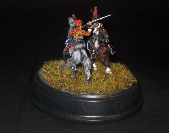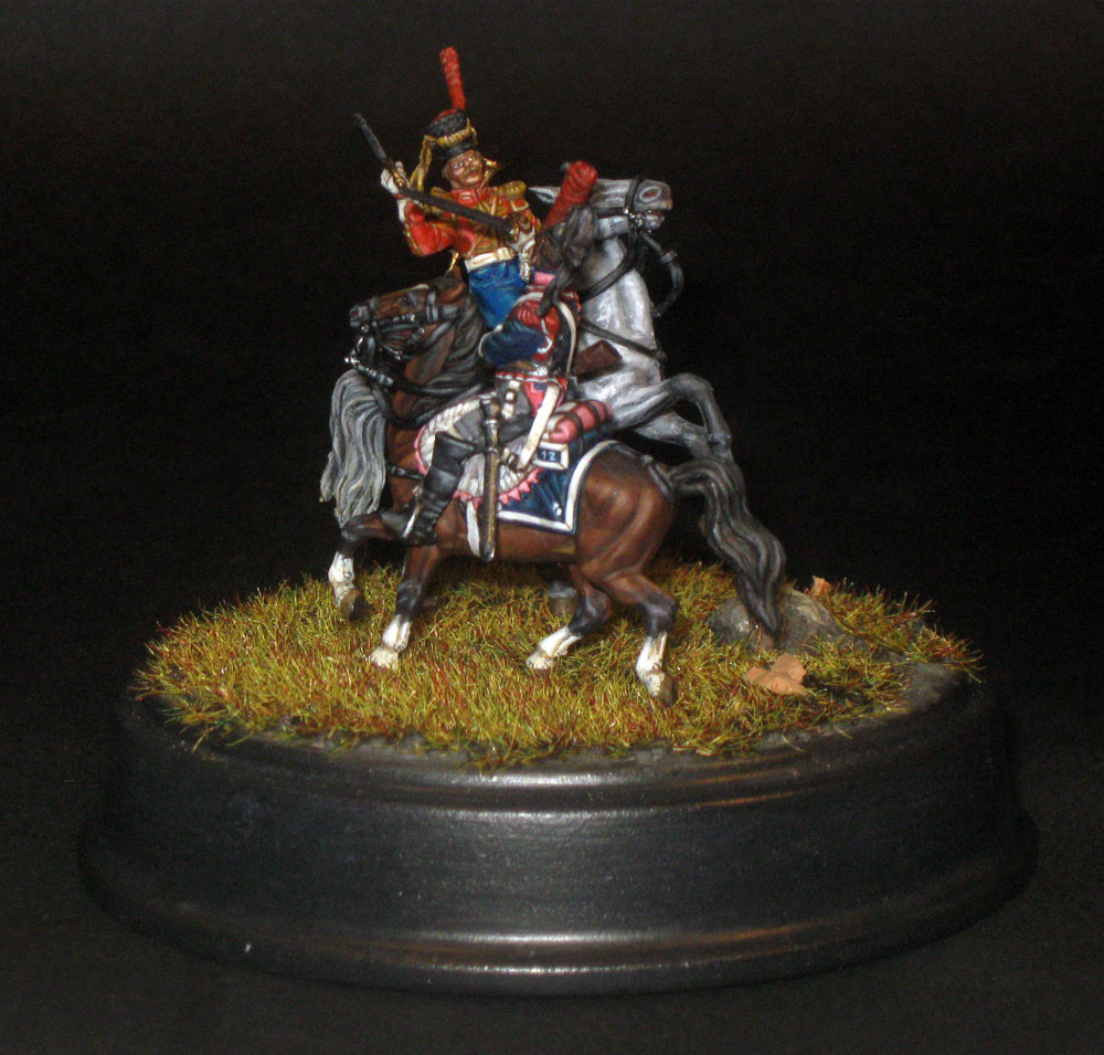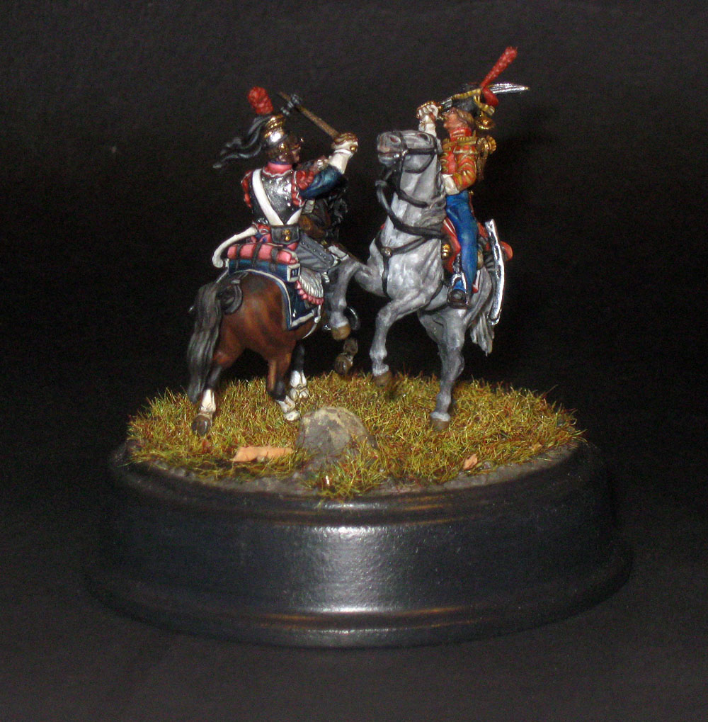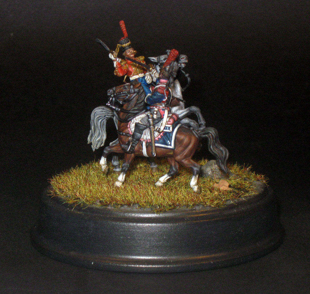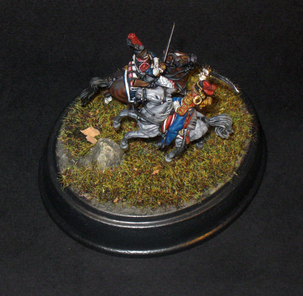 Работа очень простая, сюжет тоже. Схватка трубача лейб-гвардии казачьего полка с французским кирасиром. Из-за малых размеров работы, привязки к ко кому либо конкретному сражению не делал.