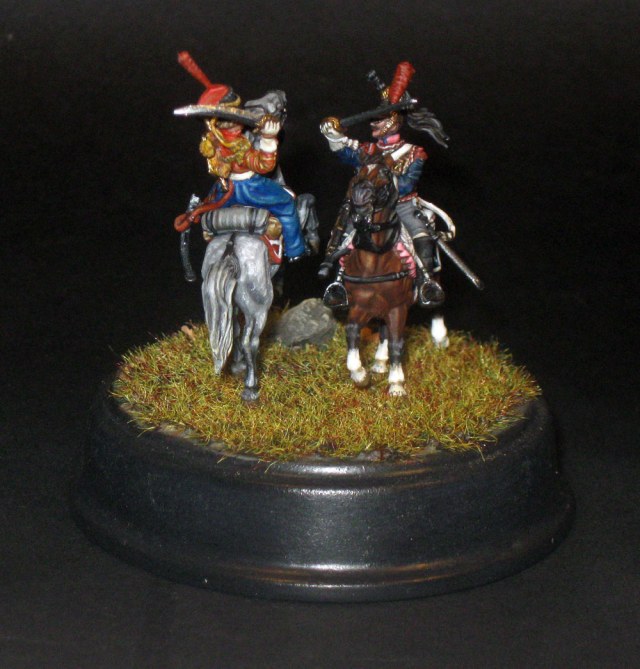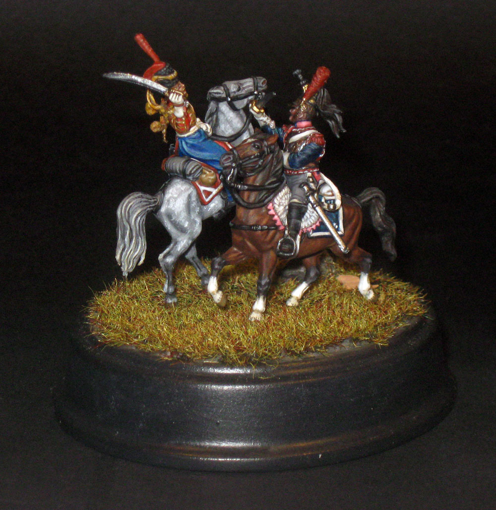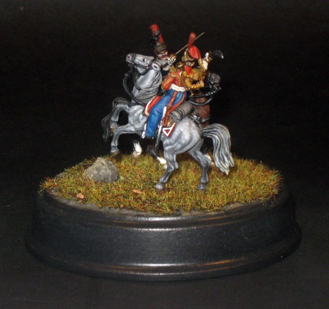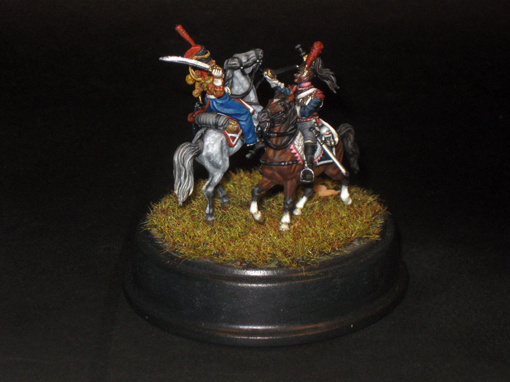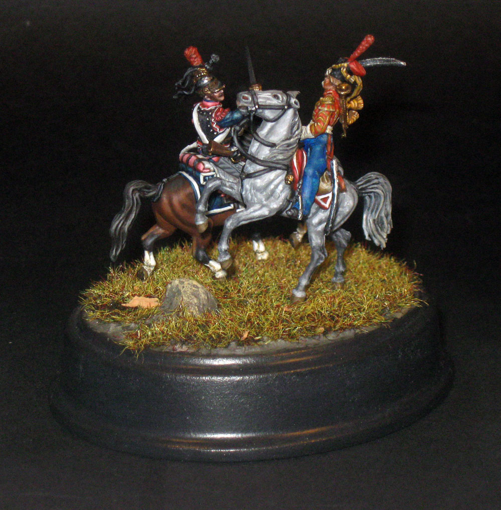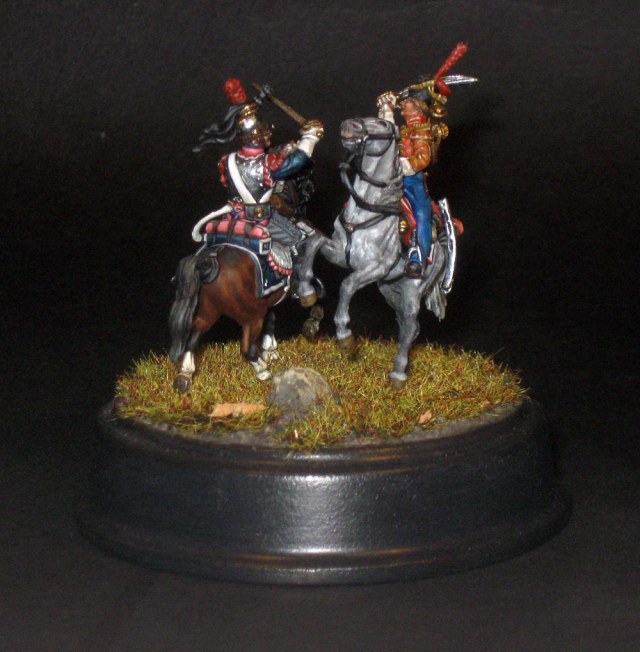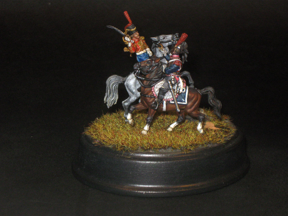 Работа очень простая, сюжет тоже. Схватка трубача лейб-гвардии казачьего полка с французским кирасиром. Из-за малых размеров работы, привязки к ко кому либо конкретному сражению не делал.