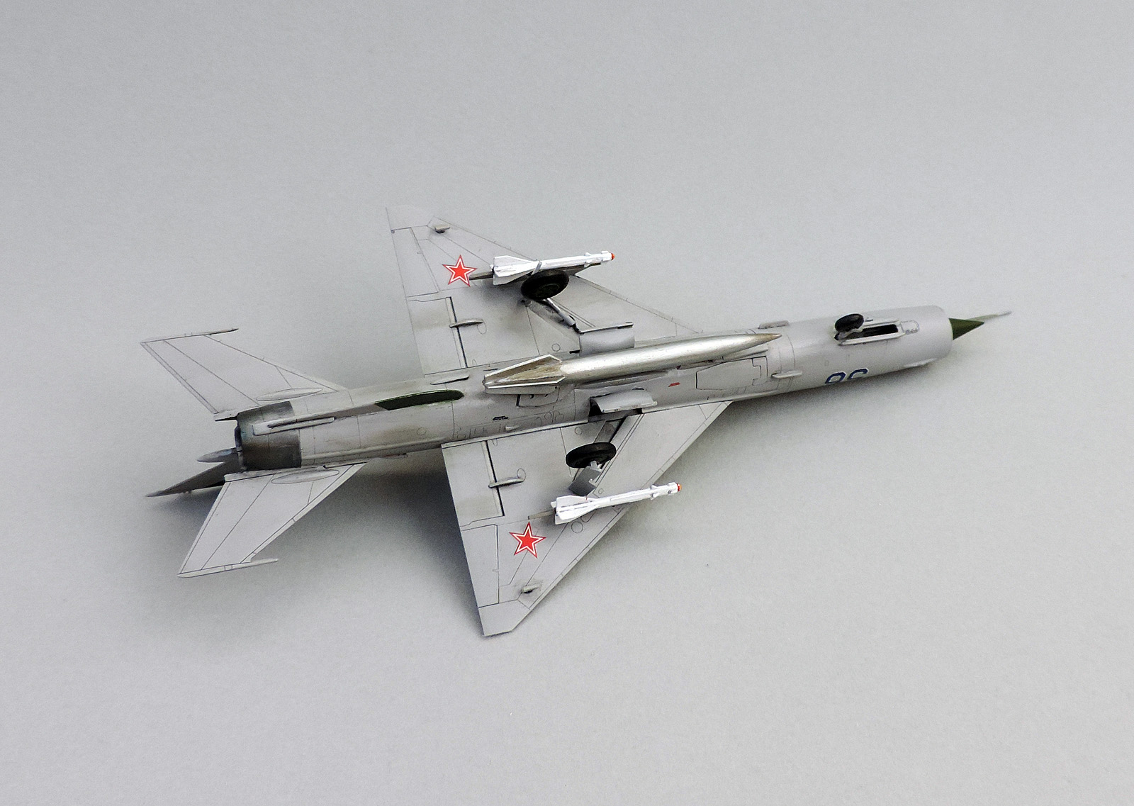 В любом случае - работа сделана хорошо, облик 21-го передан, а по "подвеске"....Она реальна - т.е. такое могло использоваться.А это уже ваш выбор - как автора : в каком виде аппарат будет стоят на "домашнем аэродроме".