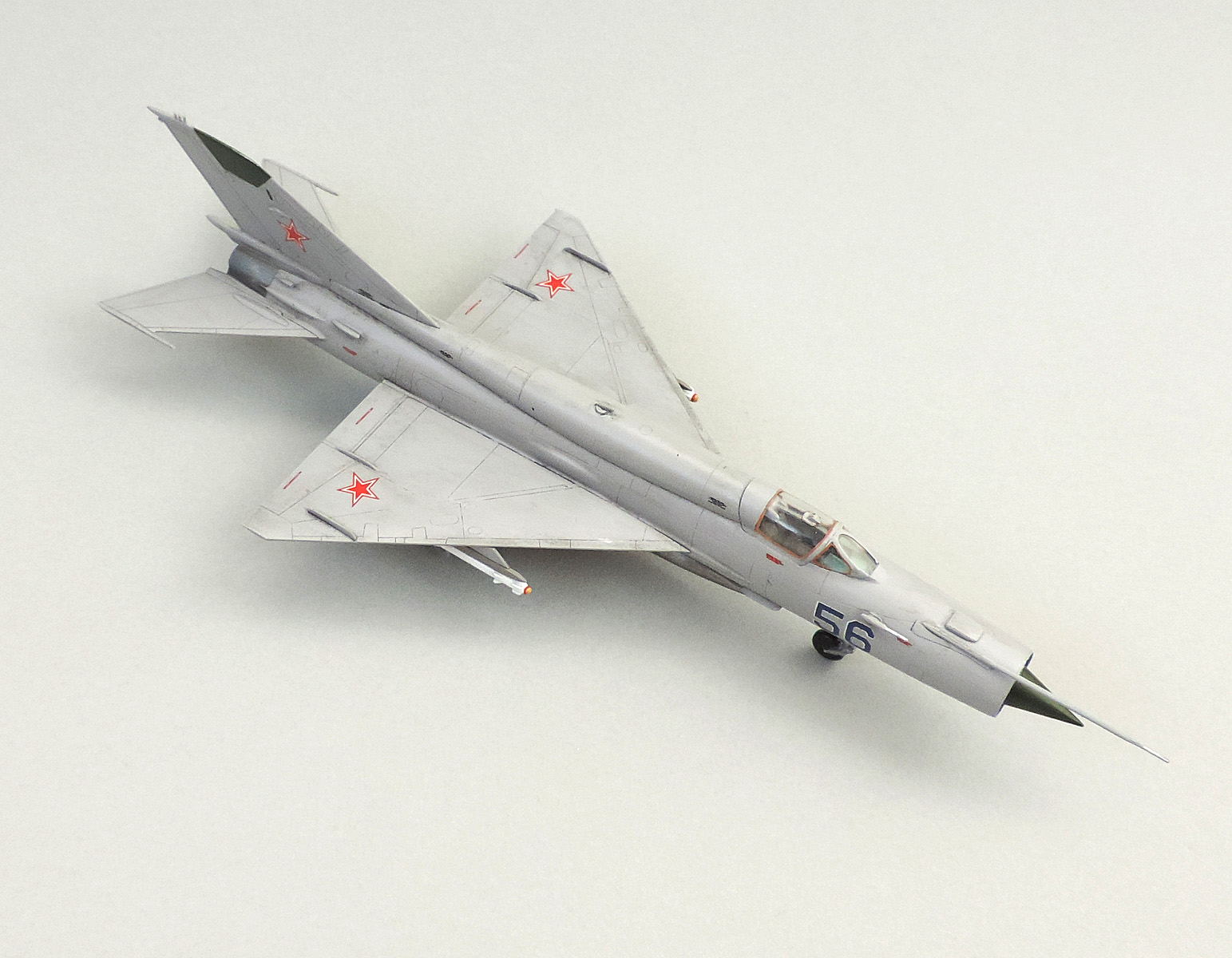 Георгий, спасибо большое, очень Вам рад! По подвесками долго писать но постараюсь! В большей степени все из-за того, что в наборе только две Р-60. Вешать устаревшие малоэффективные Р-3 не стал, хотелось именно в варианте бойца сделать. Эти ракеты ограничивают носитель по перегрузкам до 5ти единиц, тогда как Р-60 ограничений не имеют, разве что по пуску. Получается, что при таком варианте подвески 21ый, выбрав все топливо с ПТБ в ближнем бою избавится от него, и получится, что его тяговооруженность будет близка к единице. Ведь только две малоразмерные Р-60 сильно его не нагружают, зато, как минимум, это даст ему преимущество в разгоне и скороподъёмность перед его главным и более совершенным врагом НАТО- F-16( конечно, только в том случае, если последний даст ему приблизиться на дистанцию ведения БВБ). Конечно, это всего лишь сценарий, и F-16 был бы в ранних модификациях, но все же это дало бы шанс побороться, а не быть пушечным мясом.