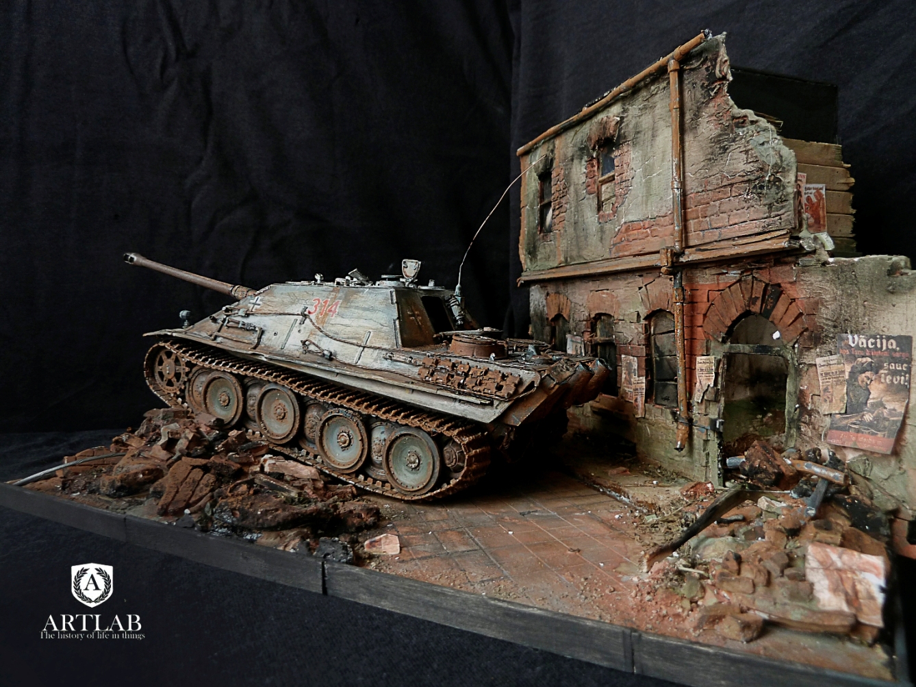 Стартовая версия этой работы была забыта пару лет, пока в том году я не занялся картиной заказанной мне к 70летию великой победы. Пролистывая хронику я натыкался на интересные снимки улиц и техники в городских боях и решил дать второй шанс этой диораме. Так она обросла руинами и обломками, стеной, по стенам я решил расклеить агитплакаты, газеты, мне кажется это придало колорит работе. Позже склепал "кошку": PzKpw V Ausf G2 "Jagdpanther". Многое, из того что задумано было (люки, сливные отверстия, воронку и т.п) я так и не смог воплотить из за конфигураций, ранее заложенных в диораму.