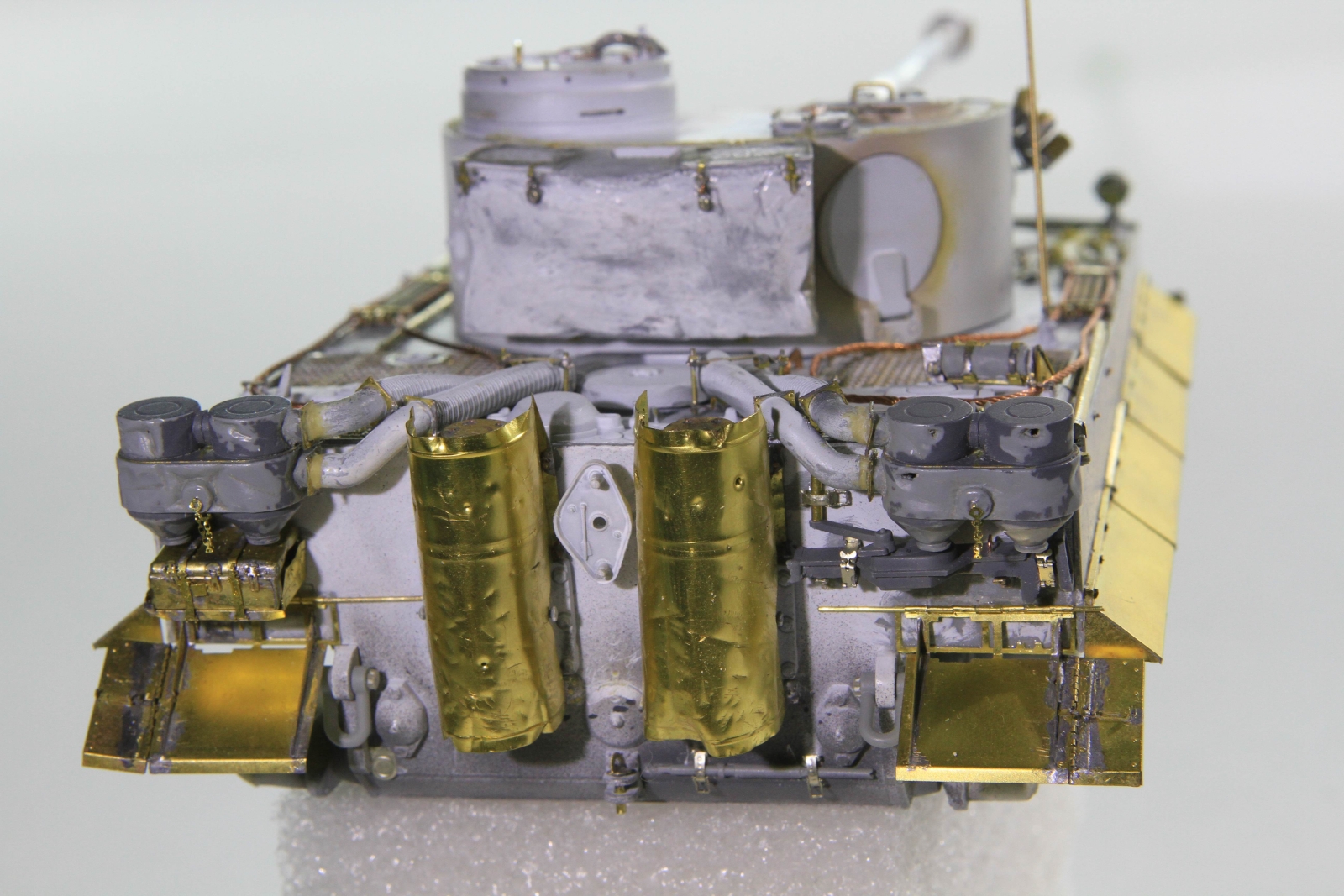 Всем привет. Собрал свою первую модель до стадии покраски. Так как в прошлый раз после грунтовки практически собранной из коробки модели стал все переделывать и добавлять фототравлением, то в этот раз перед покраской хотел бы послушать мнение экспертов по матчасти и в целом по косякам на этой стадии. Прототипом послужил 131 бовингтонский тигр.