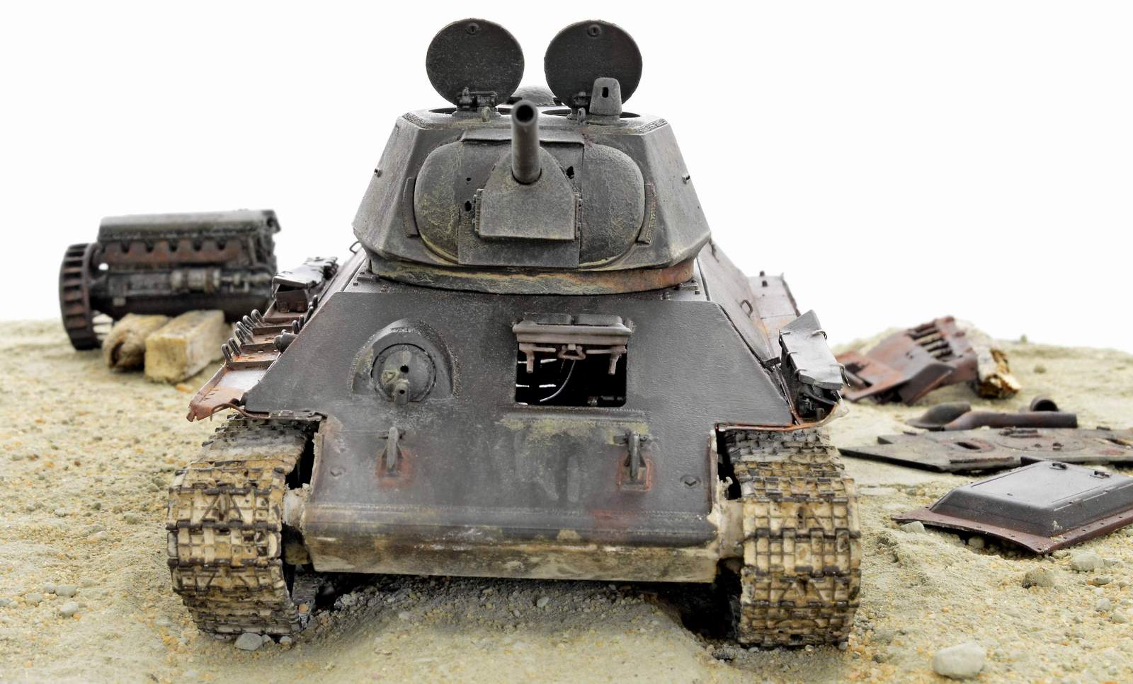 Разумеется - какая задача поставлена, такую и нужно выполнить. Как бывший авиа- и ракетомоделист, знаком с положениями оценки прототипа по части копийности. И еще одно. Очевидно, что частично разбирать танк, сразу после вытаскивания его на берег, ни к чему. Поэтому, вопрос - была ли мысль на предмет имитации другой окружающей обстановки (ангар, цех и т.д.)? Нет! Претензий к имитации того, что на диораме, нет. Просто, невольно возник вопрос.