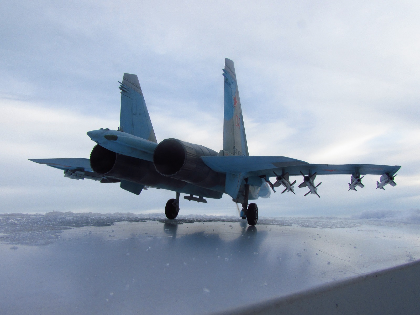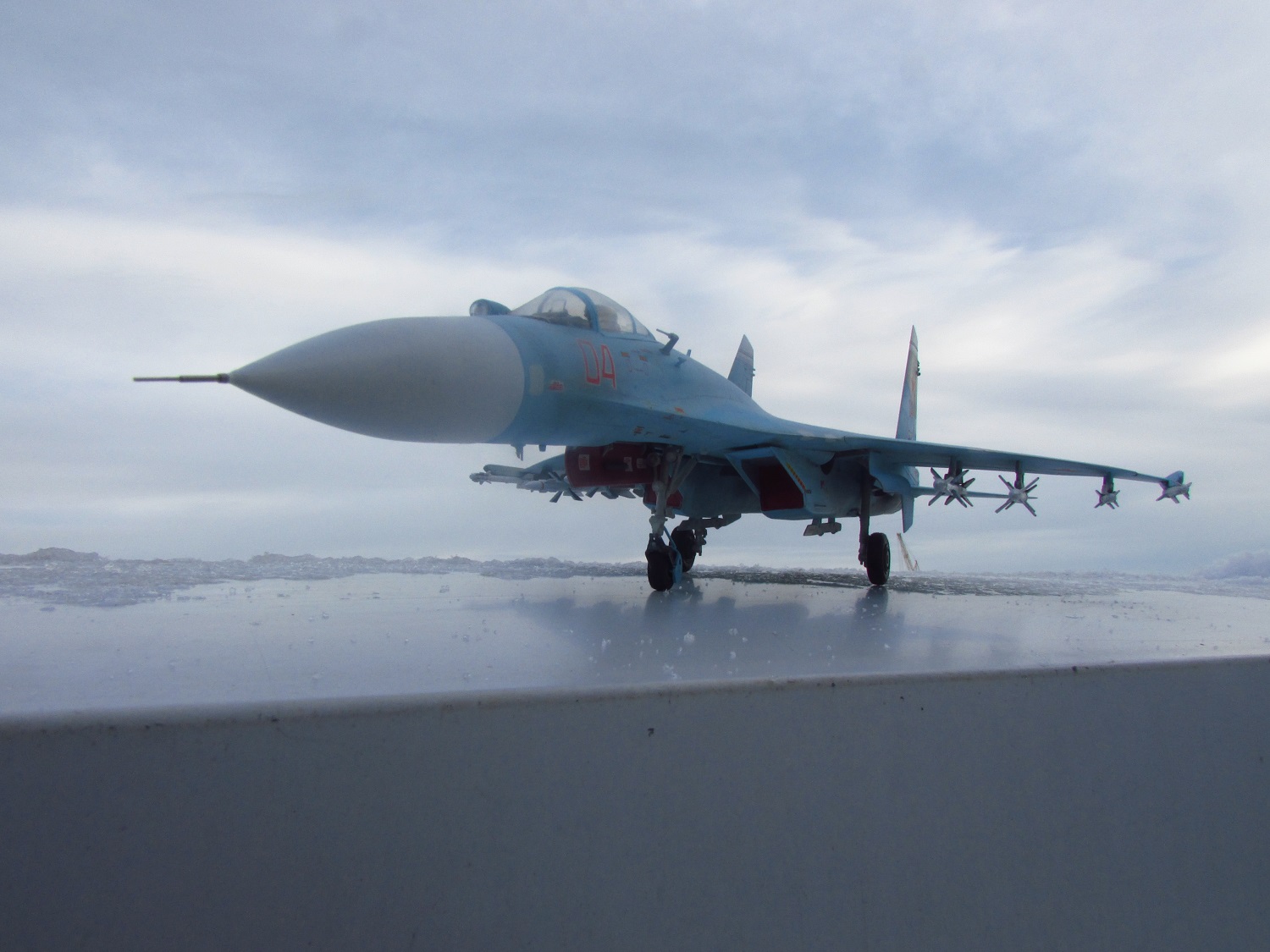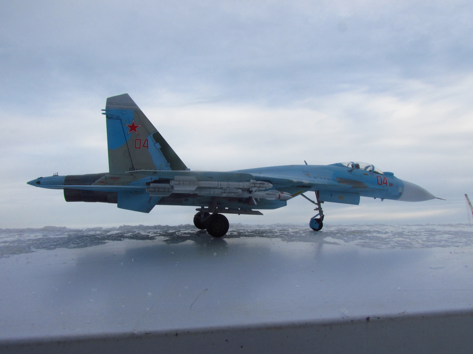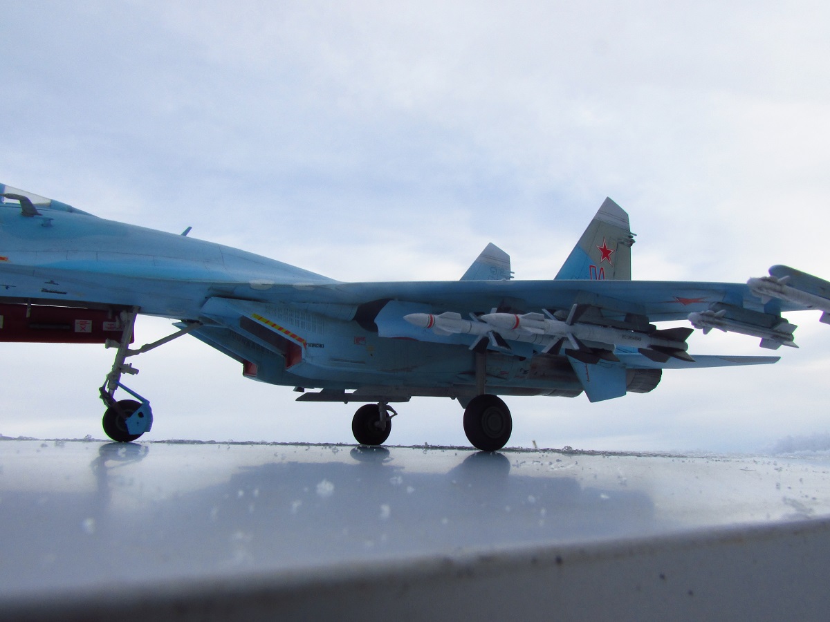 Коллеги , сразу скажу-модель по мотивам , без привязки ни к какому борту , скорее тренировка и набивание руки , и впервые сам учился красить аэрографом , да и работа была в августе 2014 года . Количество ракет и их подвеска не ставилась целью все сделать правильно , а лишь бы навесить . ВЗ закрыл , а сопла оставил открытыми , что не делается на аэродроме . Пневматики не пожалел и поставил резиновые , оживляет действительно . Камуфляж - первый опыт . Резервные пвд заменил на тонкие иглы . Штыри антенны "свой-чужой" из проволоки , точнее из телефонного провода "полевика" . В общем-свои косяки на сегодняшний день уже знаю более чем достаточно . Полезная критика и советы типа можно было сделать так , и я сделал бы вот так , которые могут пригодиться - только приветствуются . И за фото тоже особо не ругайтесь , так как долго еще думал показать работу или нет , других нет . Да , и еще : после декалей и покрытия глянцем , когда заливал в швы тамиевскую жидкость для панельных швов , при стирании излишков попортилась краска , ну в общем это в силу плохой окраски видимо и отсутствия какого-нибудь опыта . В общем все .