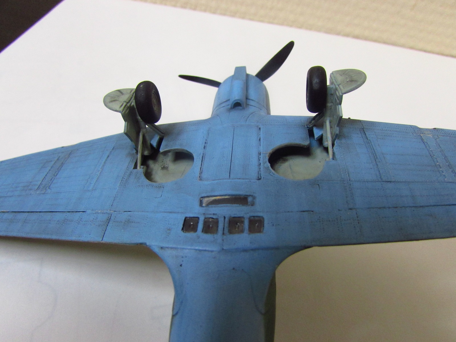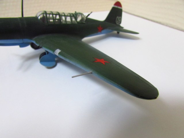 Из недостатков - "загнувшаяся" назад антенна, сильно торчащие стволы крыльевых ШКАСов, что-то странное с нишей убирающегося хвостового колеса(походу колесо смещено сильно назад, а должно был крепиться к шпангоуту).