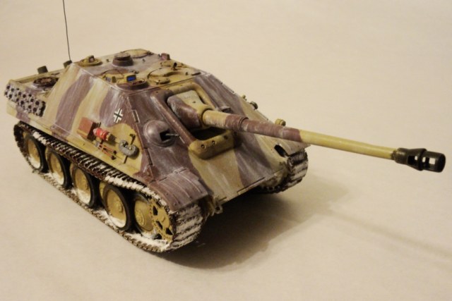 Истребитель танков "Ягдпантера" был разработан в 1943-44 г.г. на базе среднего танка Т-V "Пантера". Мощное лобовое бронирование, отличная оптика, знаменитая танковая пушка калибра 88 мм и, пожалуй, самое главное - высококвалифицированный экипаж делали эту машину весьма опасным противником. Всего за время войны немецкая промышленность выпустила 392 истребителя танков данного типа. Они с 1944 года использовались в тяжелых истребительно-противотанковых частях и являлись лучшими немецкими машинами данного класса.
