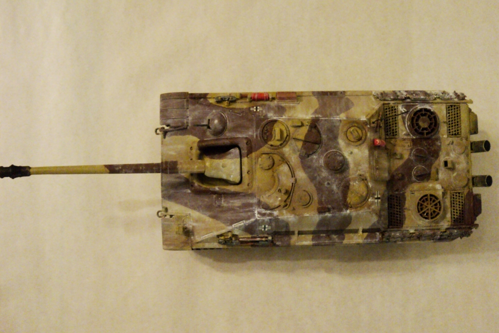 Некоторые особенности - характерная маска с 8 болтами и составной ствол орудия, форма приборов наблюдения, наличие тепловых экранов вокруг выхлопных труб, отсутствие циммерита - позволяют отнести эту "Ягдпантеру" скорее к машинам типа G1, произведенным в октябре-декабре 1944 г.