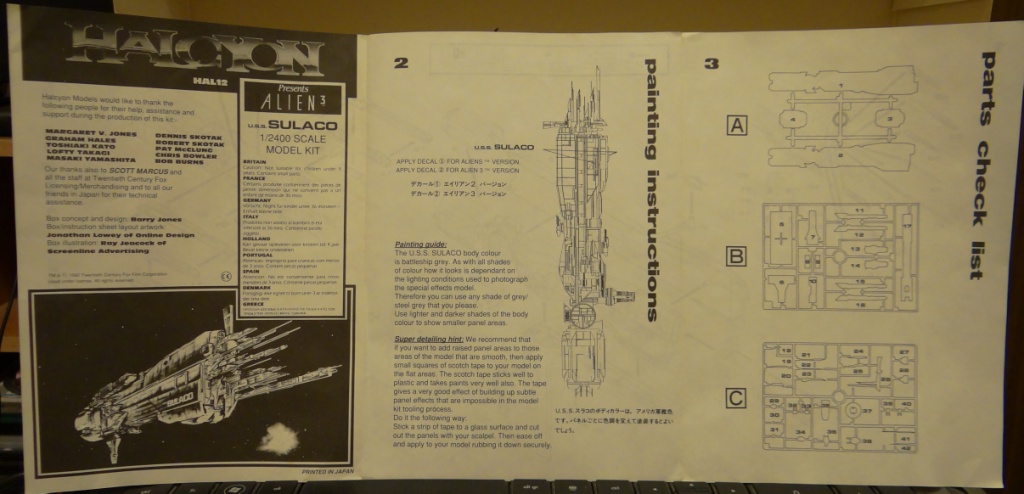 Приветствую Вас дорогие Каропчане. Продолжаю тему серии ALIENS и представляю вашему вниманию модель от HALCYON- космический корабль SULACO. В картонной коробке нам предлагают: инструкция, 3 литника серого цвета и листочек декалей. Декаль немного пострадала, испачкали чем-то, но думаю можно будет восстановить. Утяжин не обнаружено, облой имеется, но не такой, чтоб падать в обморок. Деталировочка хорошая, не идеал, но и не г...