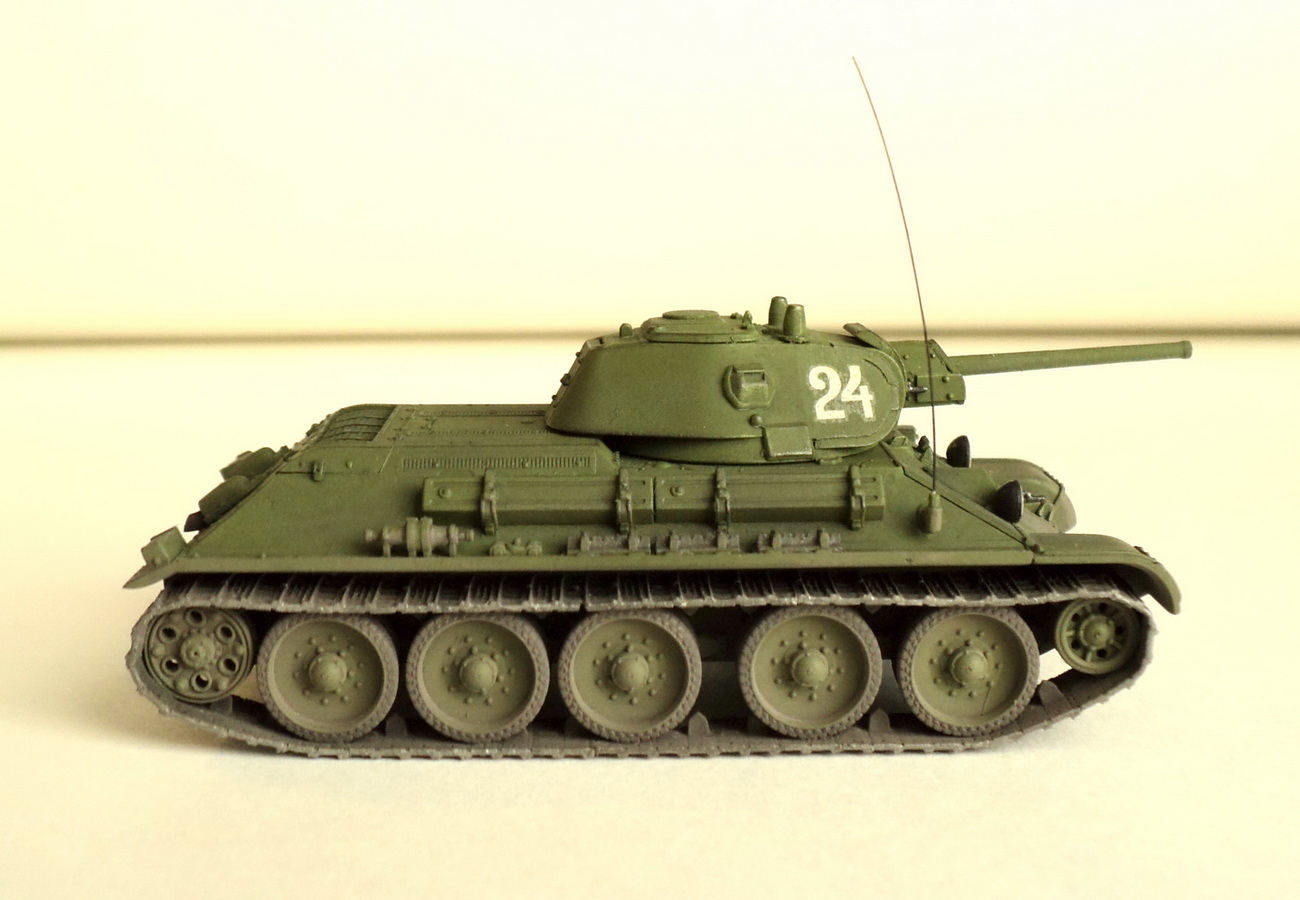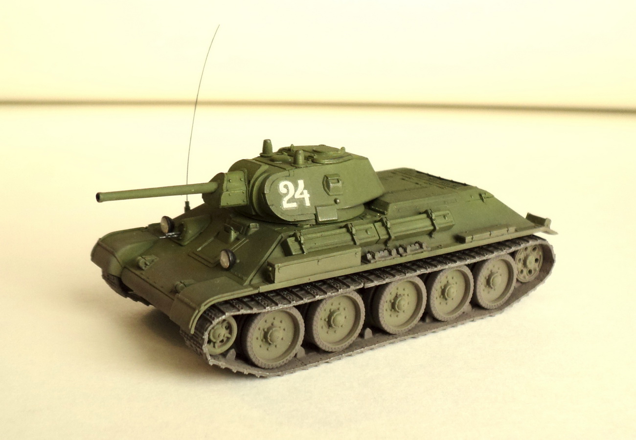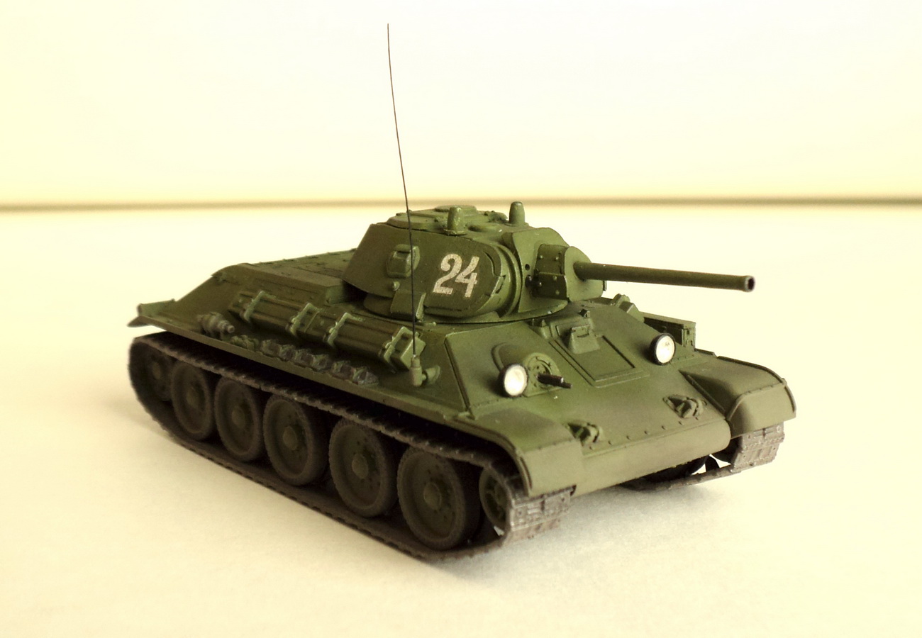 Известная модель Dragon, которая является отличной альтернативой модели от UM. Сборка изкоробочная и протекала легко. В обзорах на зарубежных сайтах в комплекте должны были быть гусеницы раннего типа, но мне попались поздние - вафельные. В связи с этим были куплены смоляные гусеницы OKB Grigorov, но качество этого набора было не очень хорошее - более-менее справился с ними. Также заменил фары на Elf.