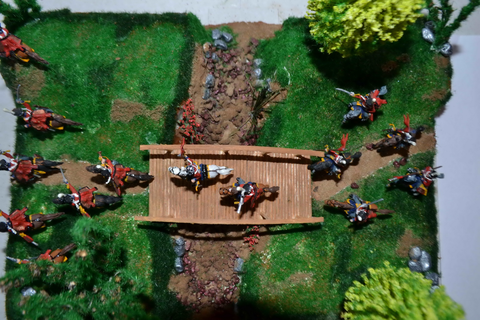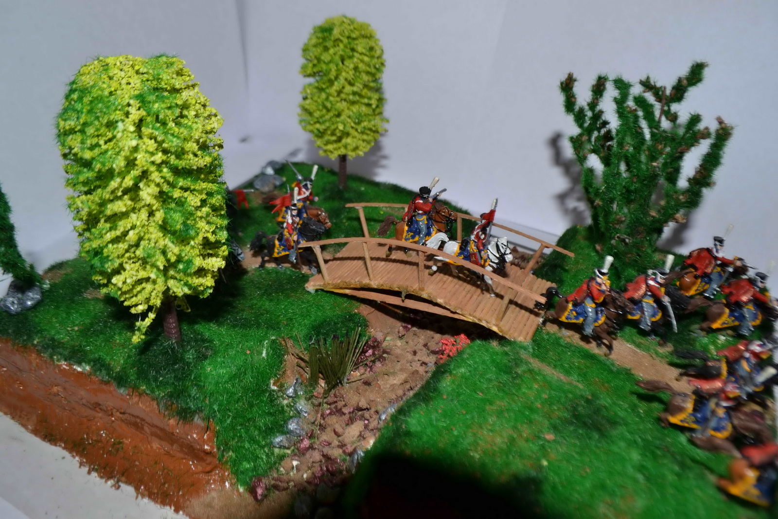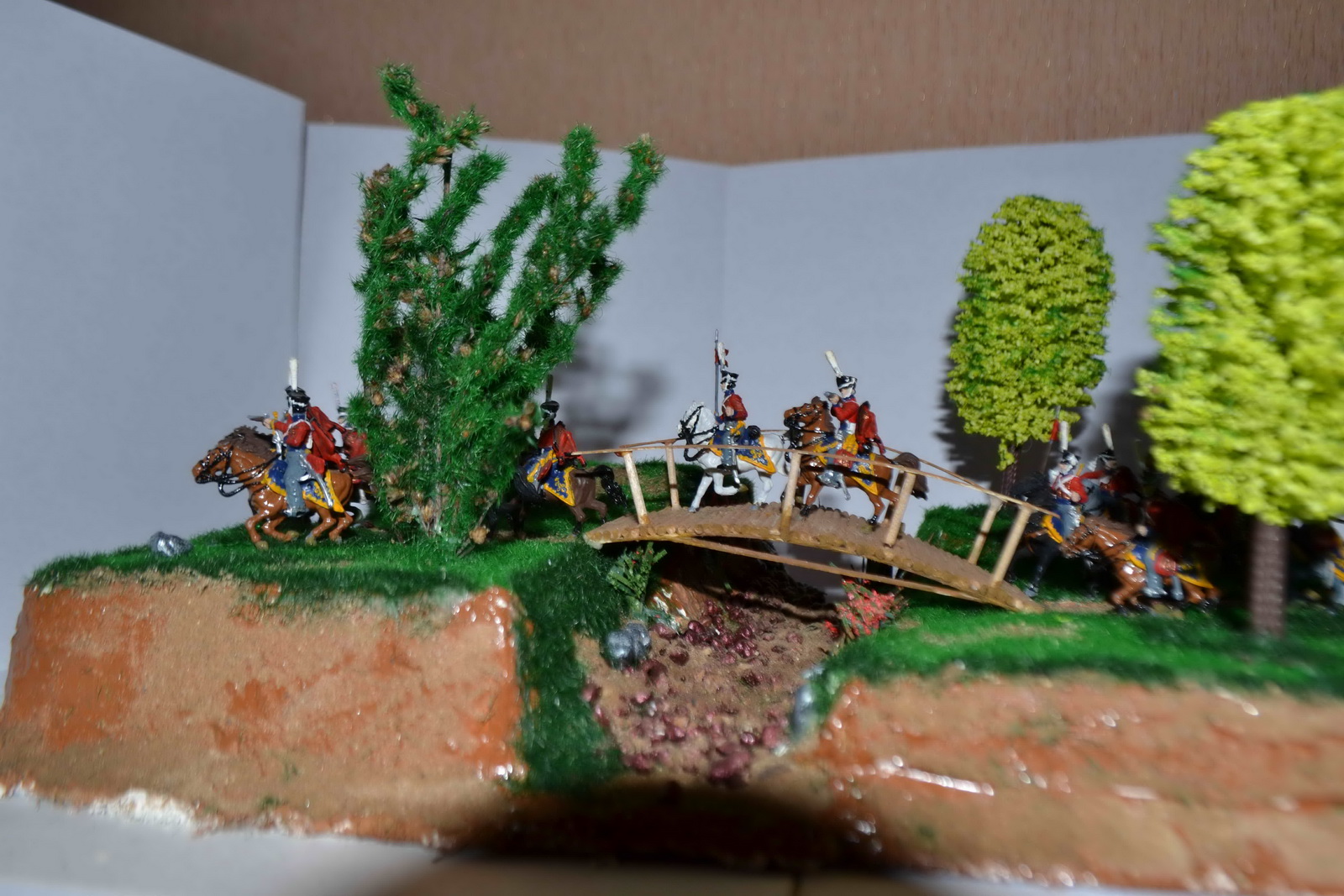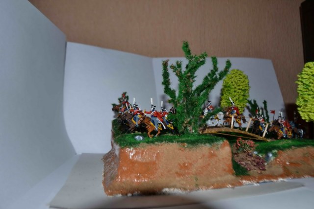 Интересная задумка, но есть недочеты: про яркость зелени уже сказали, мне кажется над композицией стоило бы больше подумать. Для стремительности конницы не хватило места.Возможно стоило сделать основание уже и длиннее, тогда конники логичнее выстроились бы в линию, а не висели кучей на краю диорамки. Несколько закрываю боковые виды высокие деревья.