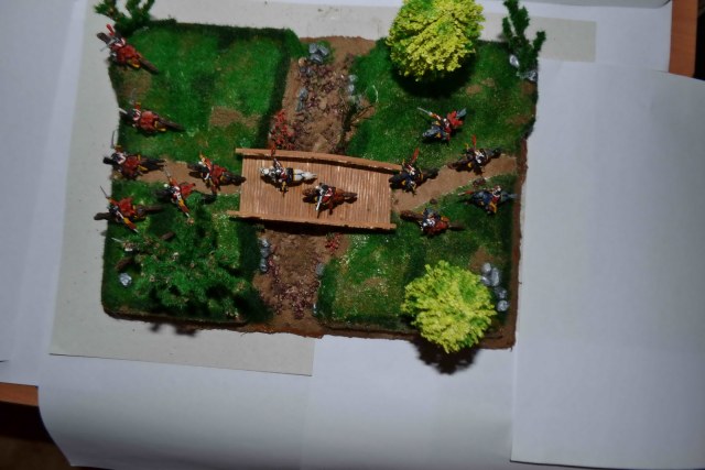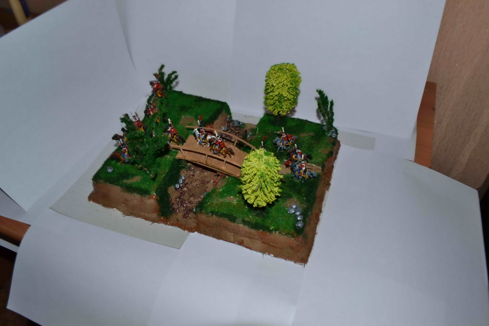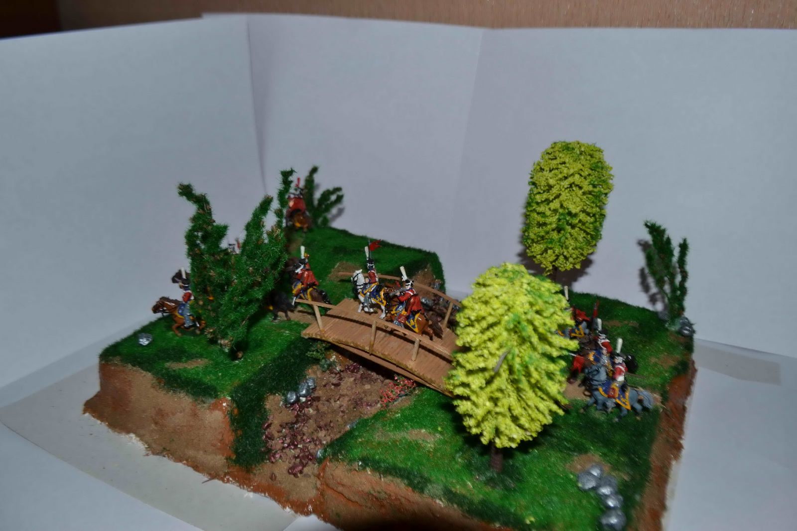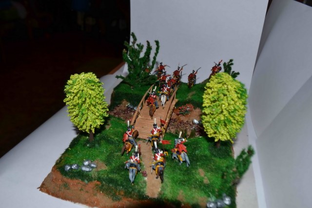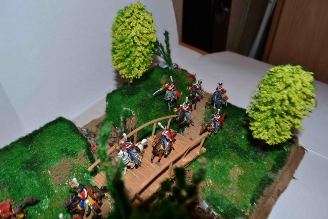 С почином!Все очень очень блестит. Так и у меня было в первой диораме. Прямо стиль один-в один))) Тут много мастеров было по наполеонике, но в последнее время что-то и не слышно их. По исполнению, типичная ошибка при росписи в первый раз это окраска фигурок в один цвет. То есть без затемнений во впадинах и высветлениях на выступах. В овраге водицы бы добавить. Дерево самодельное не очень получилось, если честно. А так достаточно аккуратно.