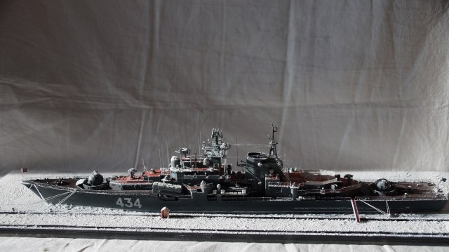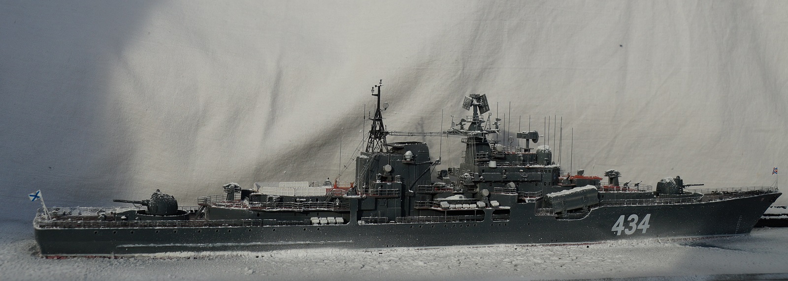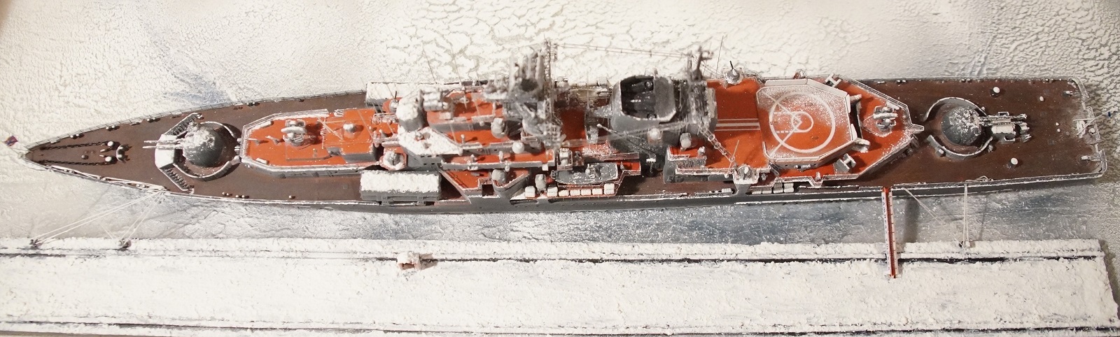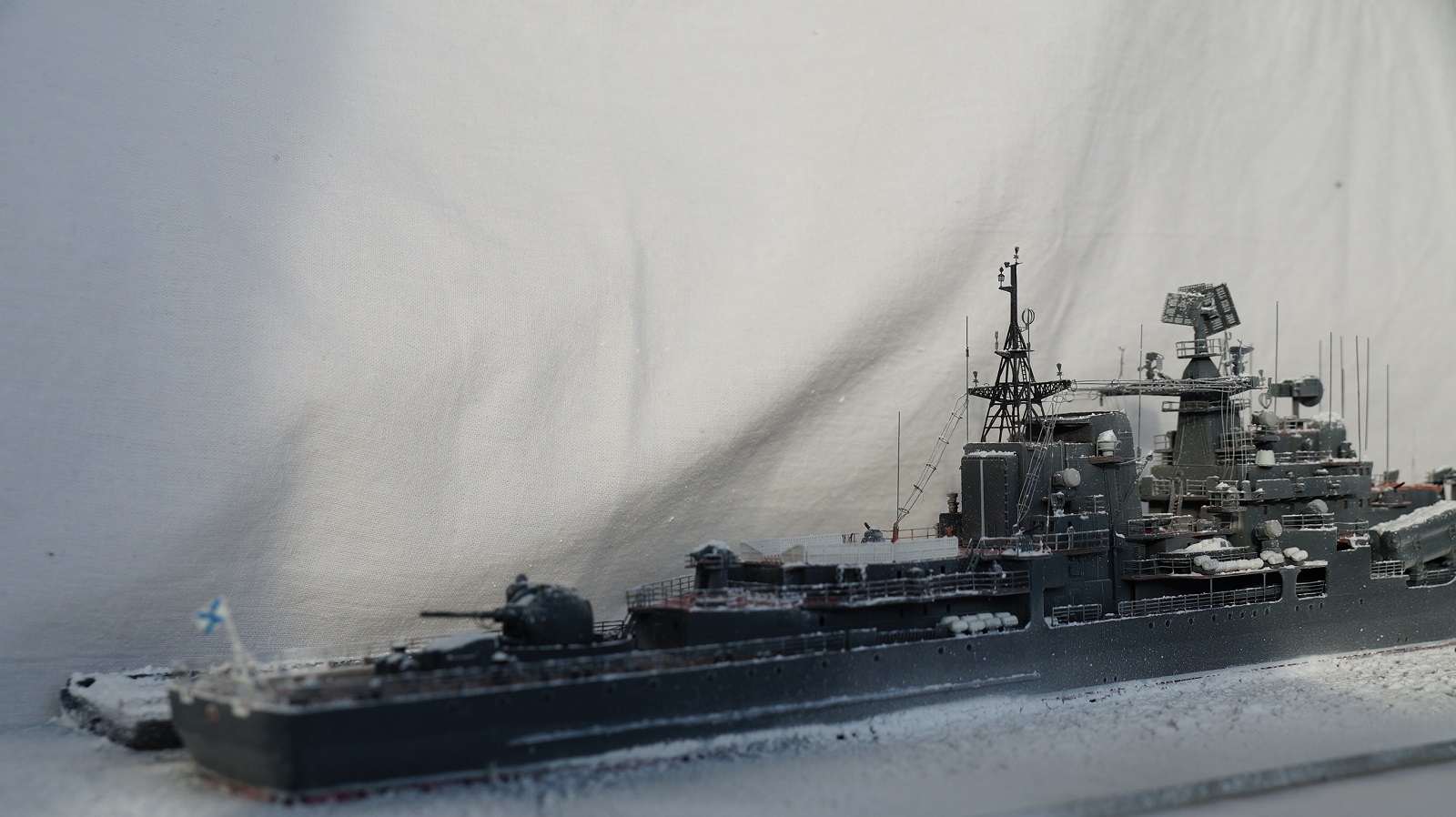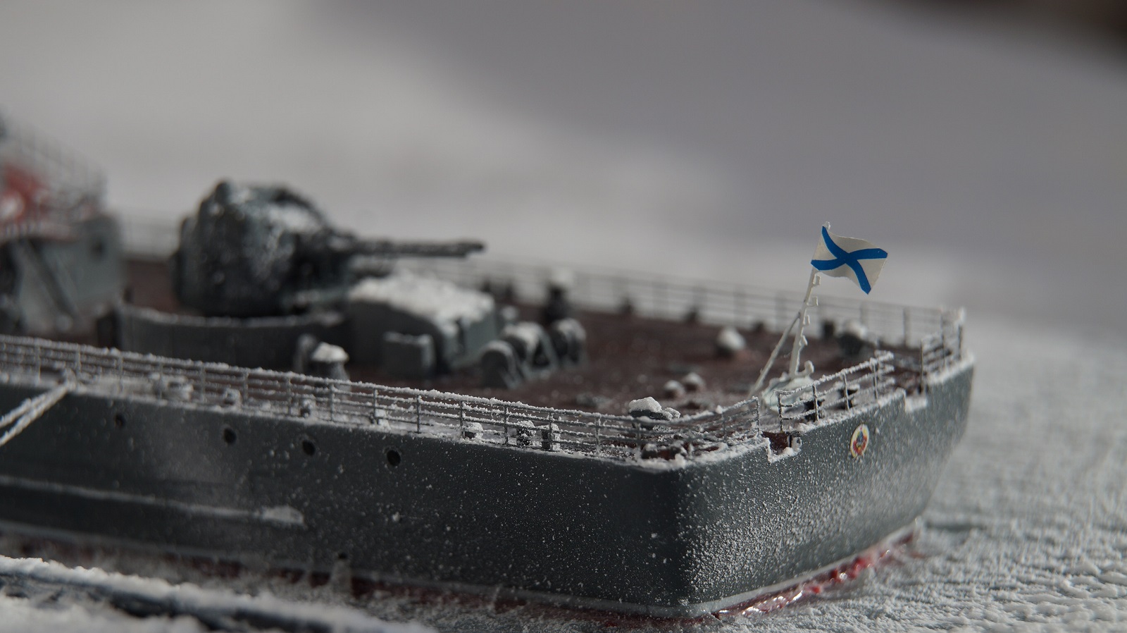 Очень удачно получилось замучИть модельку. Стылый металл обжигает глаза. Мне кажется, что корпусу не хватает таких же снежных крапинок, как и на трубе (очень живописно). На четвёртом фото только кольцевые антенны выдают "ненастоящьность" снимка. Не понравились якорные цепи, великоваты, да и укладка у них "парящая над палубой"- вес не чувствуется. Мат. часть не знаю, потому не оцениваю. За сборку, на мой взгляд, 90-92 балла. За окраску и художественность 95 баллов. Галерейно получилось.