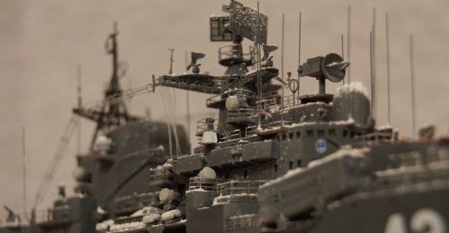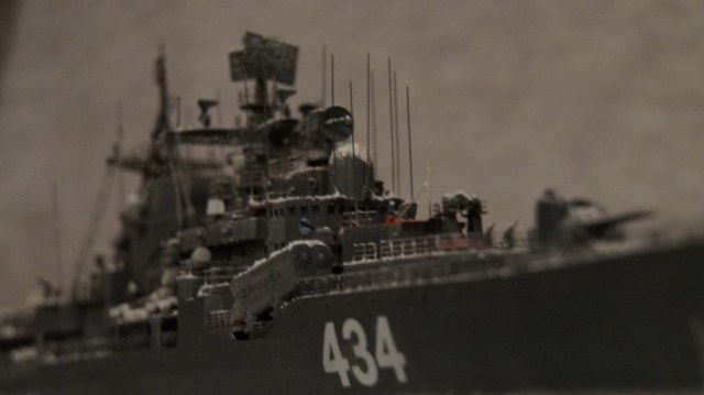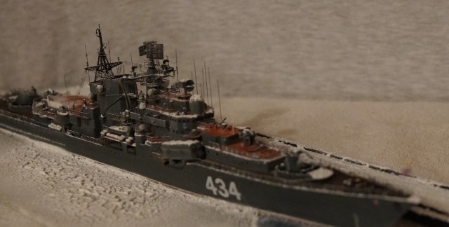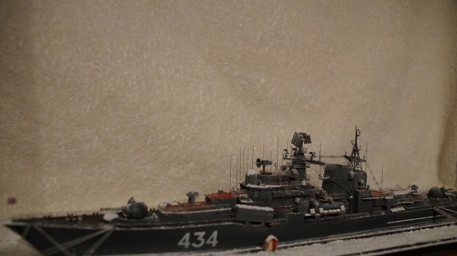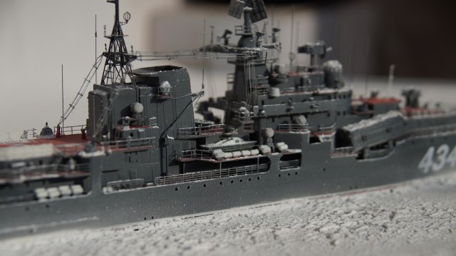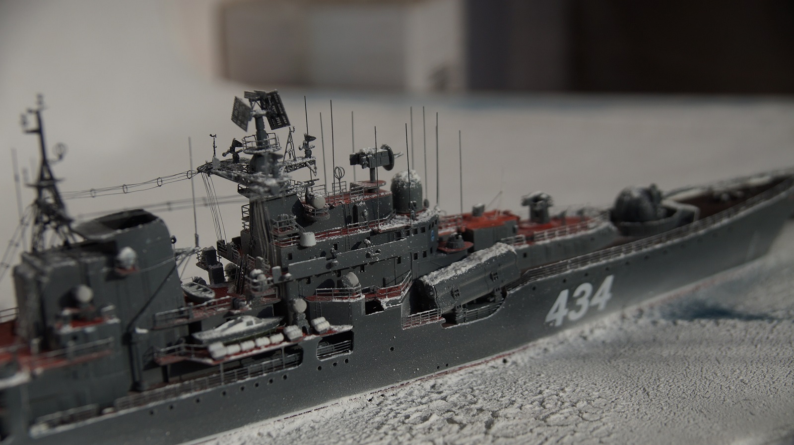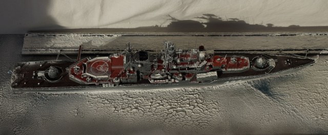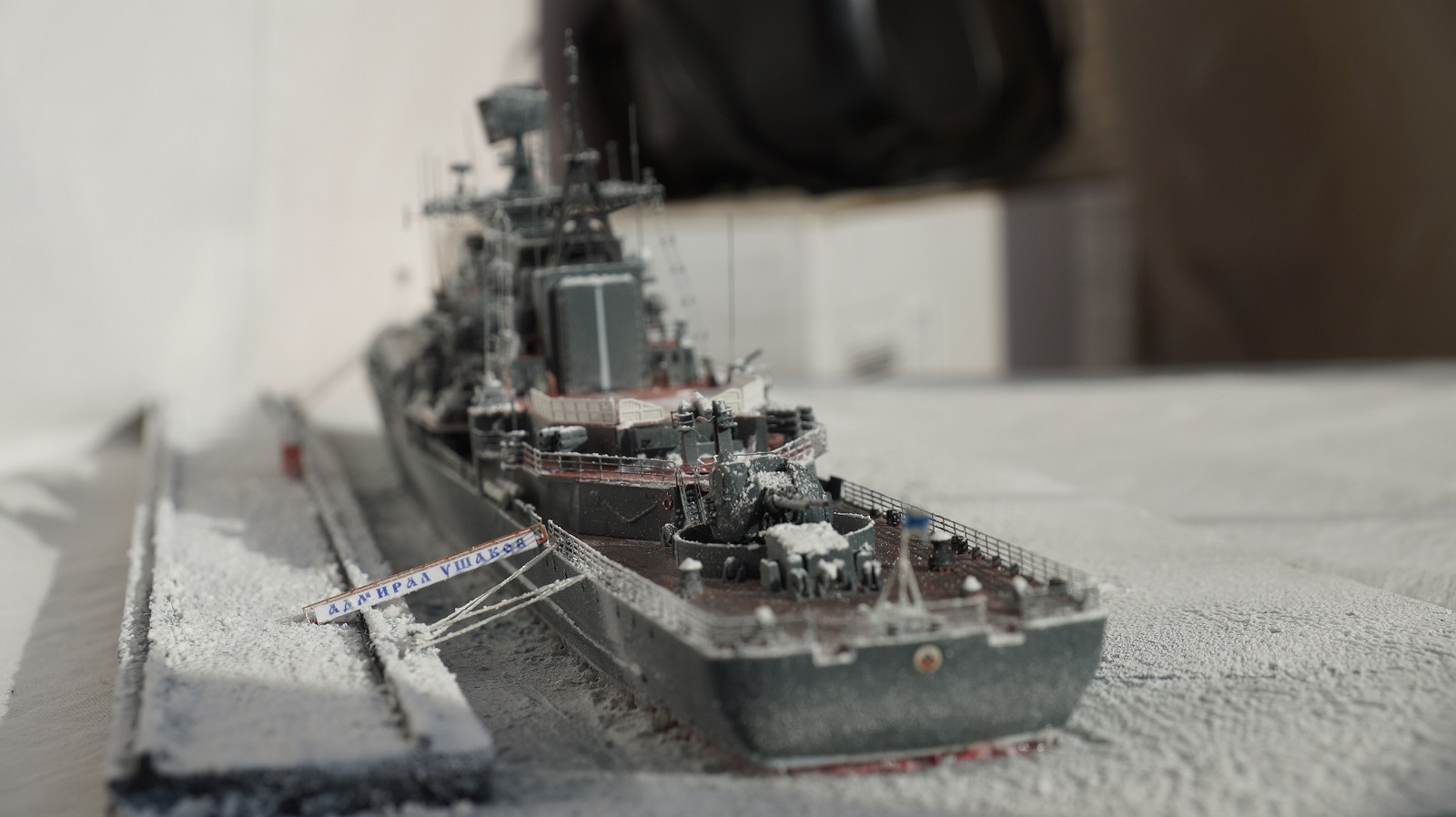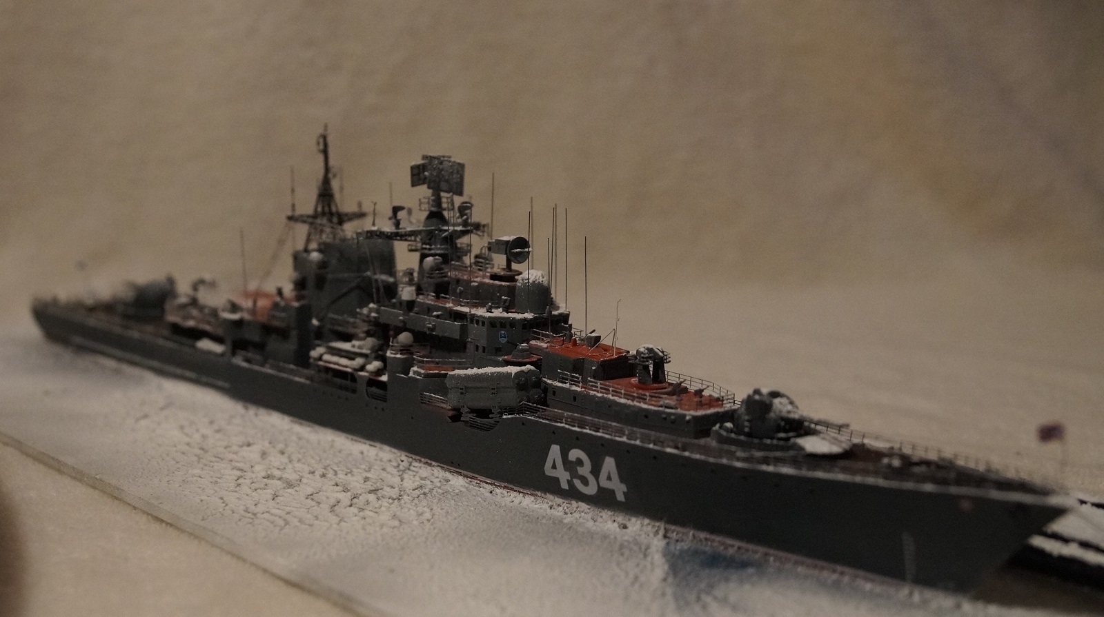 Очень удачно получилось замучИть модельку. Стылый металл обжигает глаза. Мне кажется, что корпусу не хватает таких же снежных крапинок, как и на трубе (очень живописно). На четвёртом фото только кольцевые антенны выдают "ненастоящьность" снимка. Не понравились якорные цепи, великоваты, да и укладка у них "парящая над палубой"- вес не чувствуется. Мат. часть не знаю, потому не оцениваю. За сборку, на мой взгляд, 90-92 балла. За окраску и художественность 95 баллов. Галерейно получилось.