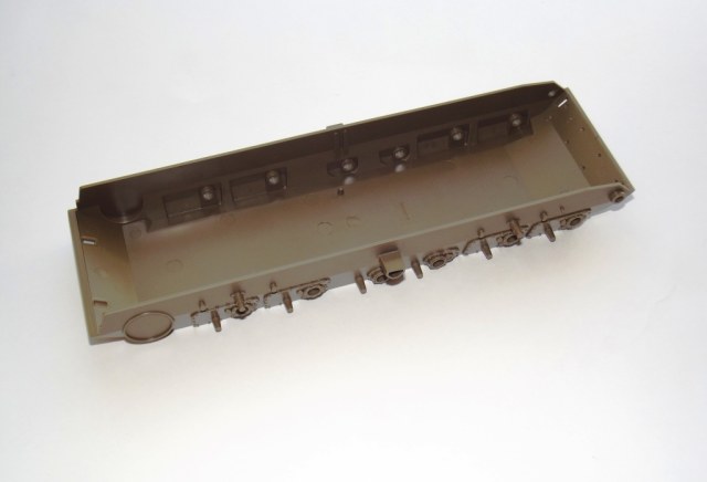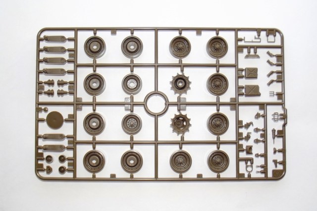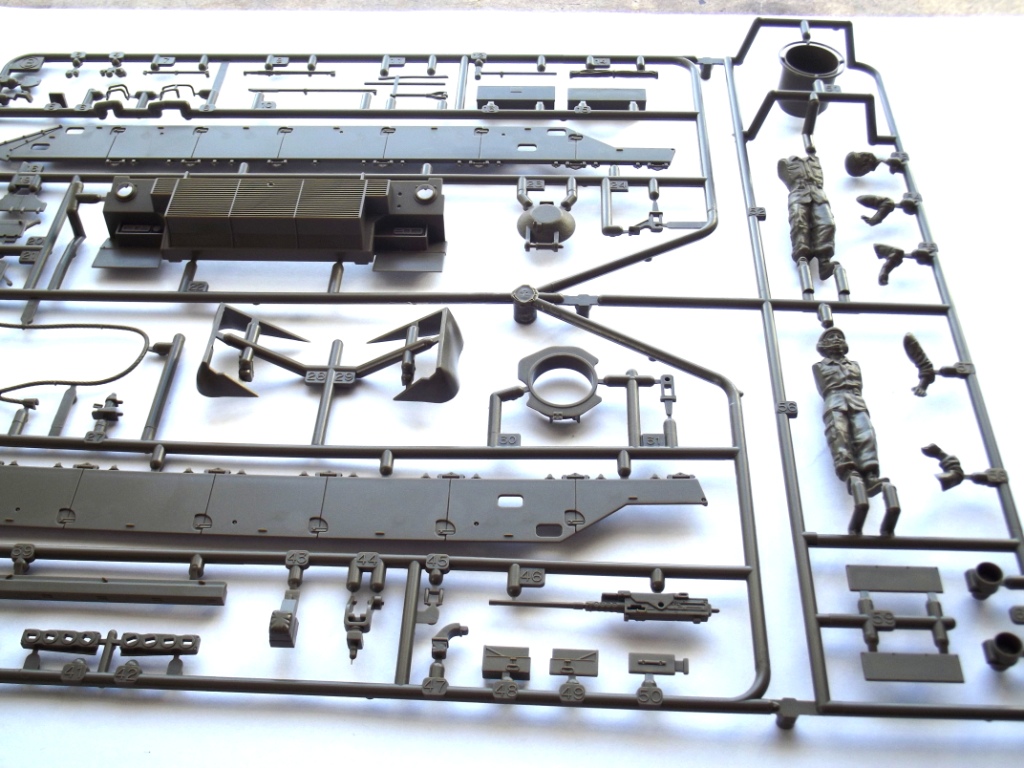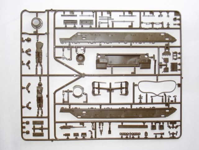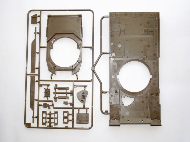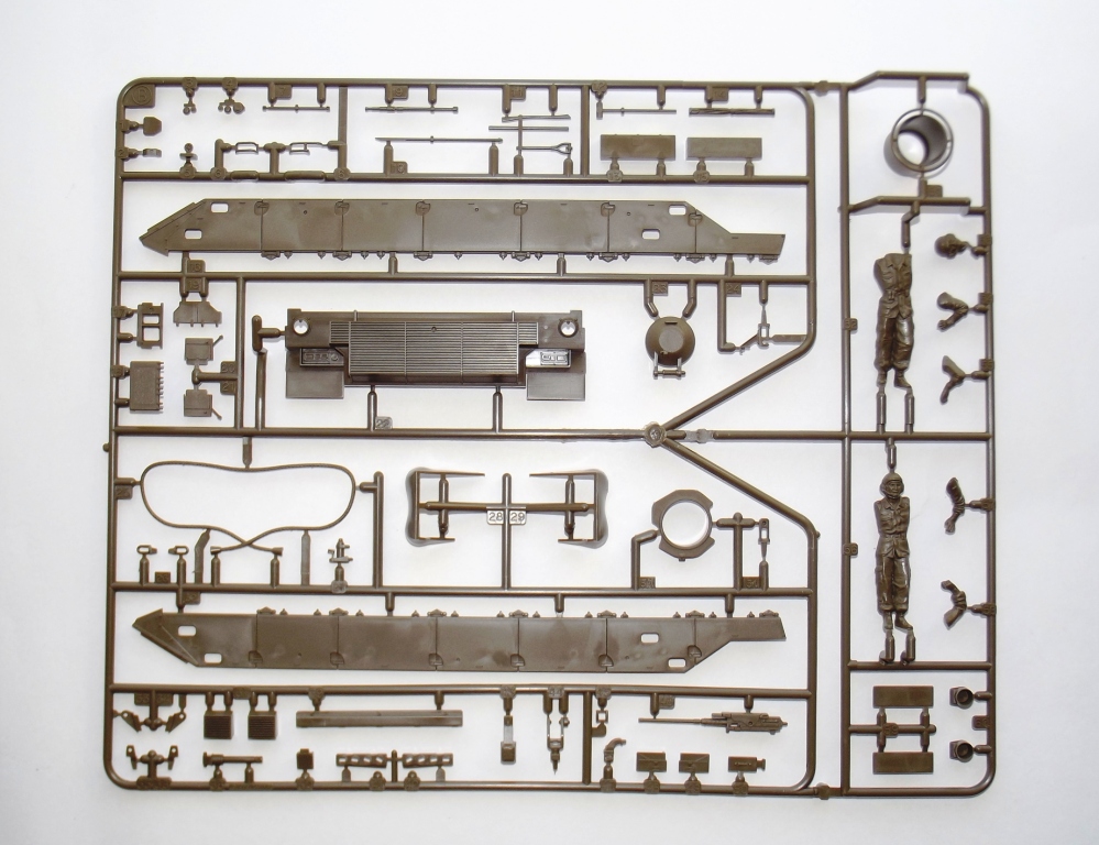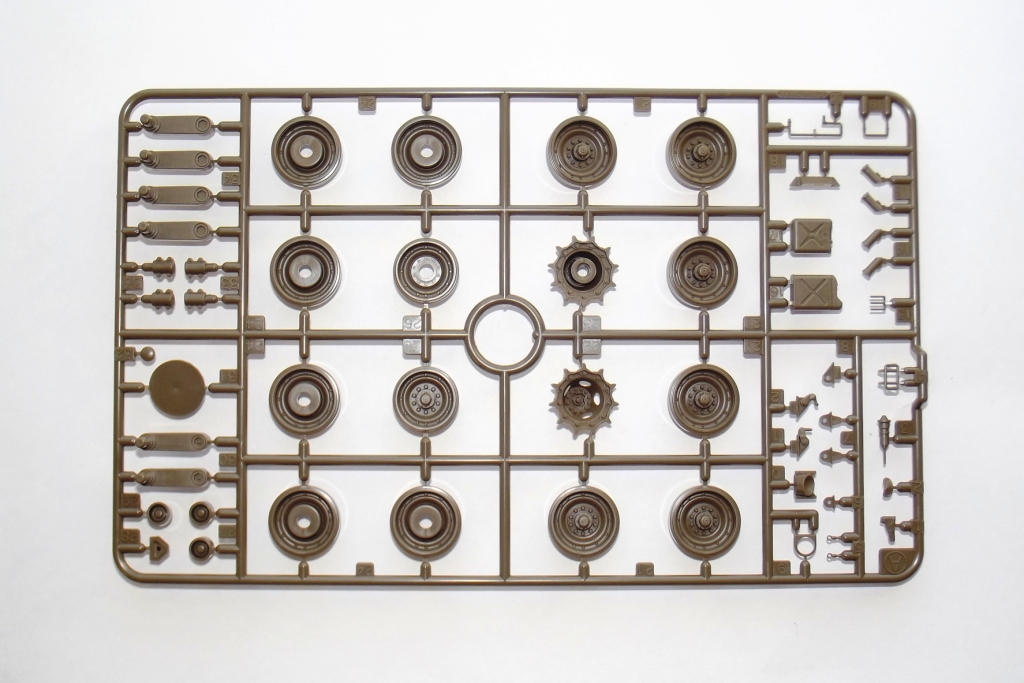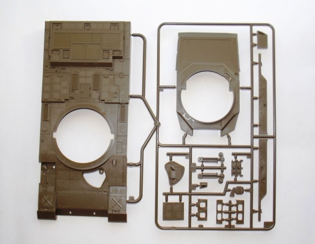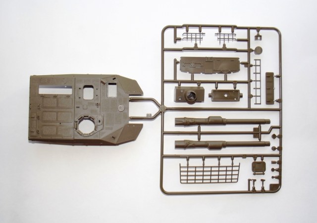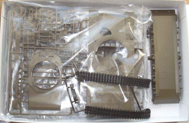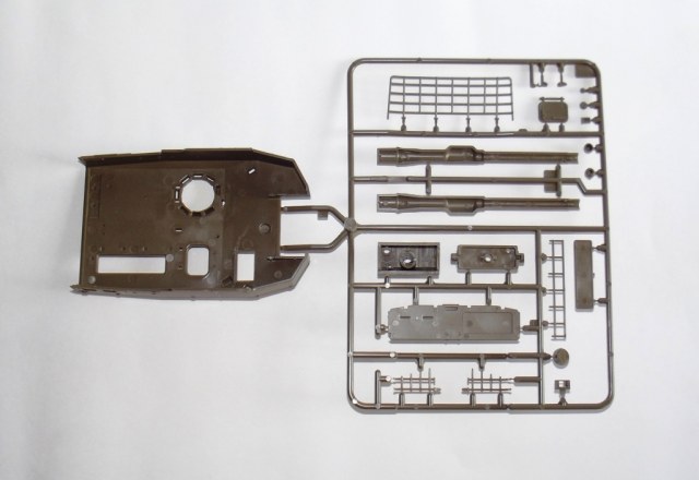 О модели; В коробке из тонкого картона, с верхней загрузкой, упакованные в отдельные пакеты находятся; ванна корпуса (места под моторчик отсутствует ))), пять литников зелёного цвета с деталями танка, из них два одинаковых с элементами ходовой. Литники из прочного пластика, хорошо детализированы, смещения пресс форм нет, утяжин не обнаружено, облоя практически нет, следов от толкателей не много и находятся на внутренних частях деталей. Одна виниловая планка с втулками для рабочей ходовой, что бы катки крутились. Одна прозрачная планка для стекл в оптике танка. Две резиновые (не виниловые а именно резиновые !) гусеницы с отличной детализацией. Дна подложка с декалями. Одна сетка для корзины сзади башни танка.