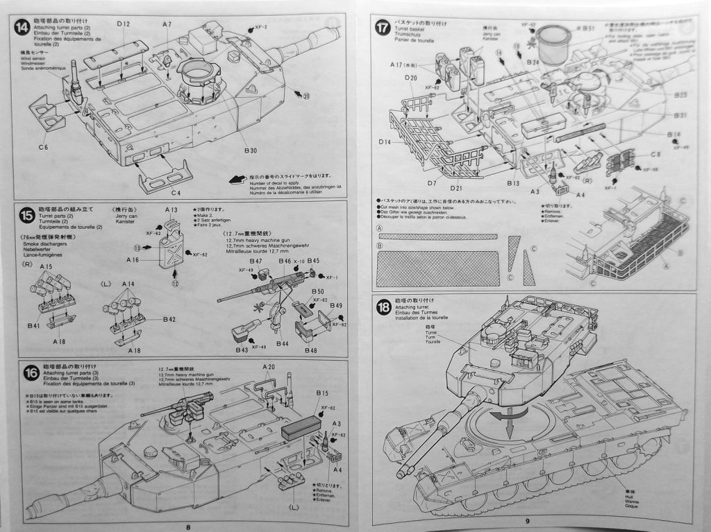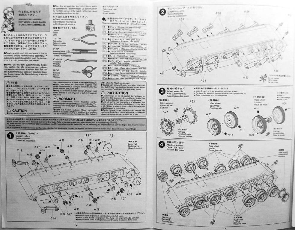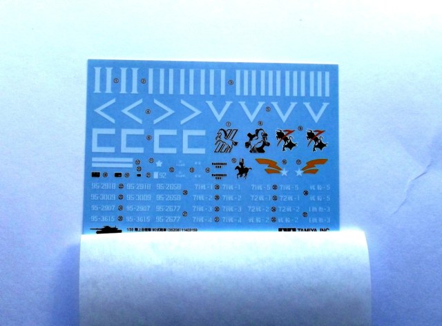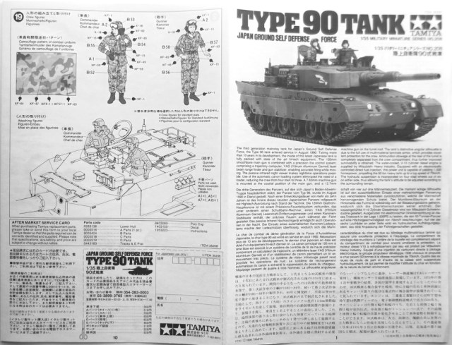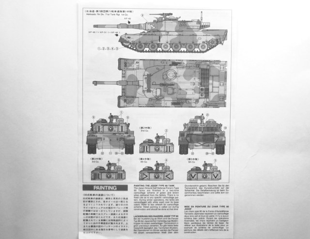 Так же в наборе присутствует один листок инструкции по окраске и маркировке танка, предлагается один вариант окраски танка и два варианта маркировки. Одна чёрно-белая инструкция на раскладывающемся листке по сборке танка на английском и японском языках, по картинкам всё ясно и понятно.
