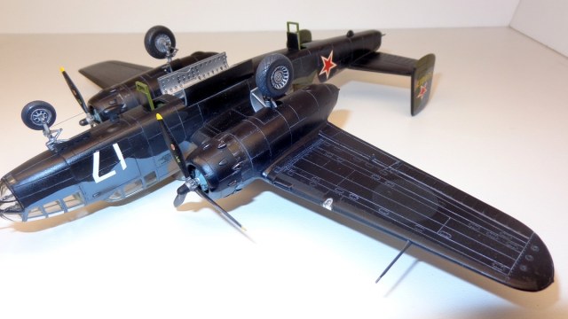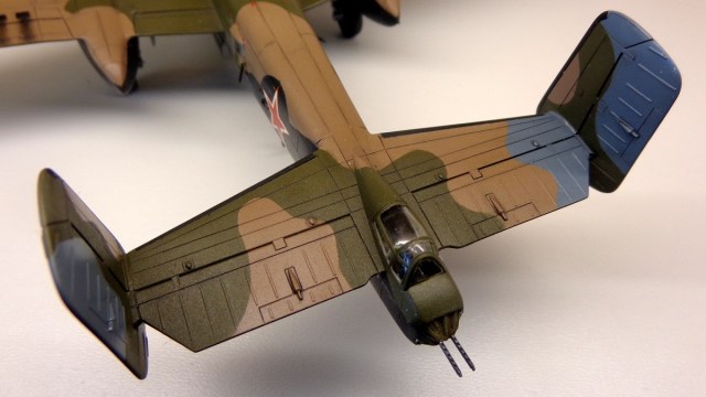 Про сборку модели я уже расказал http://karopka.ru/forum/forum189/topic20994/. В общем обычная для меня "искаропка", "без сусликов" как говорит один наш коллега. В силу своей криворукости и патологического неумения использовать ЛКМ, при попытке нанести глянцевый лак получил "шагрень", которую местами даже шлифовал шкуркой. Но более-менее модель получилась такой, какой и хотелось, в основном задача заключалась по возможности точнее передать американский камуфляж по "стандарту 407", специально разработанным для России, и учитывая детали конкретного облика "Севастопольского" №17. Я когда-то уже делал модель "италовского" В-25. Но с Хасегавой его рядом не поставишь, хотя итальянцы, например, и изобразили провис полотна на рулевых плоскостях. Кстати, модель довольно уверенно стоит на трех точках, использование "табуретки" предлагающейся производителем не понадобилось. Хотя вот основные стойки всё-таки немного "разъезжаются" из-за перегруза. Краски "Тамия", почти без "мешания" и АКАН для интерьера.