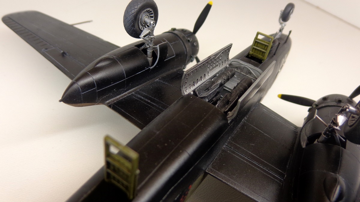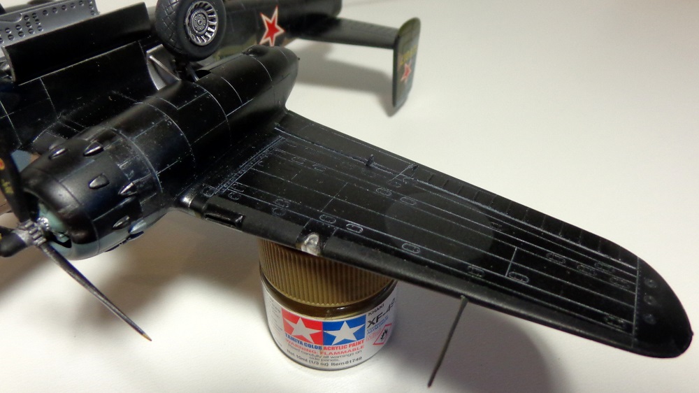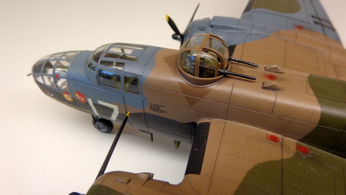 А вот логики с выхлопом - не понял. Насколько я понимаю в матчасти на этой модификации выхлоп был индивидуальный с каждого цилиндра - от того и куча выхлопных патрубков на капотах, в отличие от Б-25Ц с коллектором и одной выхлопной трубой. У вас же капоты за этими трубами почти чисты. Зато выход воздуха из маслорадиаторов на верхней части крыла - чёрный как моя жизнь...
