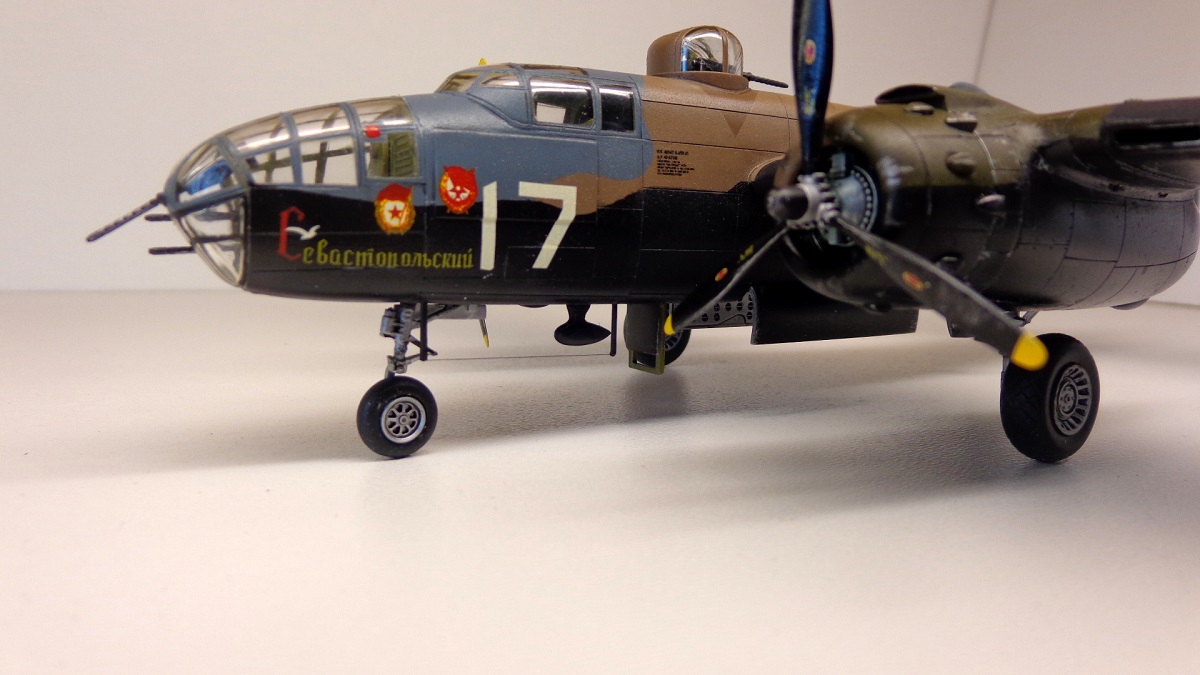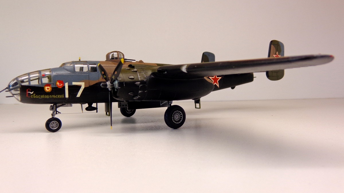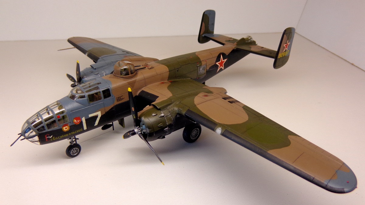 Сбылась, сбылась давняя мечта. Когда-то, ещё в 80-х появился у меня чешский журнал "L+K" с нарисованными на обложке В-25 с красными звездами и в необычном трехцветном камуфляже. Правда, чешский художник немного напутал в модификациях самолетов и цветах камуфляжа, но интерес они у меня вызвали большой. В 90-х появился журнал "Ас" со статьей Василия Вахламова про В-25 с надписью "Севастопольский" и номером 17 на борту. И только спустя много лет, сейчас, удалось всё-таки сделать модель этого самолета.